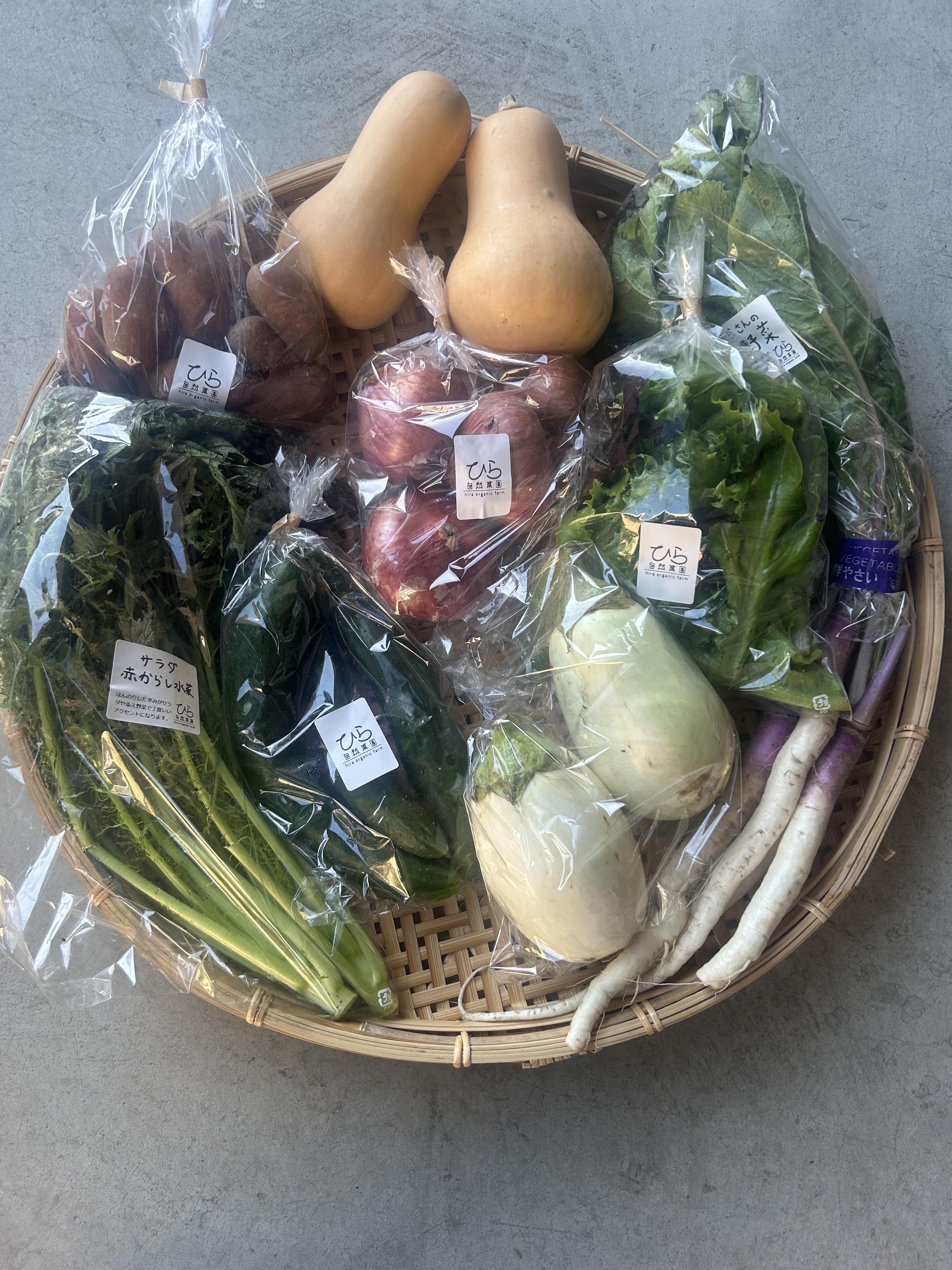 オクラ(エメラルド)、バターナッツかぼちゃ、じゃがいも(シェリー)、大根(紅三太)、サラダ玉ねぎ、とろーり旨ナス、ジャンボニンニク、日野菜、リーフレタス、からし菜