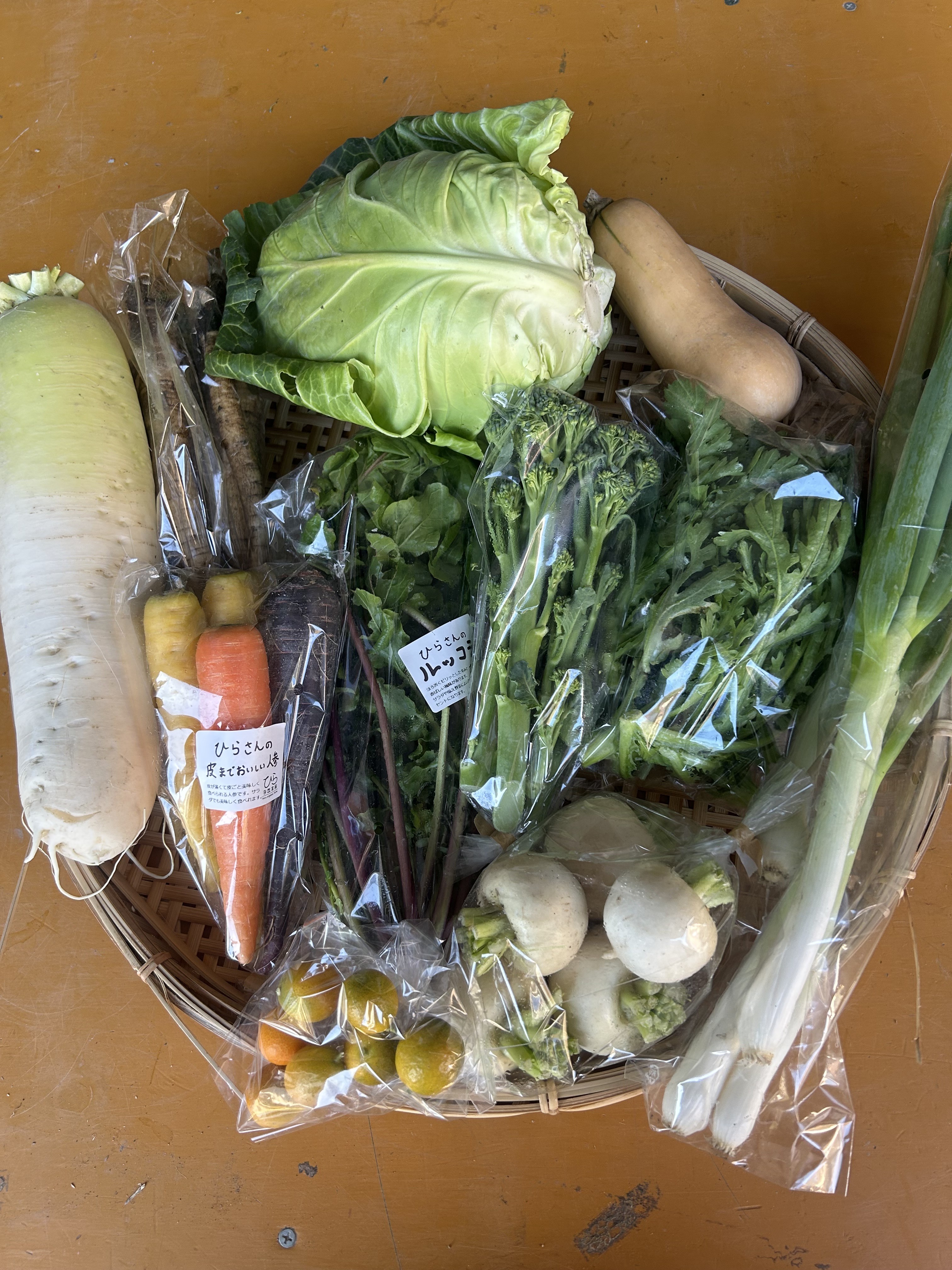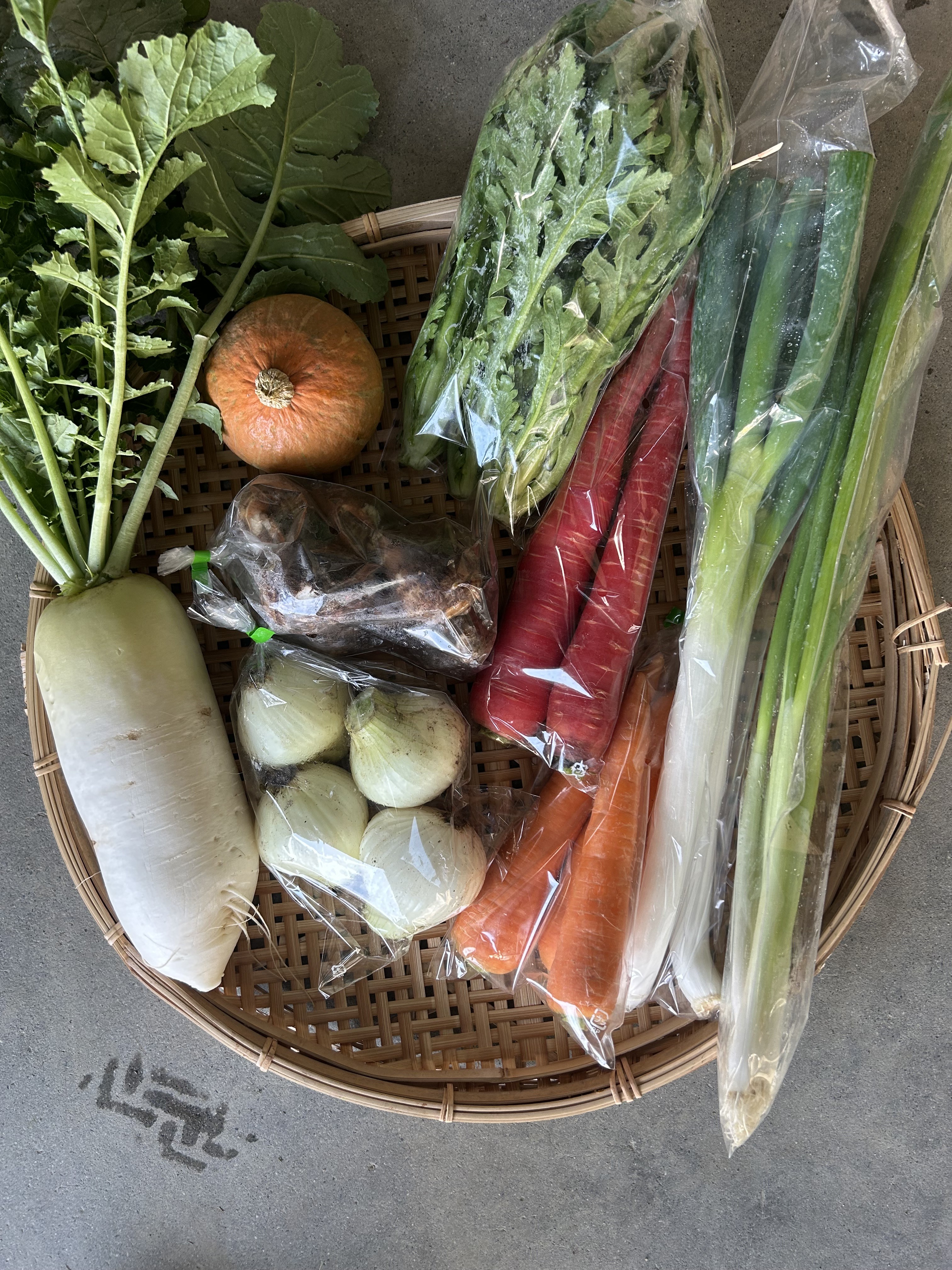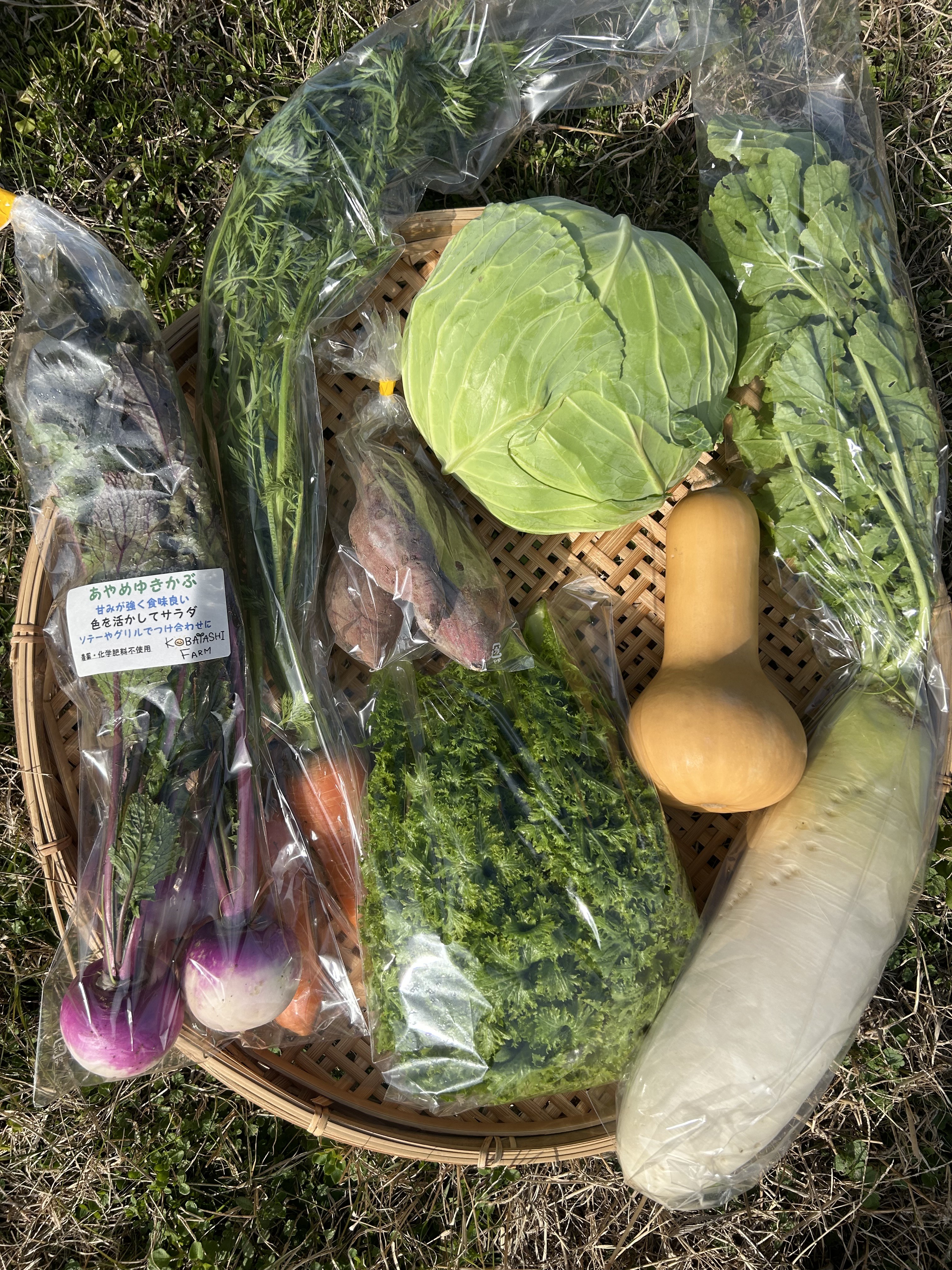葉付き大根、葉付き人参、キャベツ、あやめ雪カブ、わさび菜、さつまいも(紅はるか)、バターナッツかぼちゃ