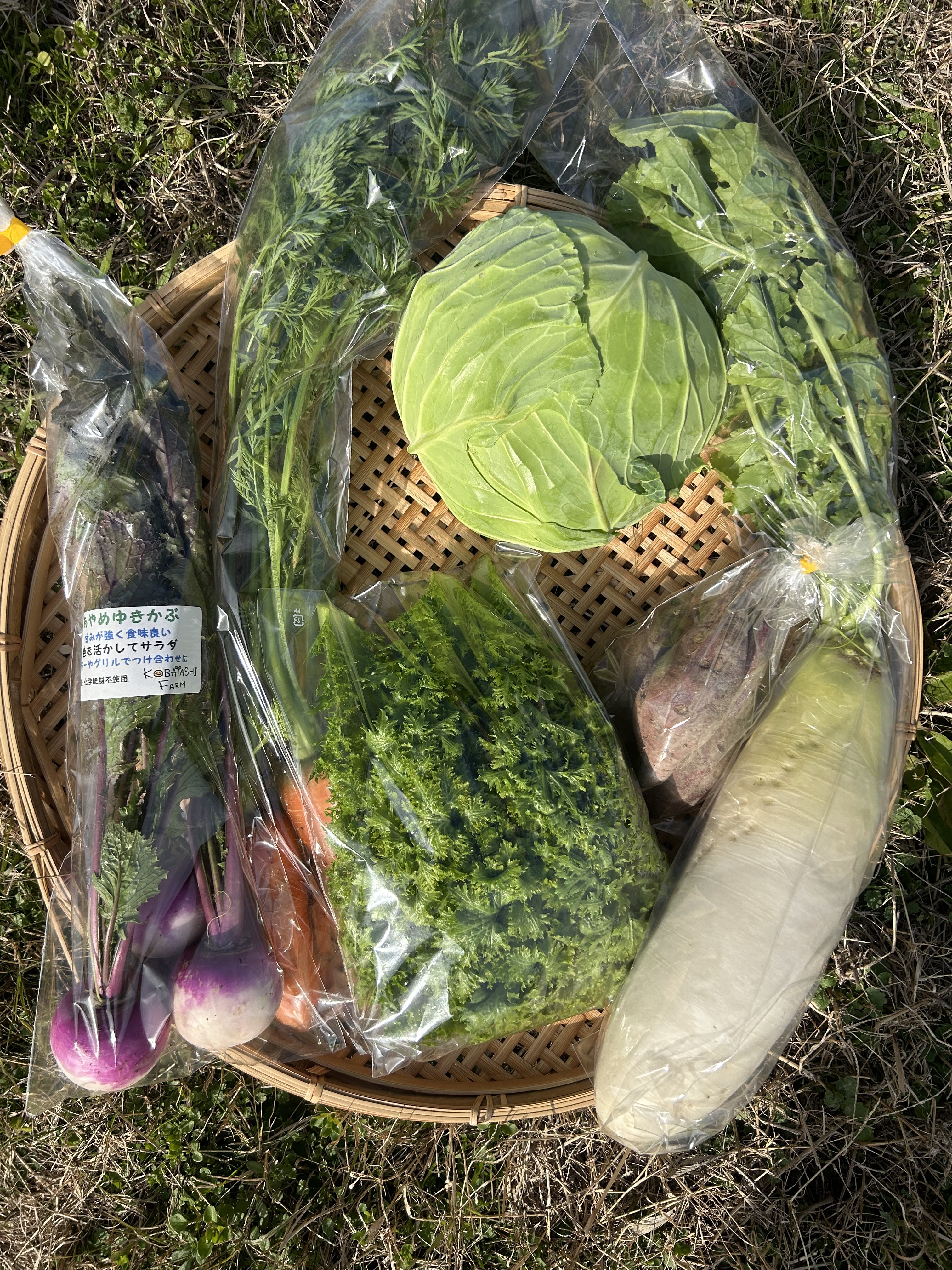 葉付き大根、葉付き人参、キャベツ、あやめ雪カブ、わさび菜、さつまいも(紅はるか)