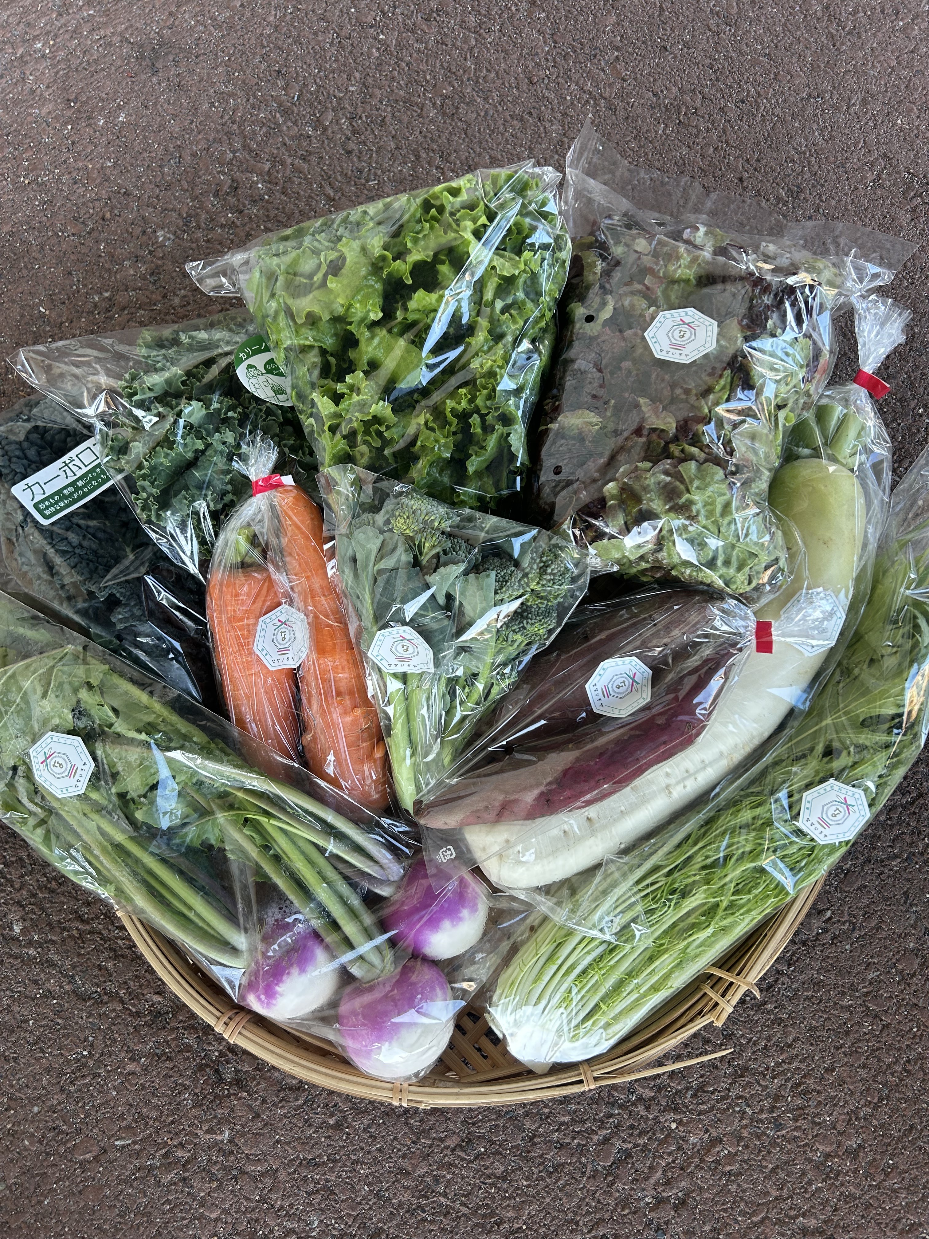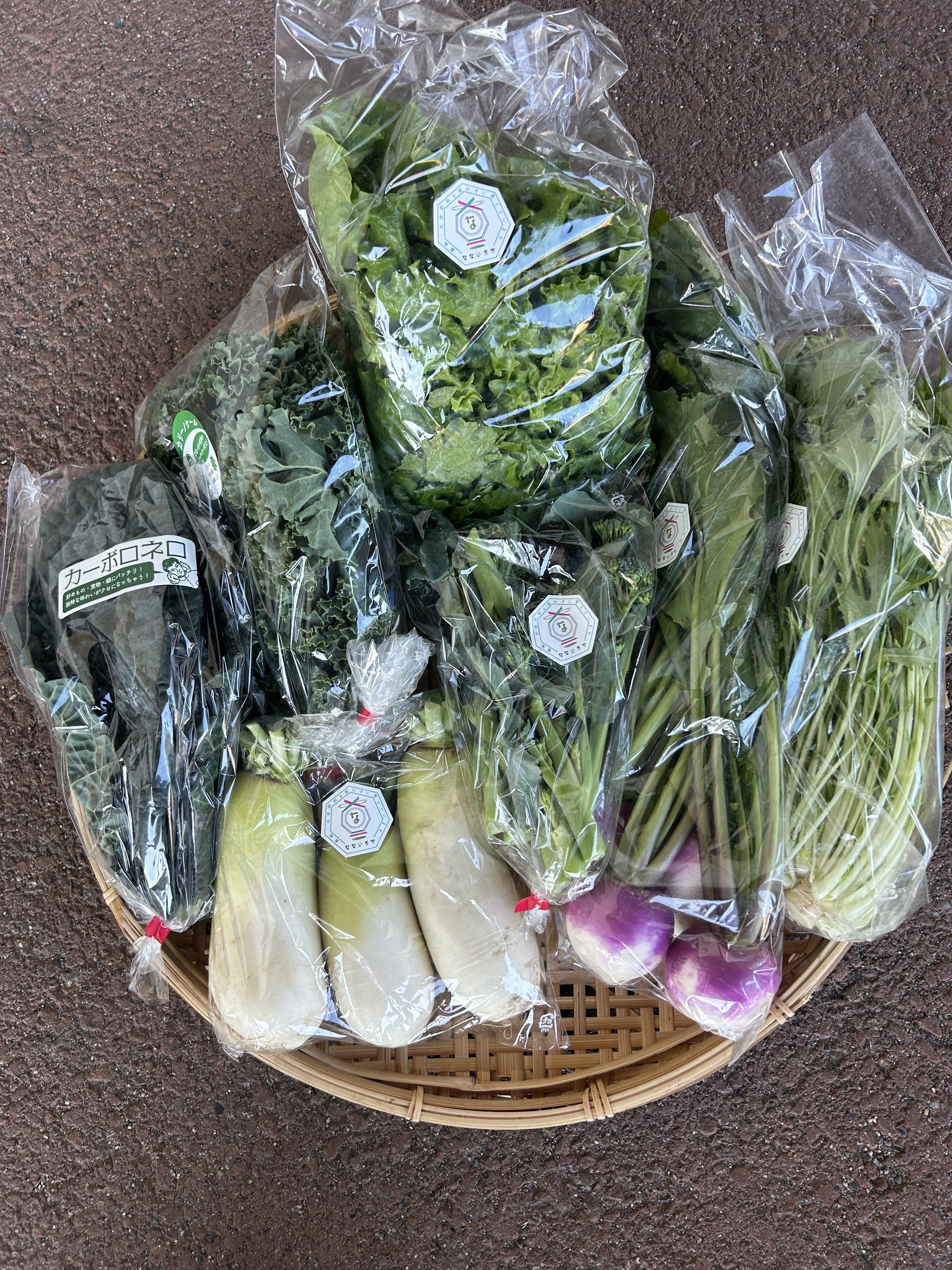 カリーノケール、カーボロネロ、フレアルージュ、グリーンサンバ、水菜、茎ブロッコリー、人参、あやめ雪カブ、おでん大根、サツマイモ(シルクスイート)