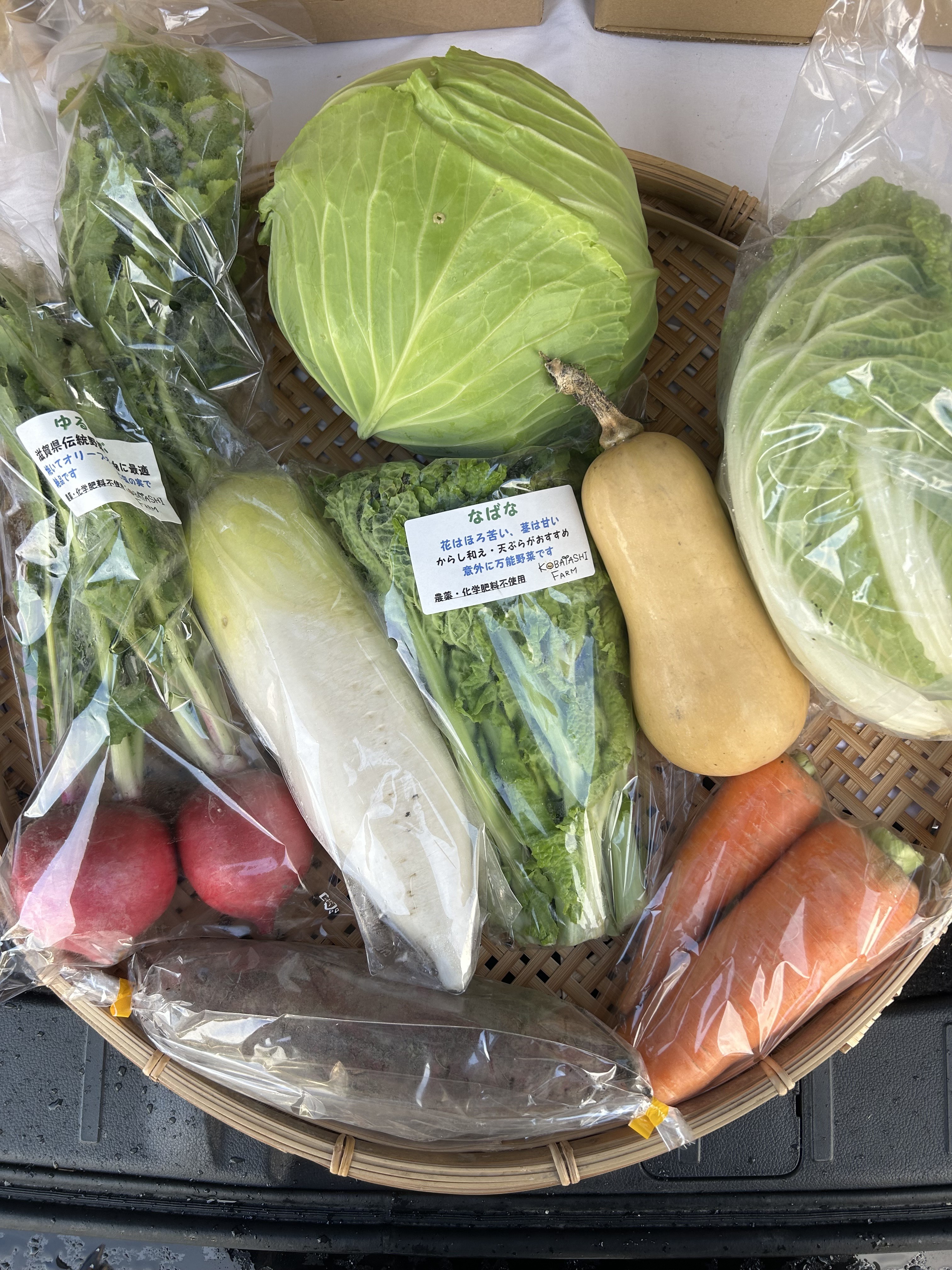 葉付き大根、人参、キャベツ、ゆるぎ雪カブ、なばな、サラダ白菜、さつまいも(紅はるか)、バターナッツかぼちゃ