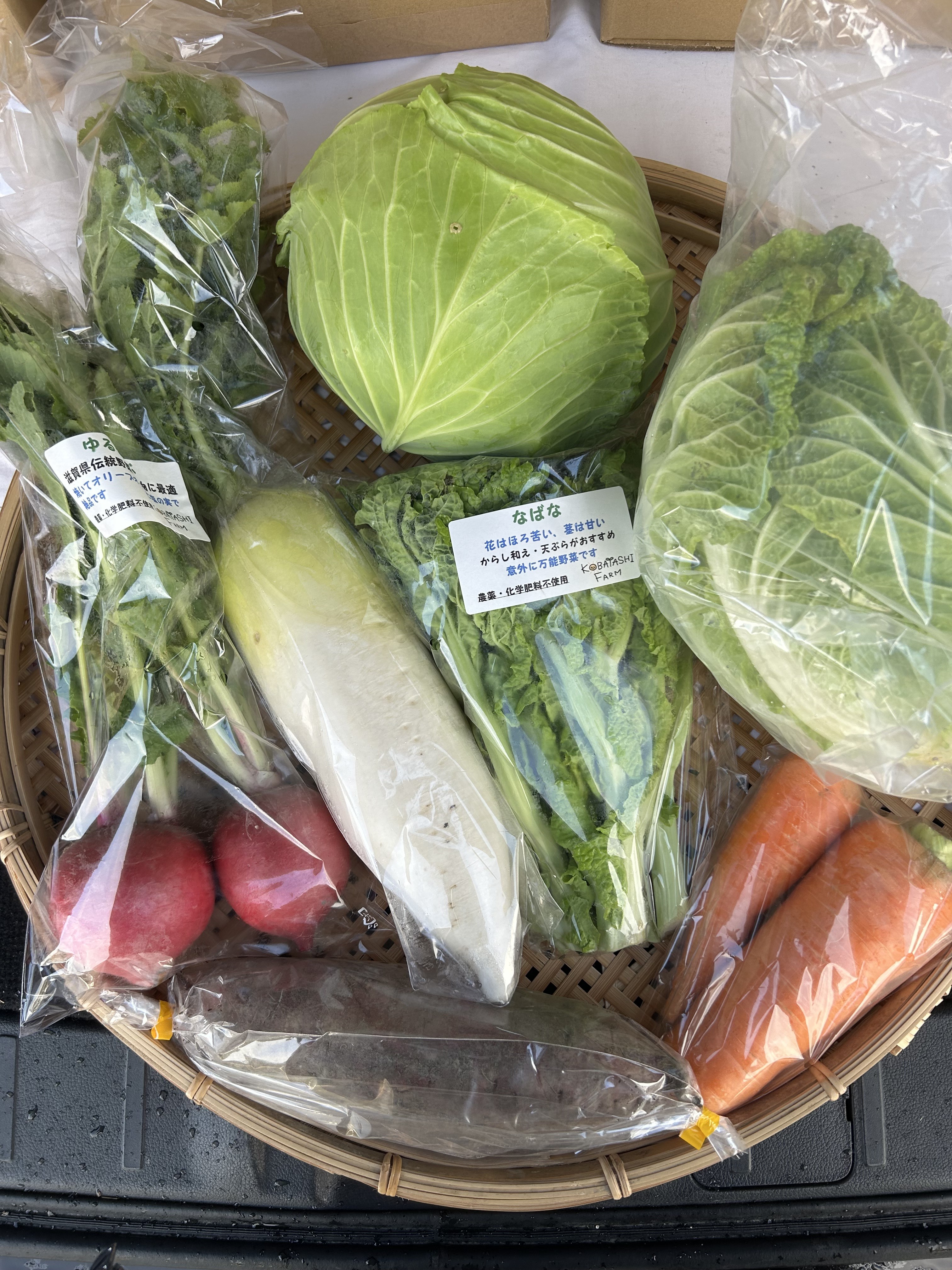 葉付き大根、人参、キャベツ、ゆるぎ雪カブ、なばな、サラダ白菜、さつまいも(紅はるか)