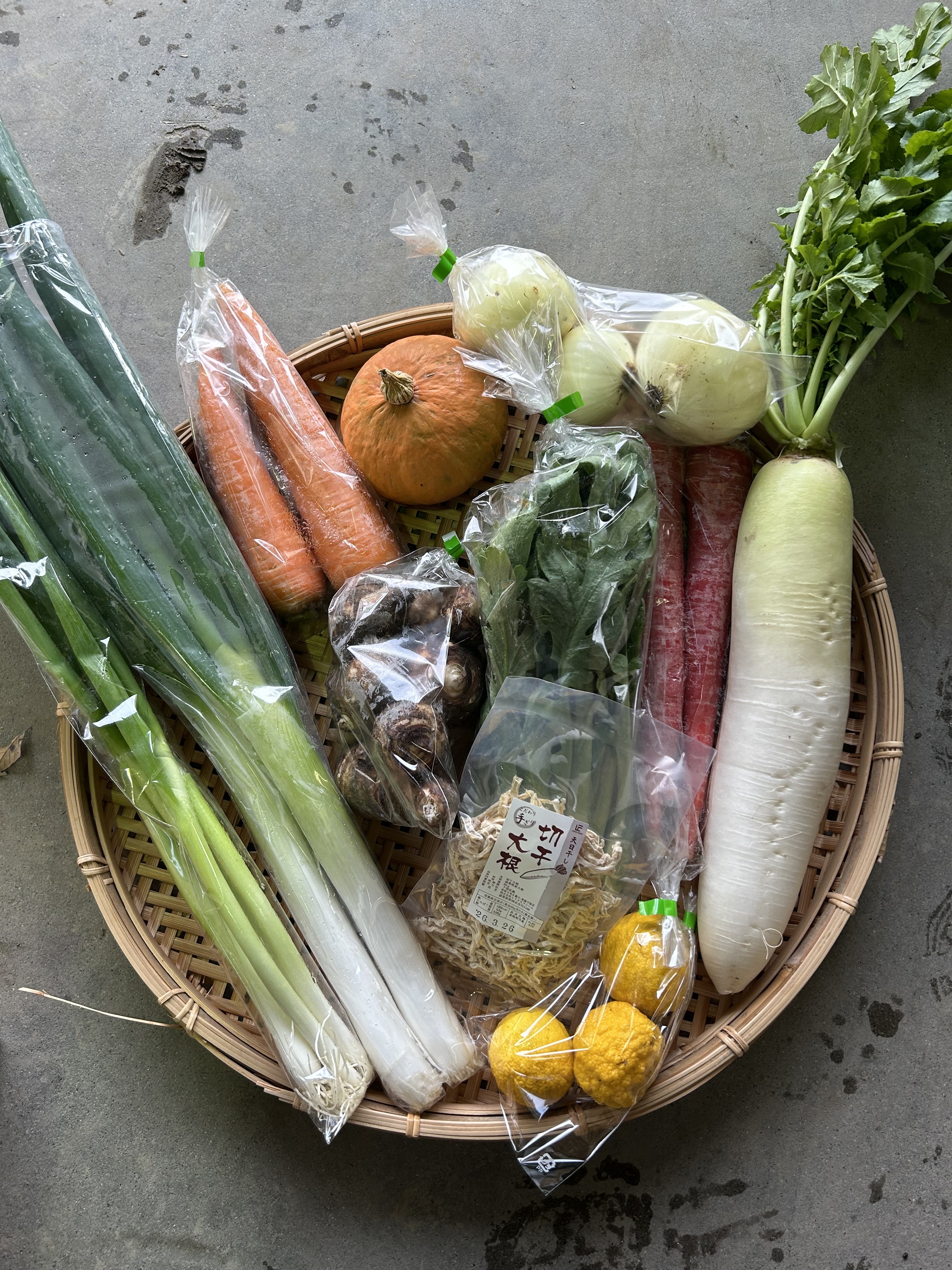 春菊、太ねぎ、大根、新玉ねぎ、人参、金時人参、里芋、かぼちゃ、切干大根、柚子