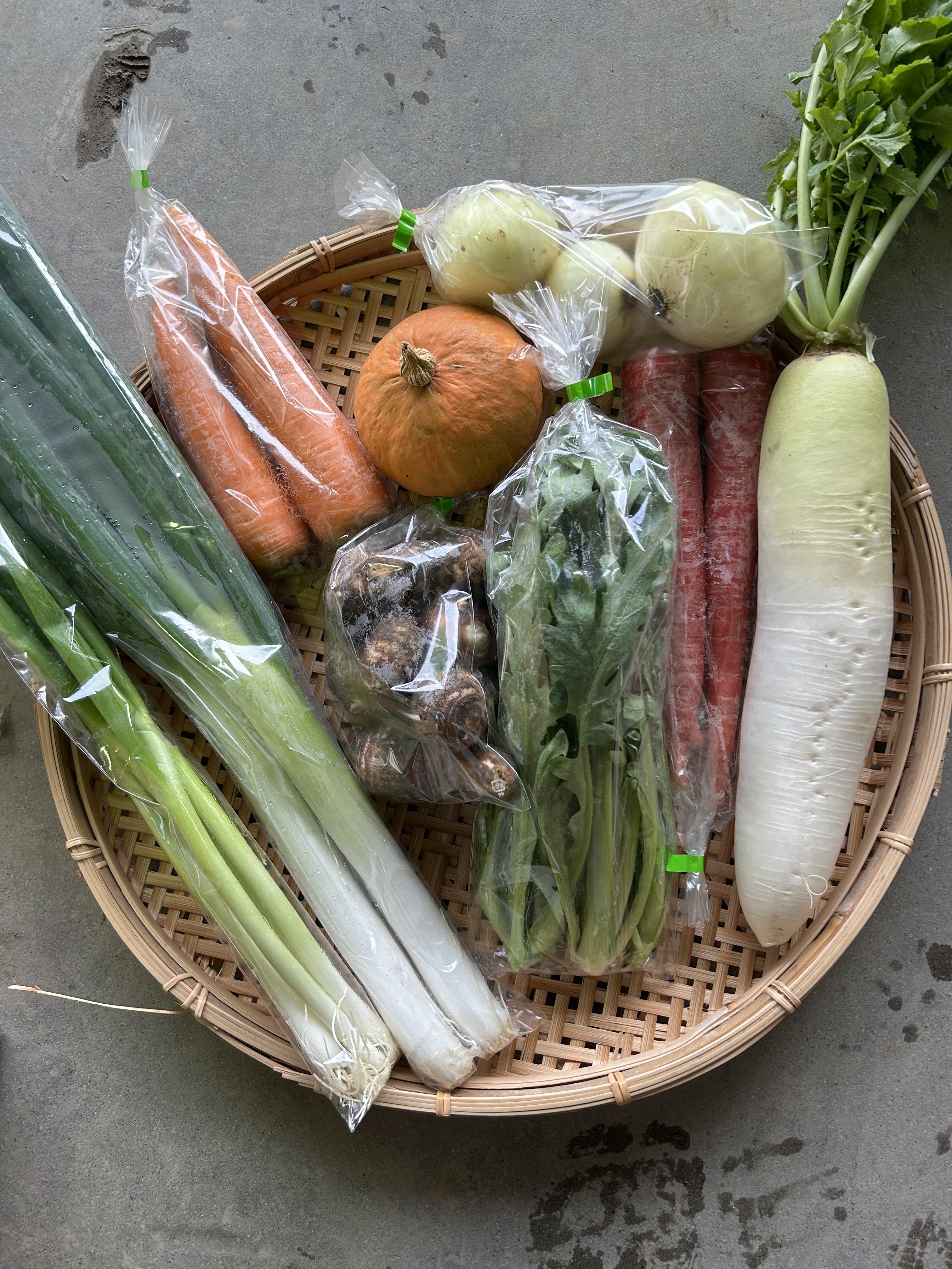 春菊、太ねぎ、大根、新玉ねぎ、人参、金時人参、里芋、かぼちゃ