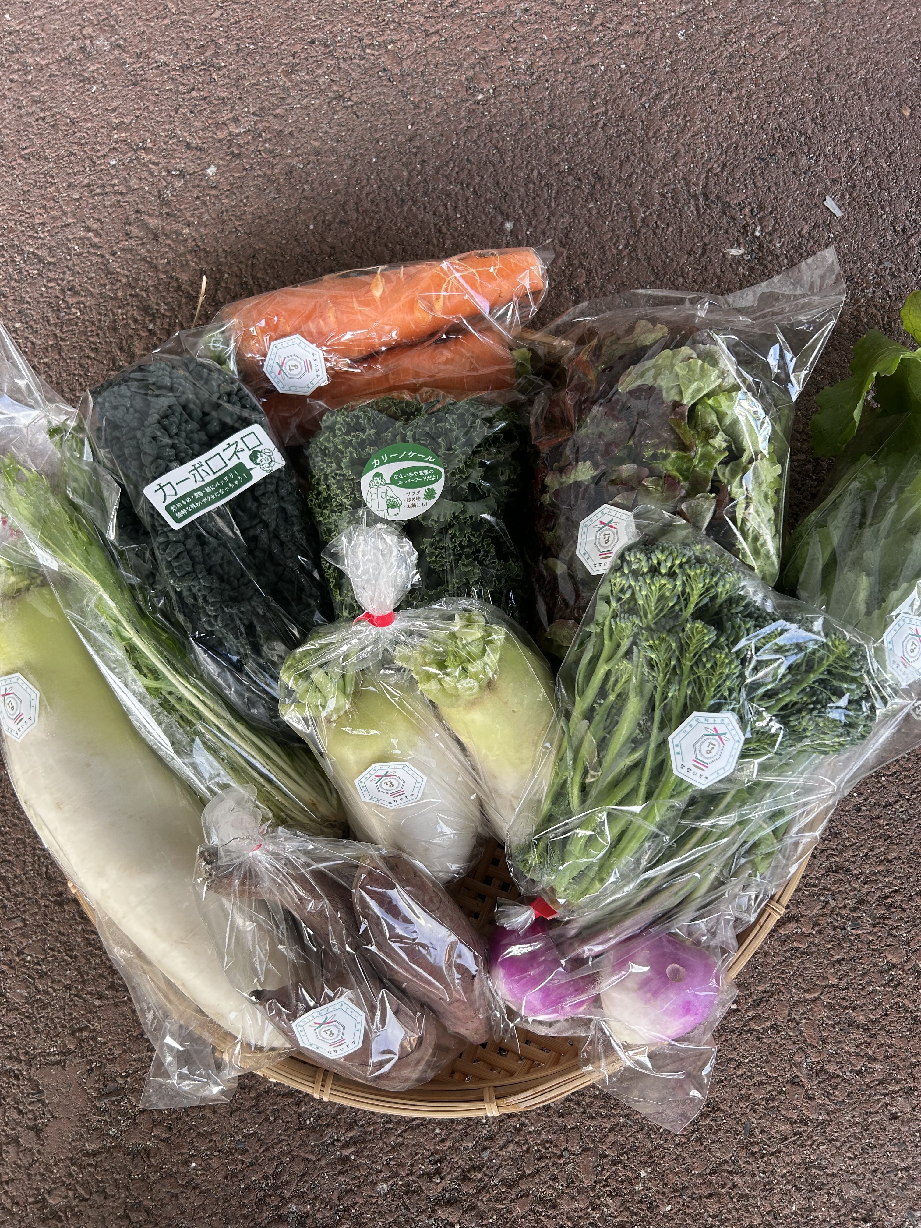 カリーノケール、カーボロネロ、フレアルージュ、水菜、茎ブロッコリー、人参、あやめ雪カブ、おでん大根、ミニ大根、サツマイモ(シルクスイート)