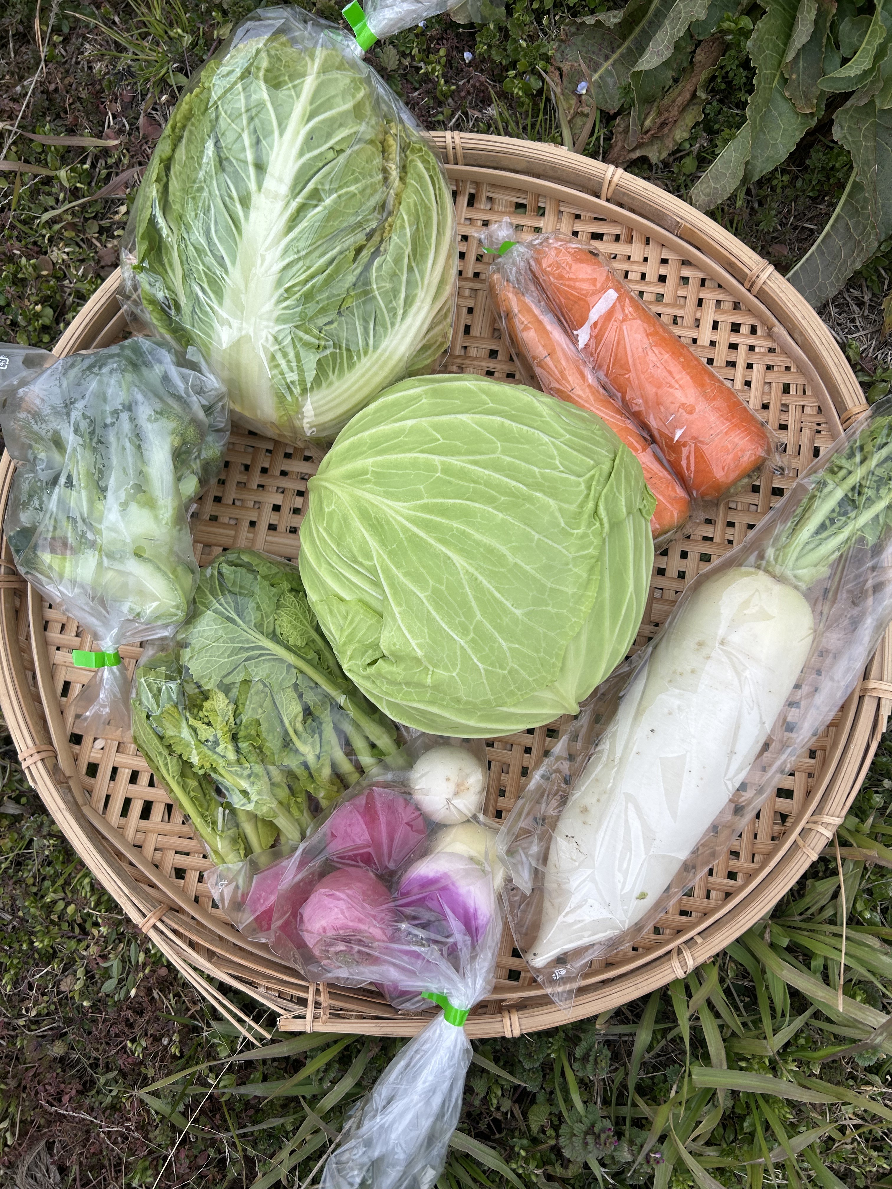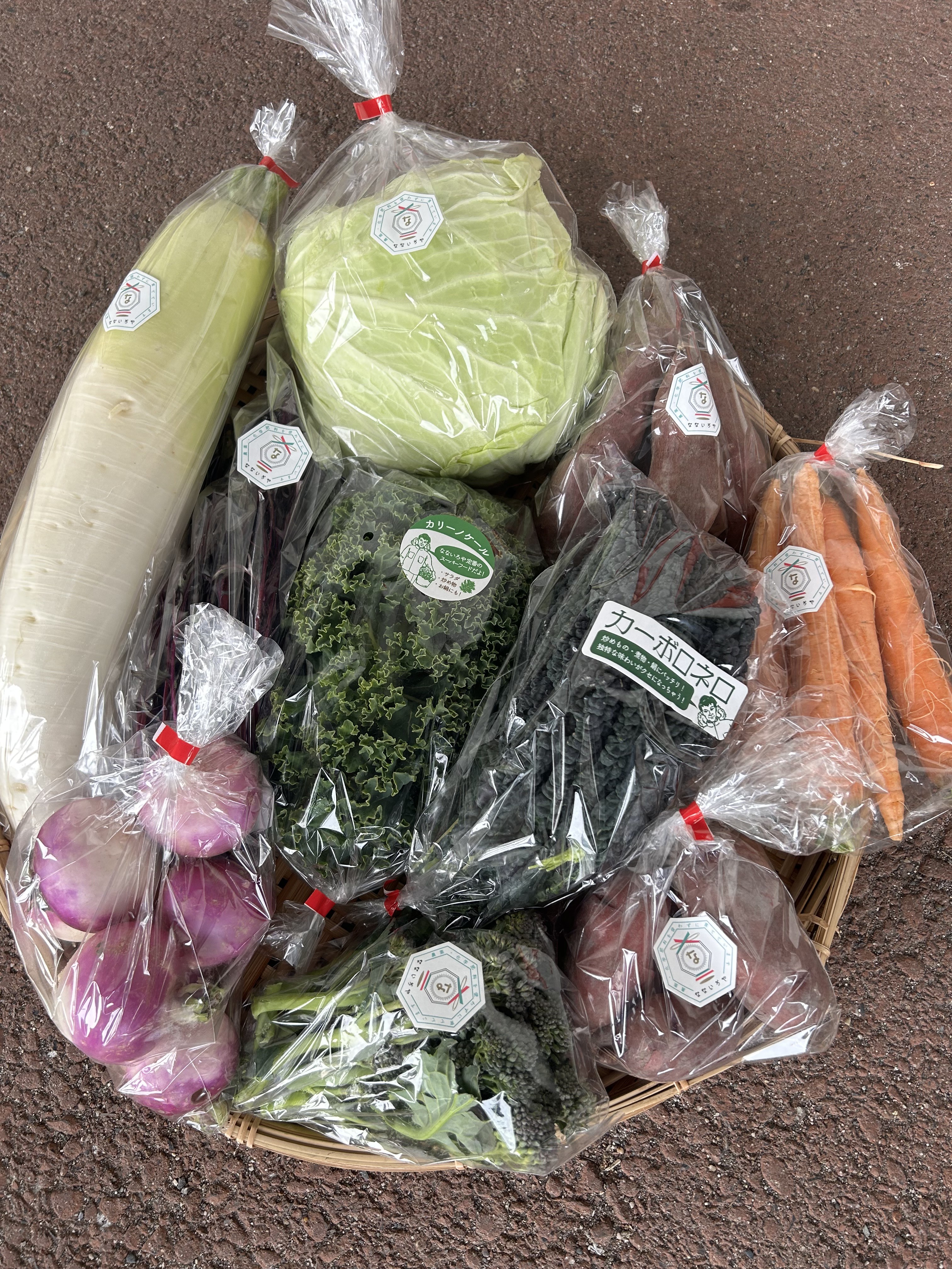 カリーノケール、カーボロネロ、茎ブロッコリー、人参、赤水菜、キャベツ、あやめ雪カブ、おでん大根、サツマイモ(シルクスイート)、じゃがいも(レッドムーン)