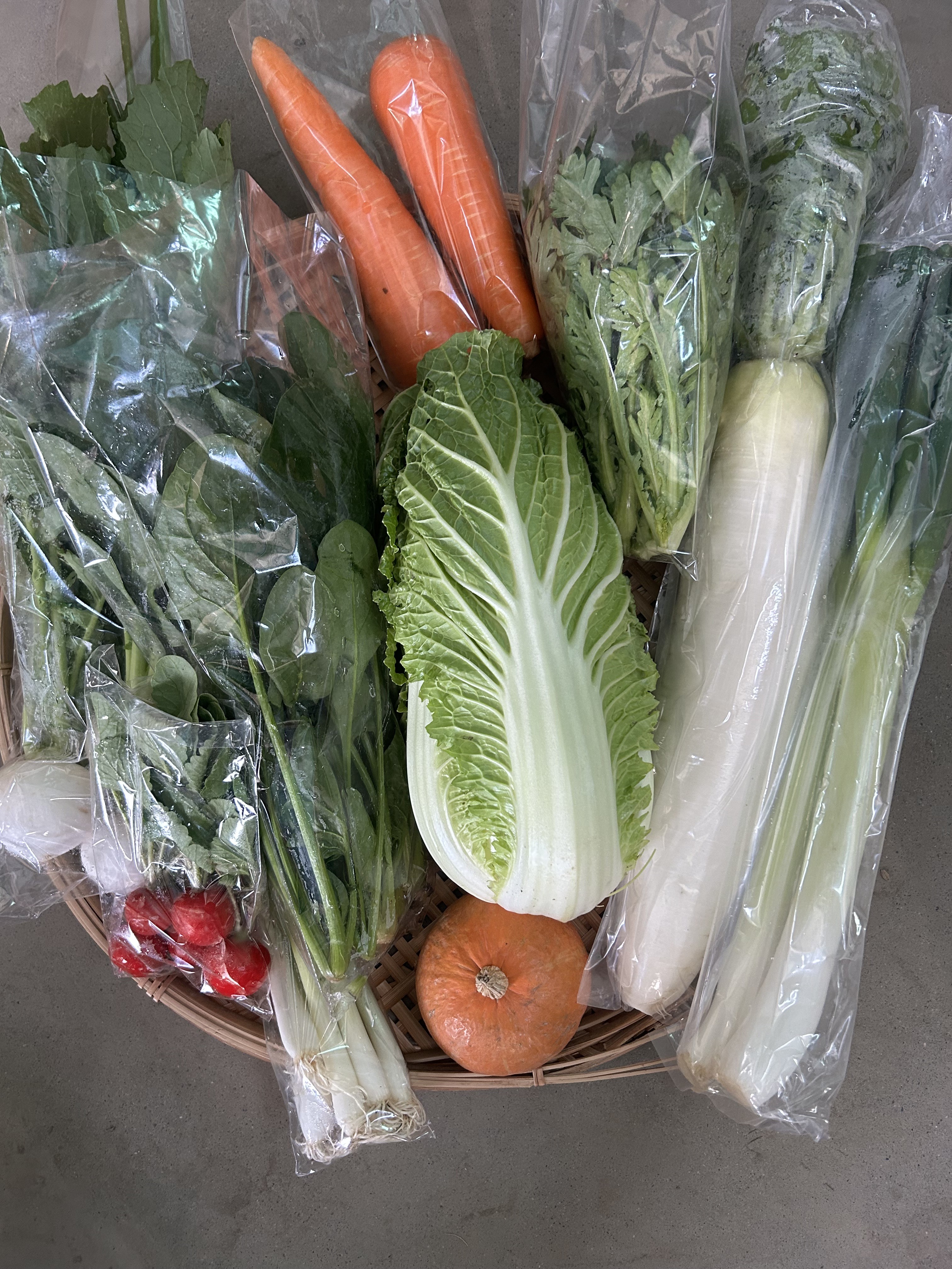 ほうれん草、春菊、こかぶ、太ねぎ、大根、白菜、人参、細ねぎ