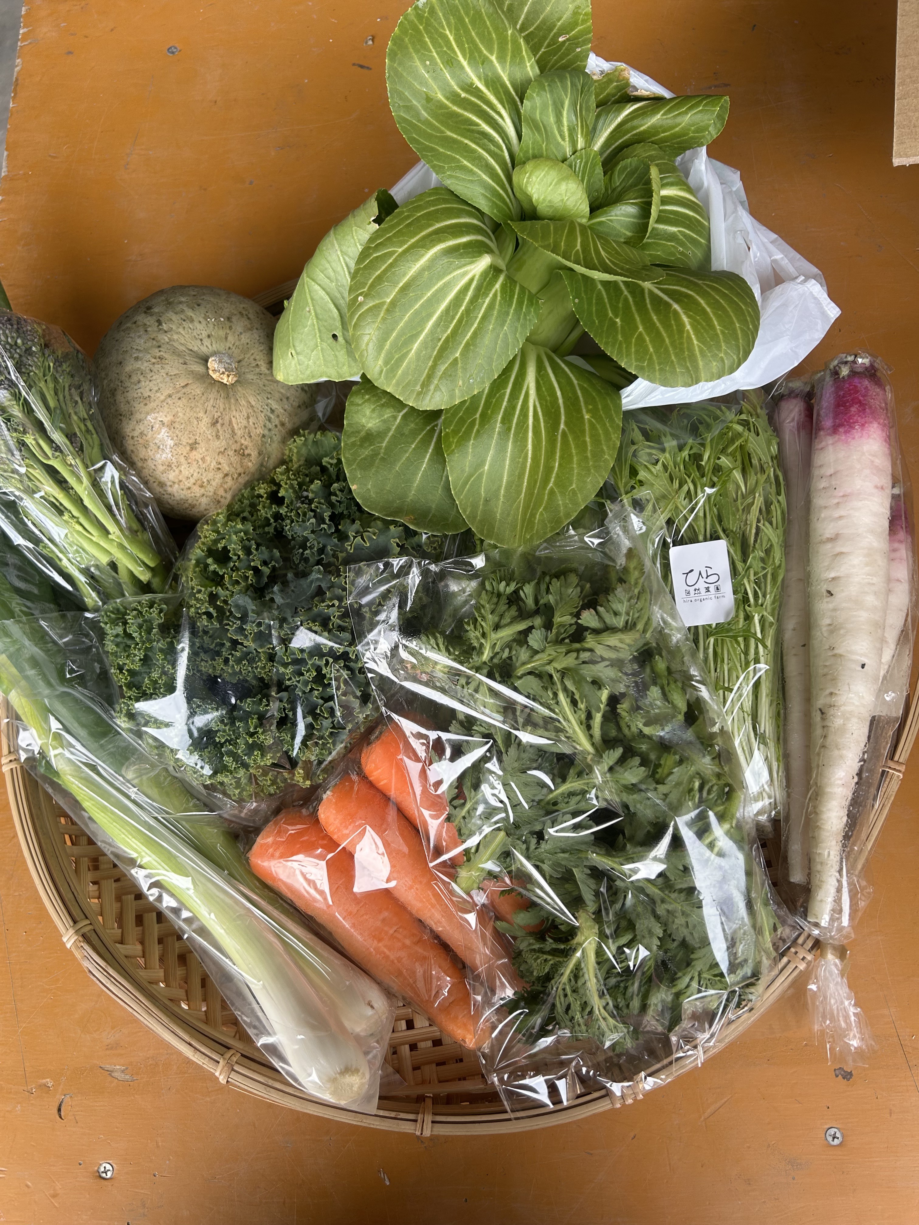 カボチャ、カリーノケール、人参、日野菜、ブロッコリー、春菊、なばな、ミニ青梗菜