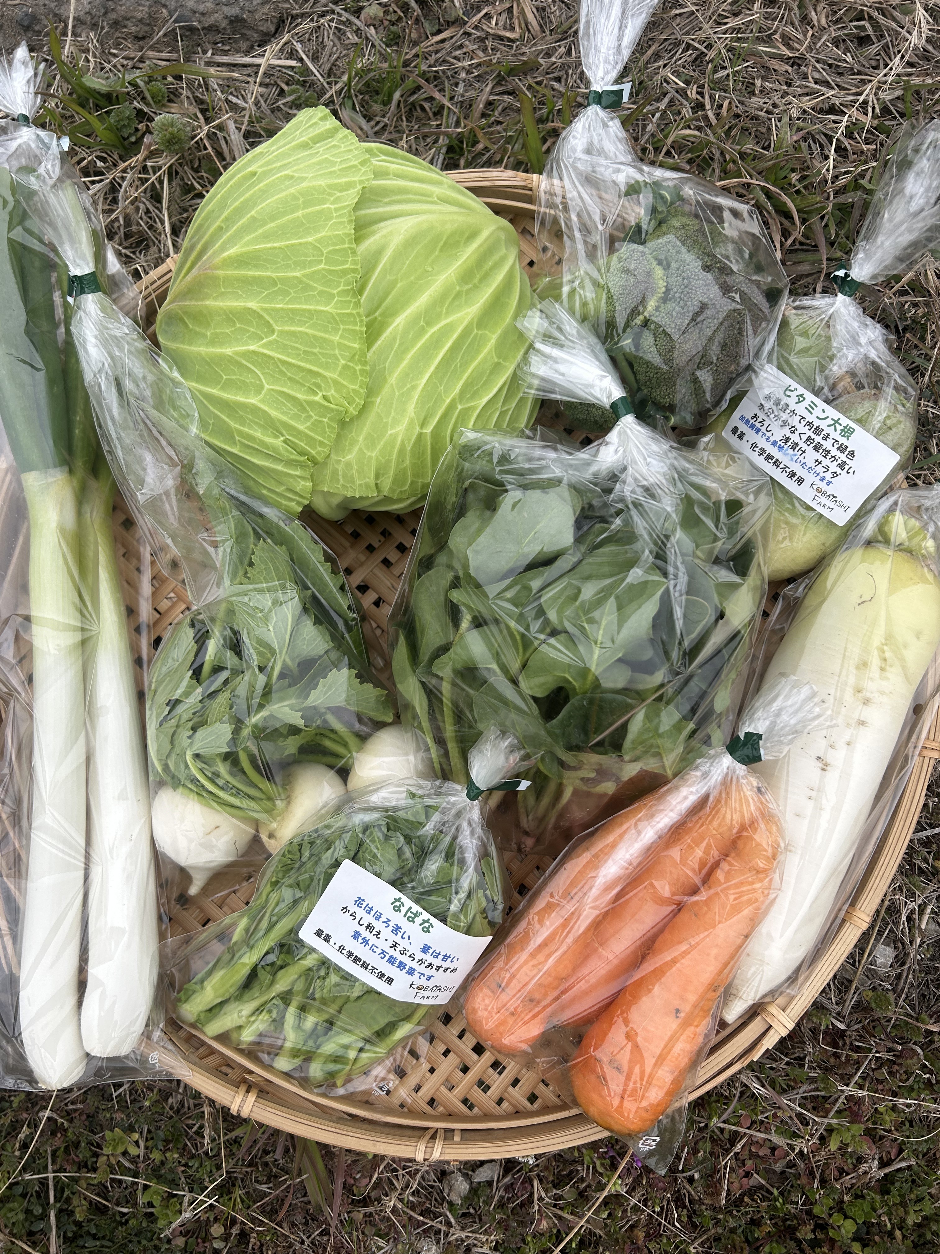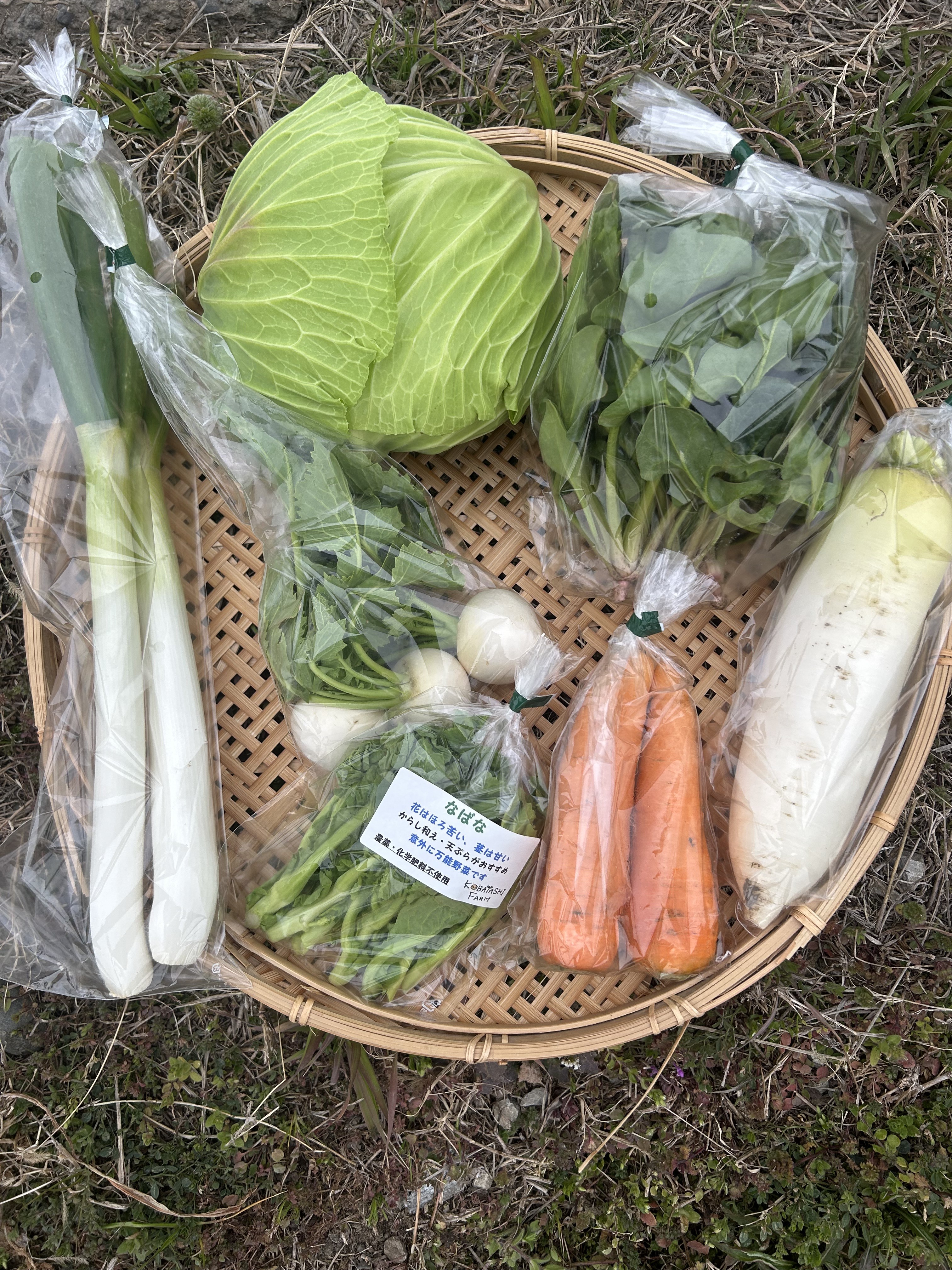 キャベツ、大根、人参、サラダかぶ、ほうれん草、長ネギ、なばな、ブロッコリー、ビタミン大根