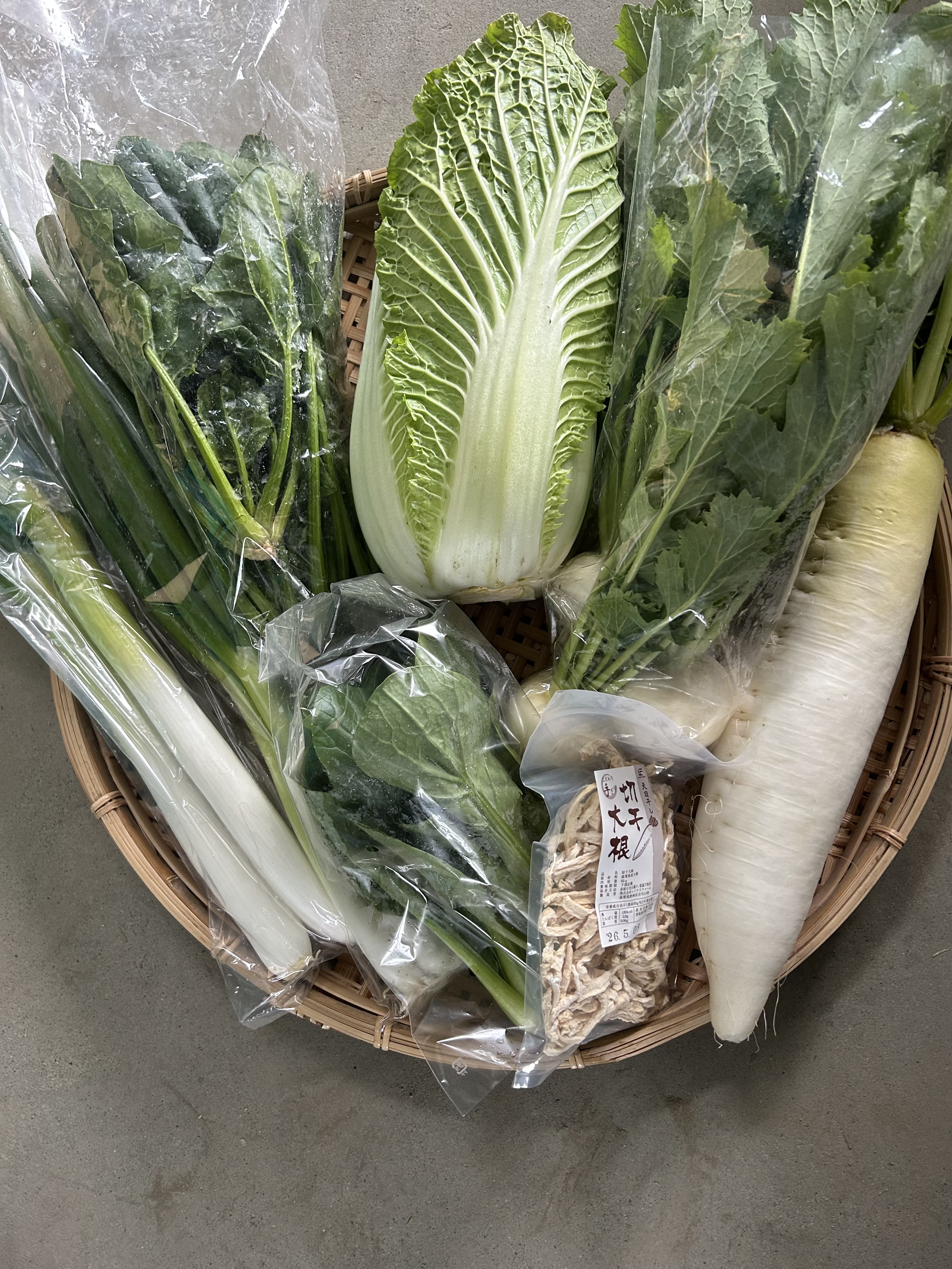 ほうれん草、小松菜、こかぶ、細ねぎ、太ねぎ、大根、白菜、切干大根