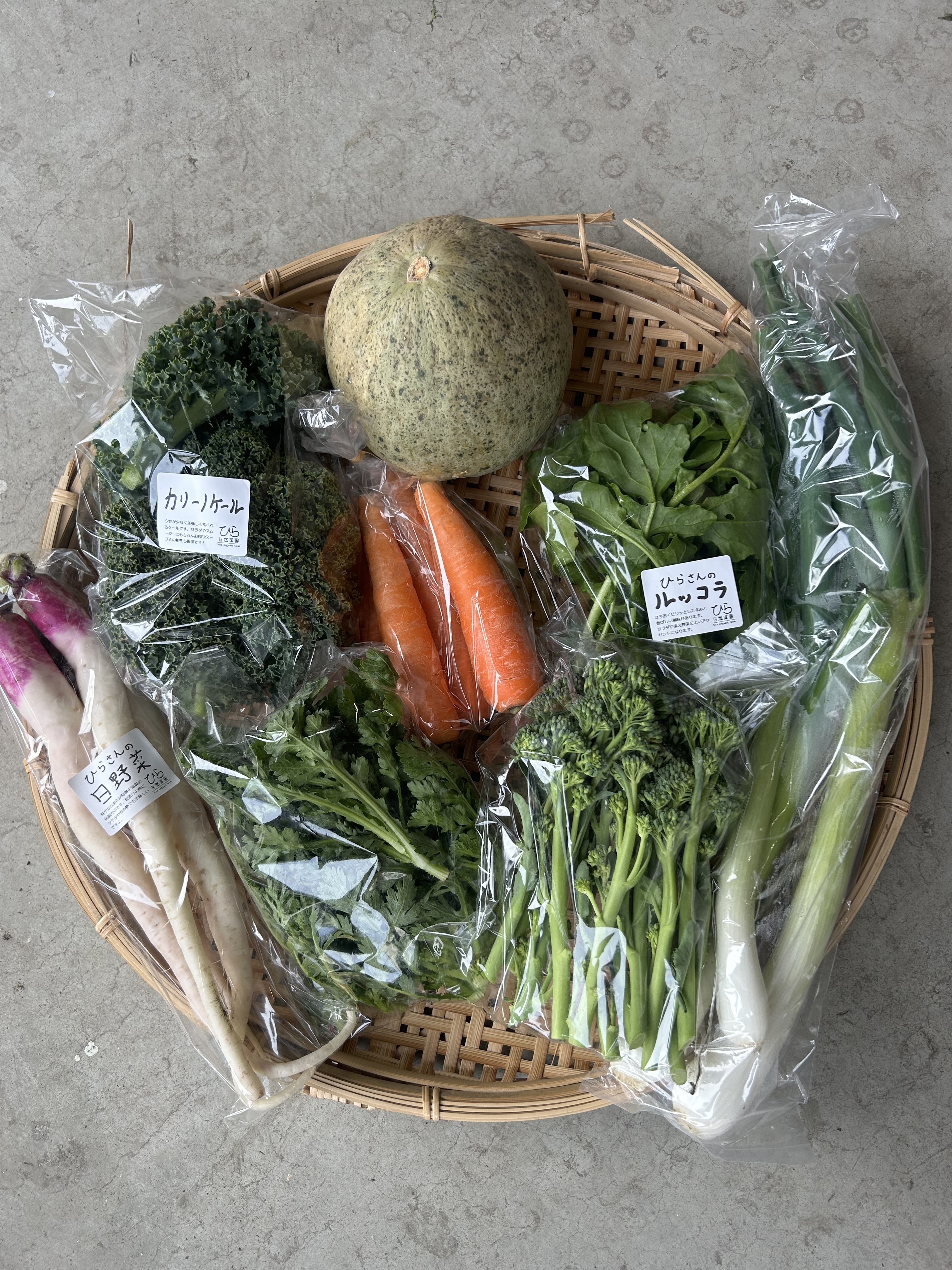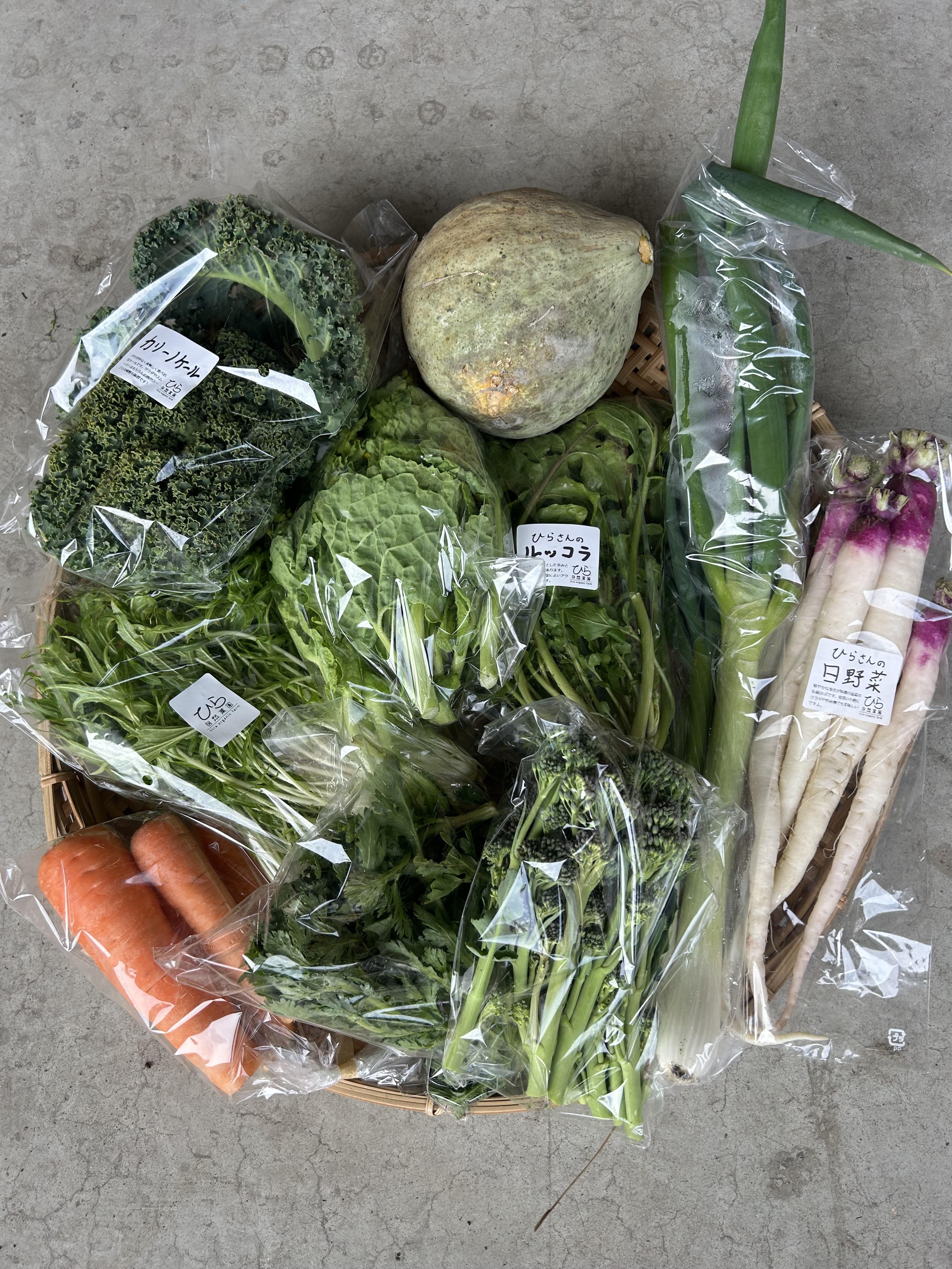 カボチャ、カリーノケール、人参、ねぎ、日野菜、ブロッコリー、ルッコラ、春菊、なばな、水菜