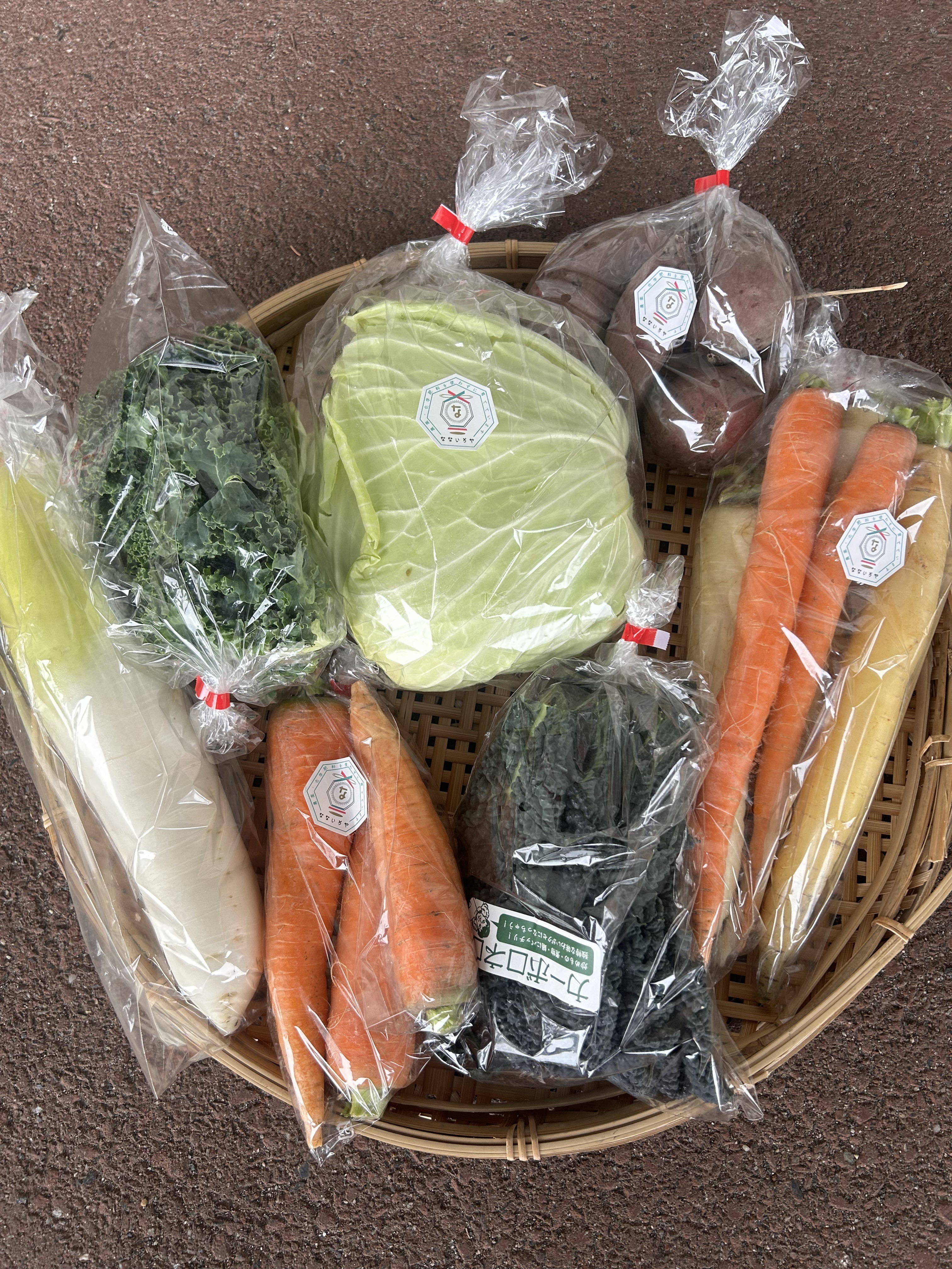 カリーノケール、カーボロネロ、茎ブロッコリー、キャベツ、人参、カラー人参、おでん大根、ミニ大根、サツマイモ(シルクスイート)