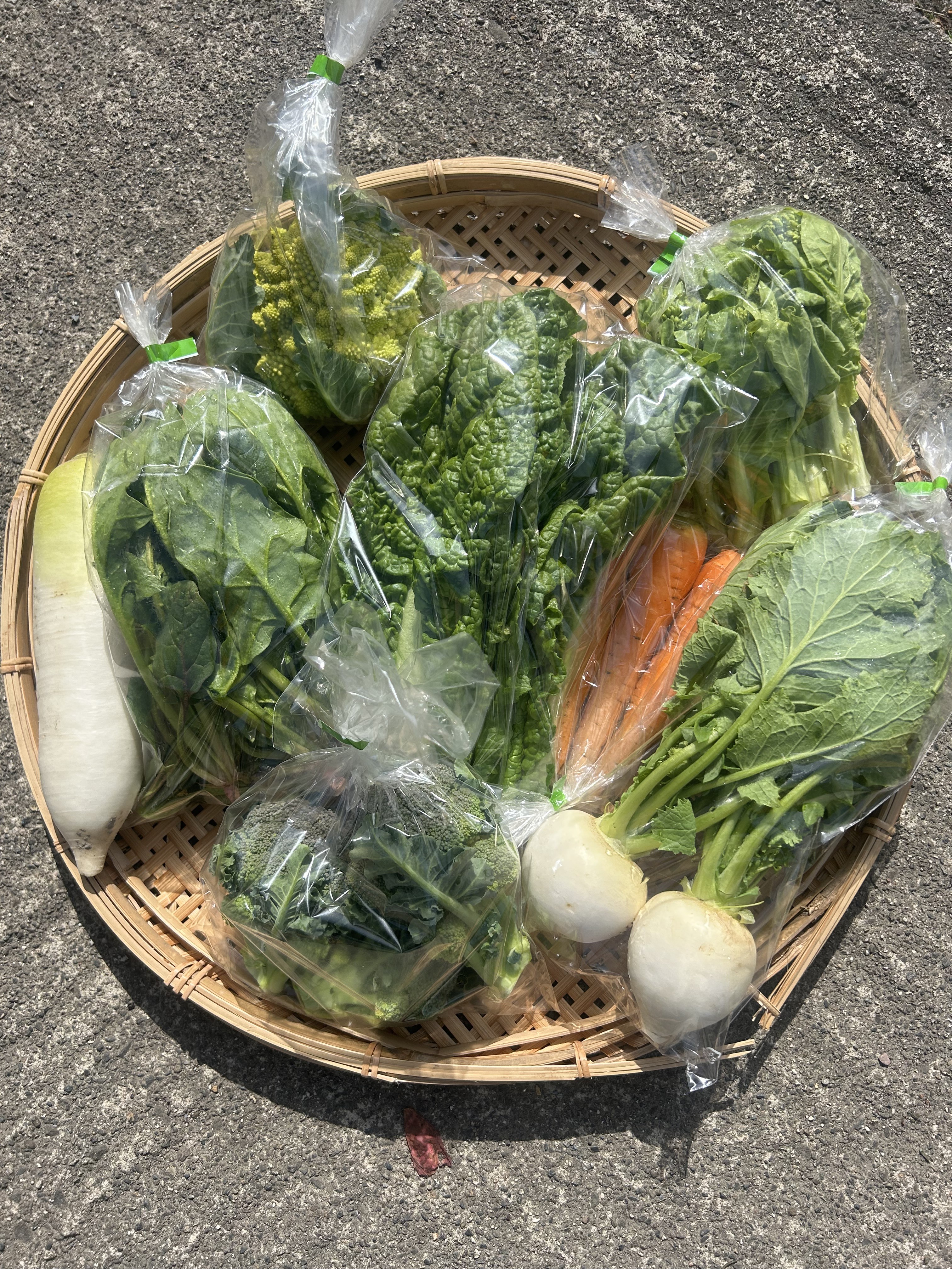 ロマネスコ、ブロッコリー、かつお菜、ほうれん草、人参、白菜なばな、サラダかぶ、大根