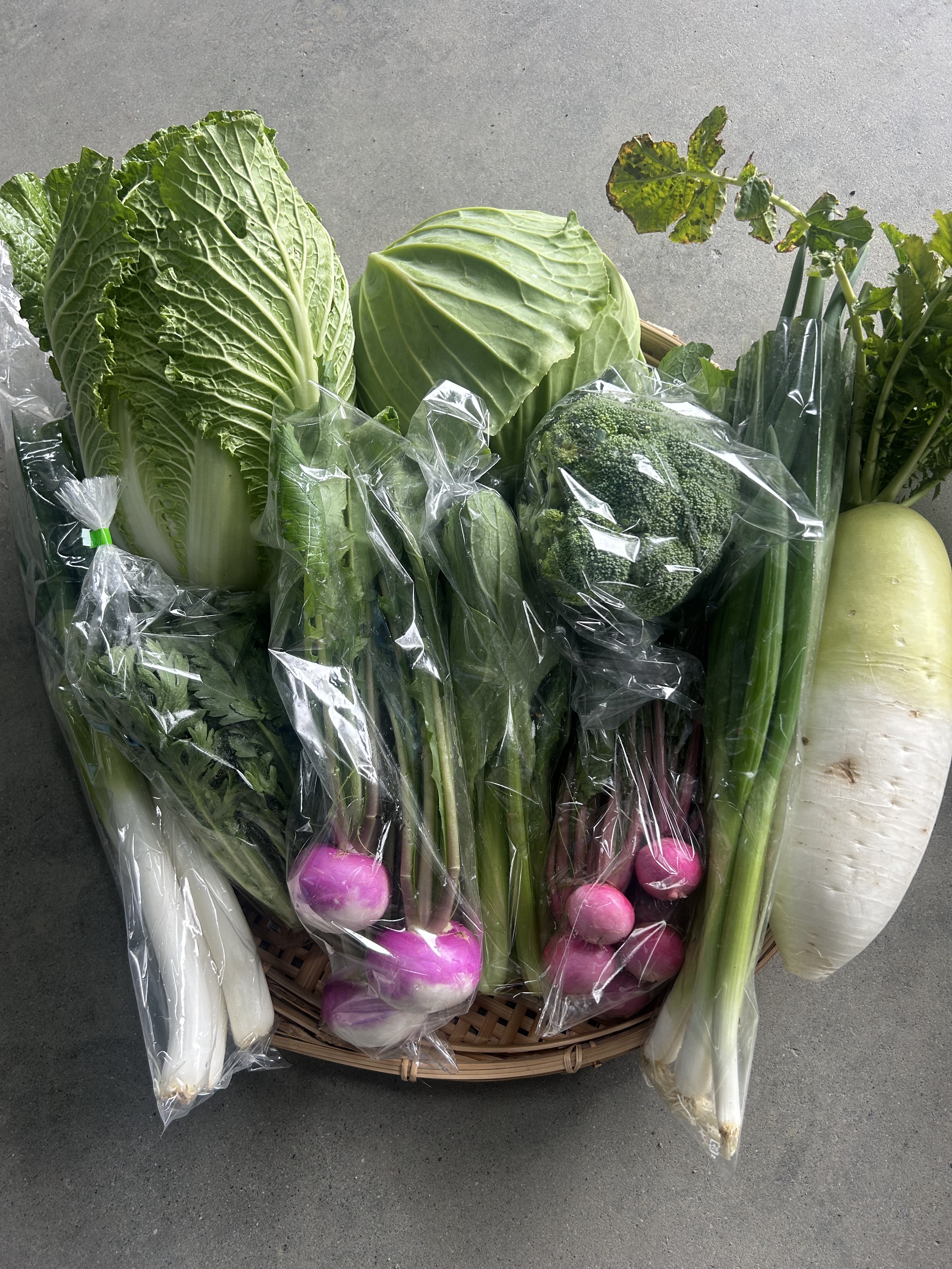 ブロッコリー、小松菜、こかぶ、細ねぎ、キャベツ、太ねぎ、大根、白菜、桃寿かぶ