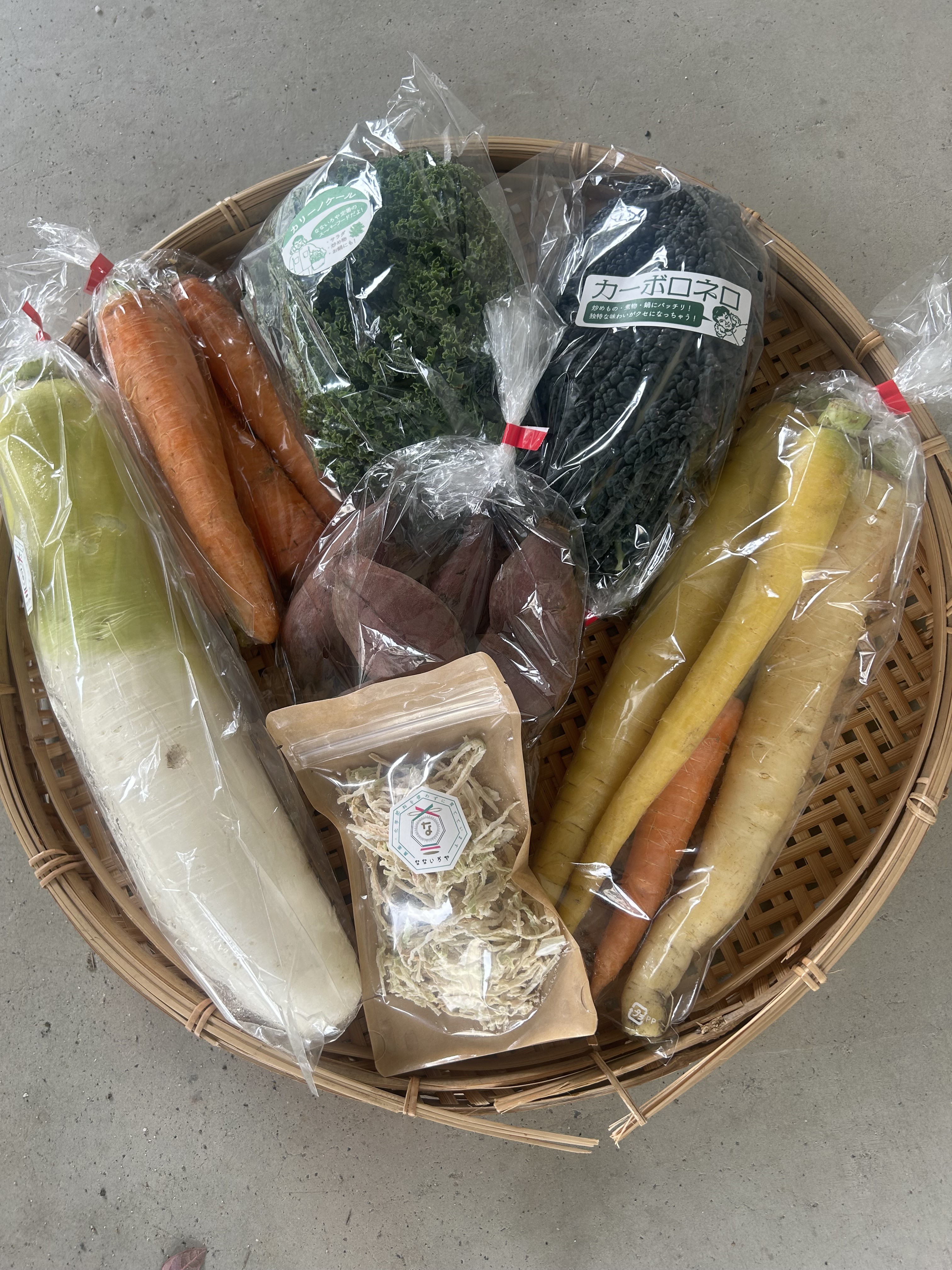 カリーノケール、カーボロネロ、人参、カラー人参、おでん大根、サツマイモ(シルクスイート)、切り干し大根