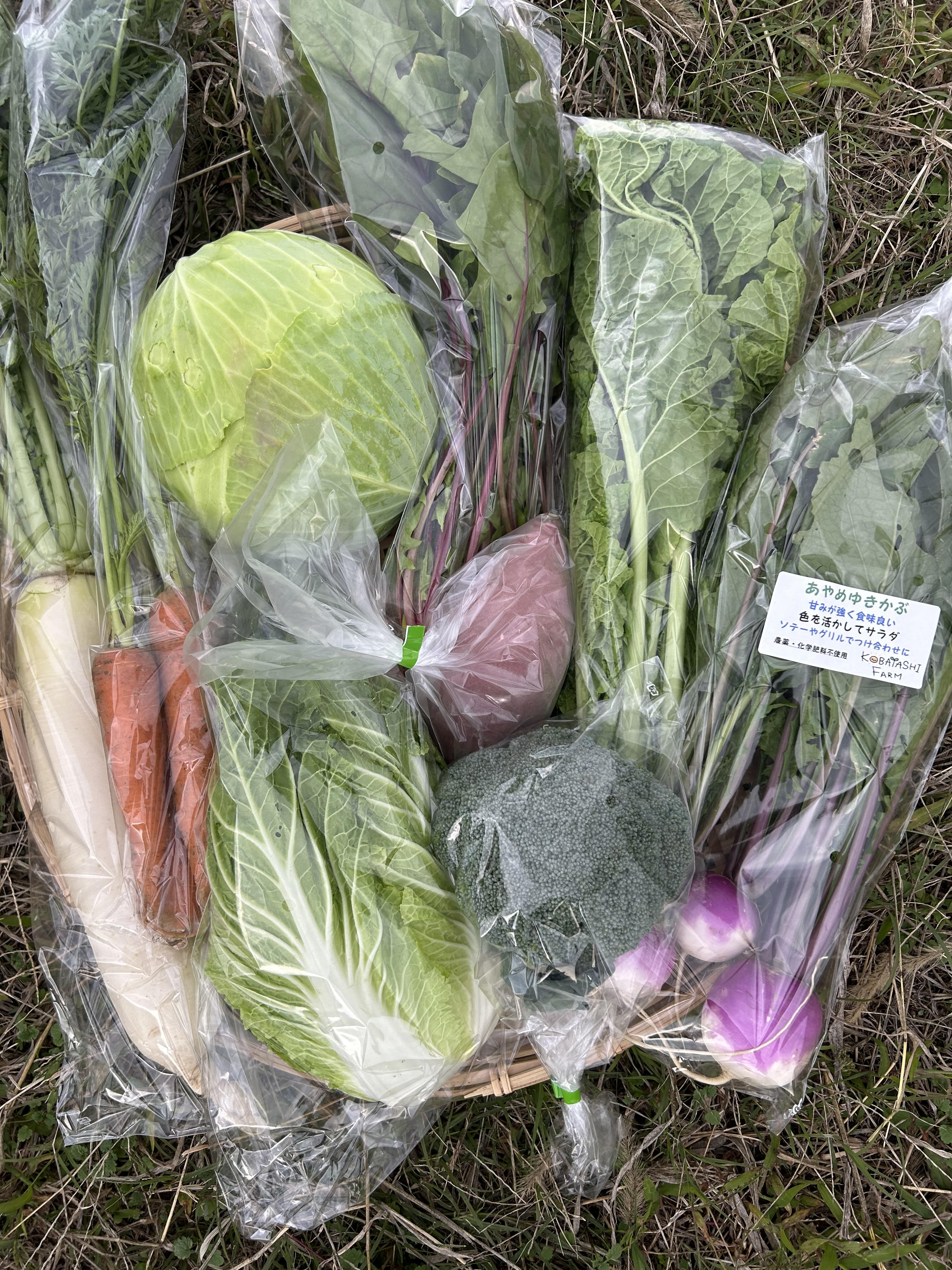 白菜、ブロッコリー、キャベツ、葉つき大根、赤軸ほうれん草、あやめ雪カブ、葉つき人参、アブラナ、さつまいも(べにはるか)