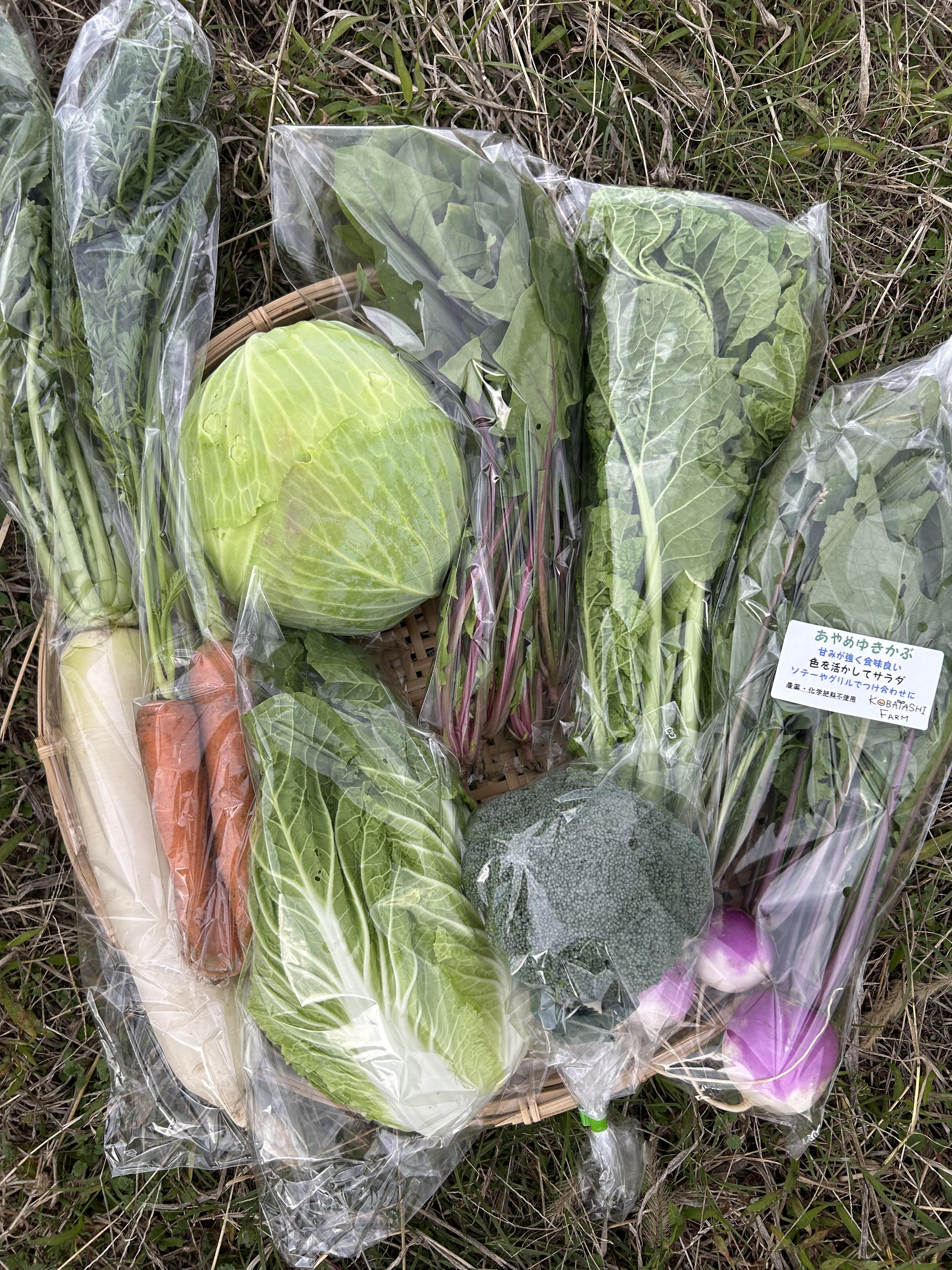 白菜、ブロッコリー、キャベツ、葉つき大根、赤軸ほうれん草、あやめ雪カブ、葉つき人参、アブラナ