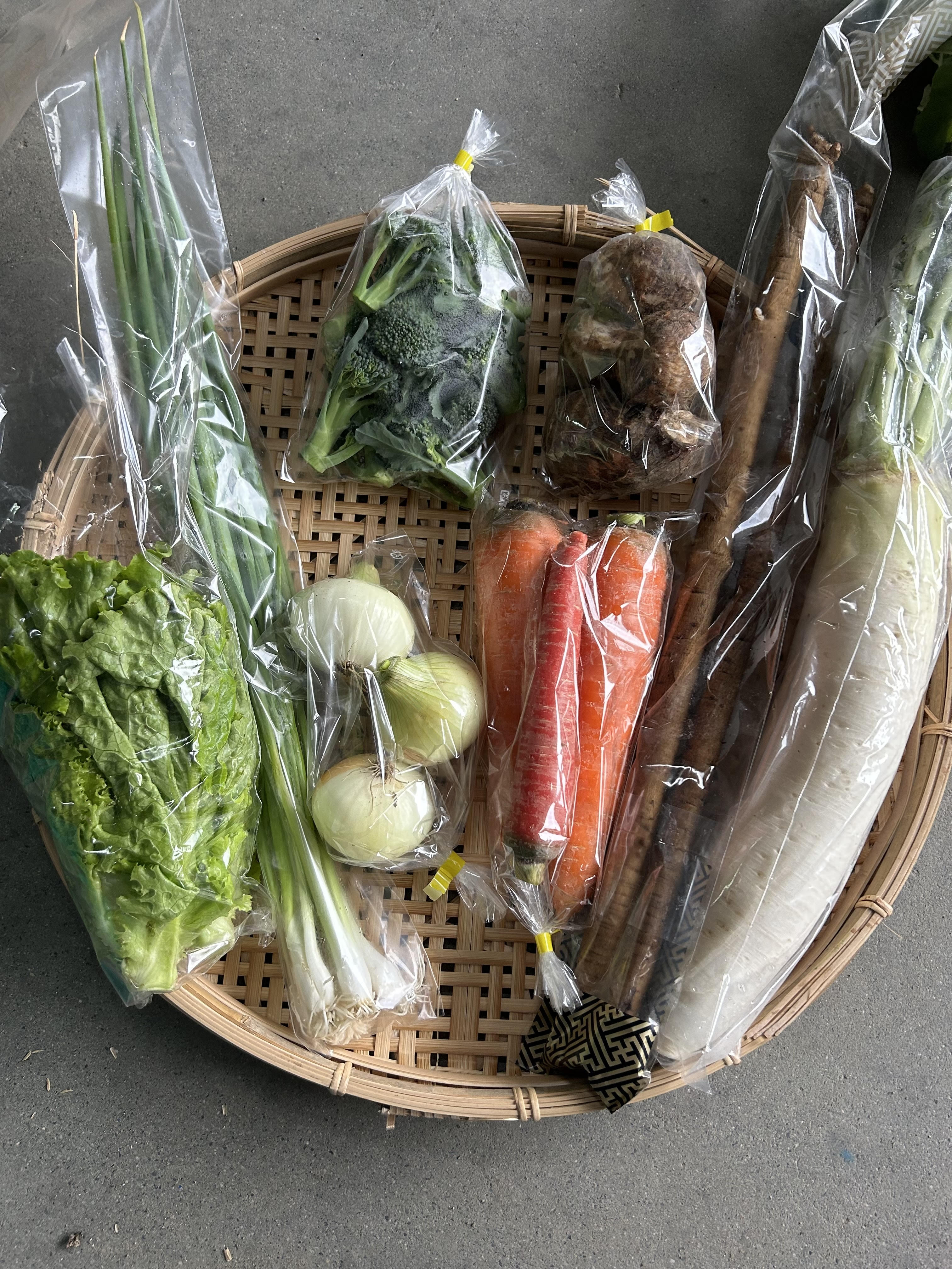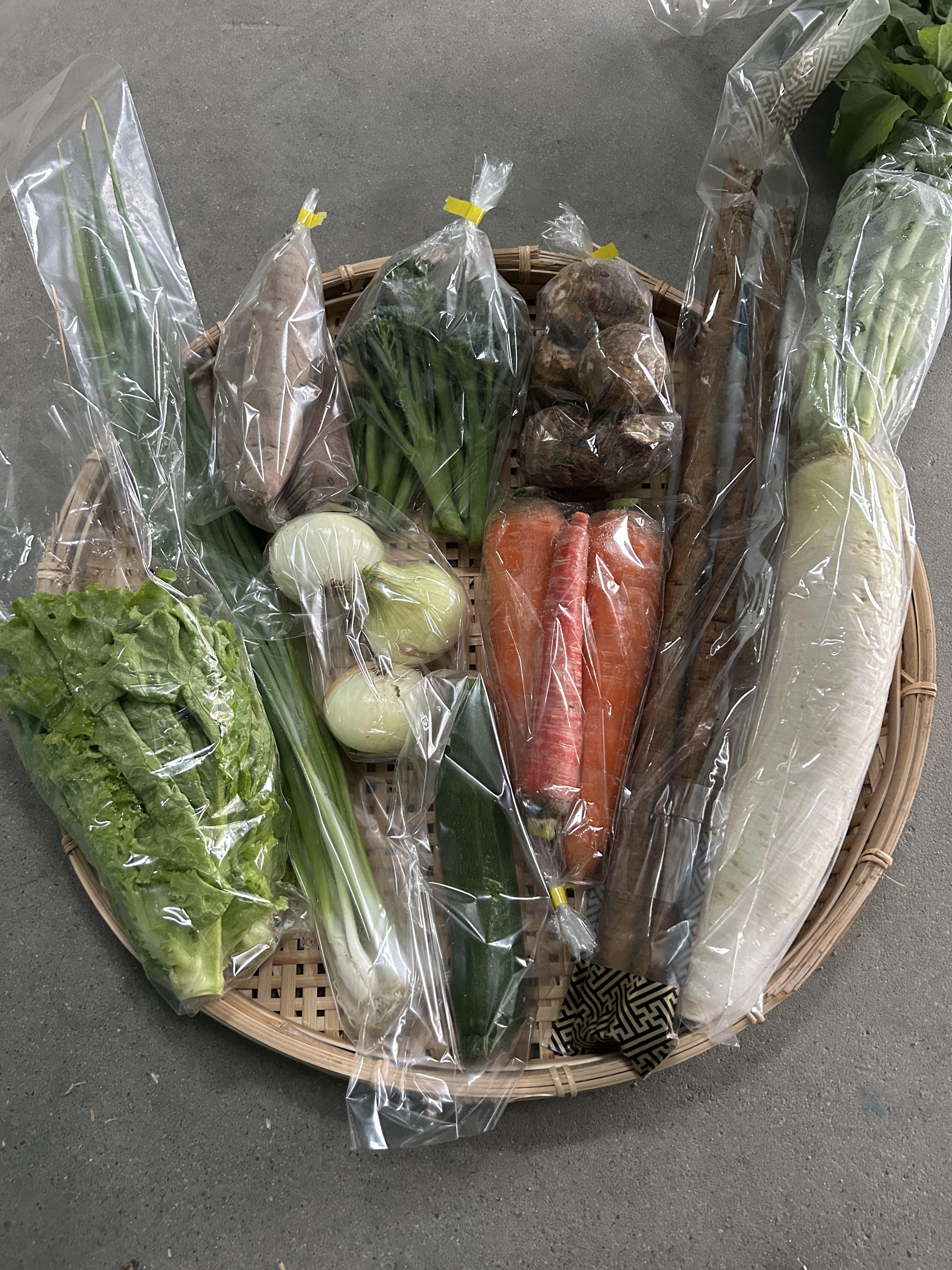 スティックブロッコリー、グリーンリーフレタス、青ネギ、大根、ズッキーニ、ごぼう、玉ねぎ、人参、里芋、さつまいも(紅あずま)