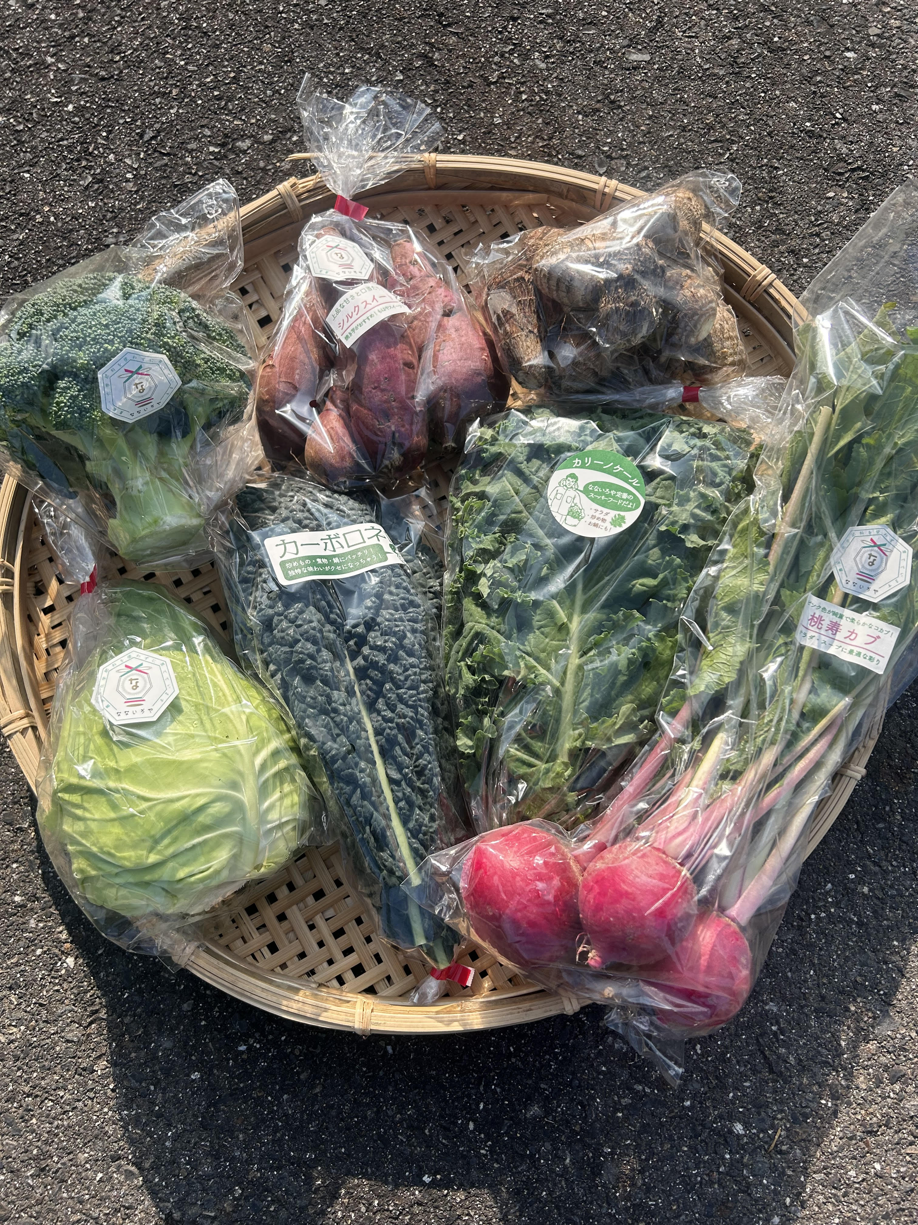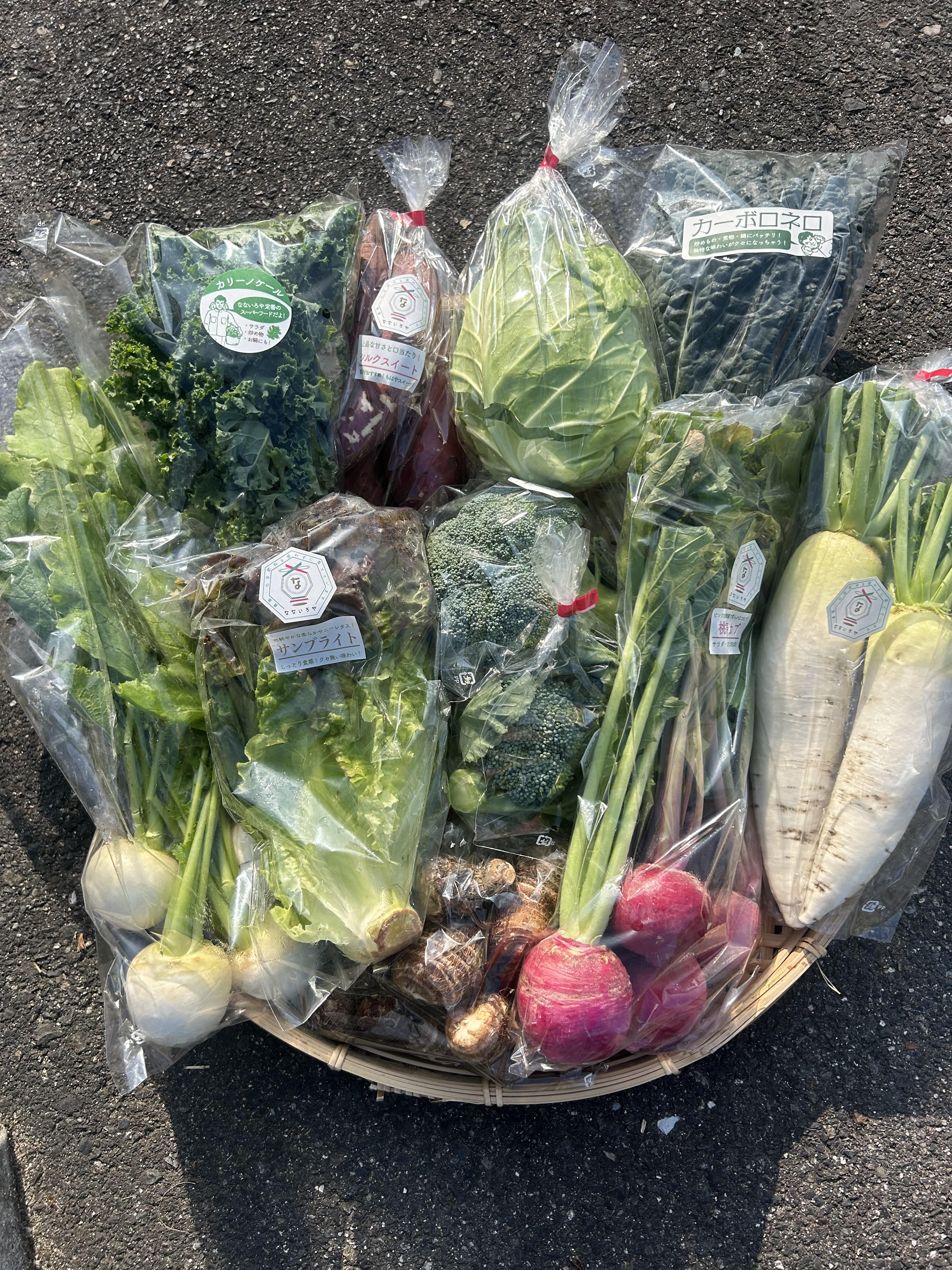 カリーノケール、カーボロネロ、ブロッコリー、とんがりキャベツ、桃寿カブ、さつまいも(シルクスイート)、里芋