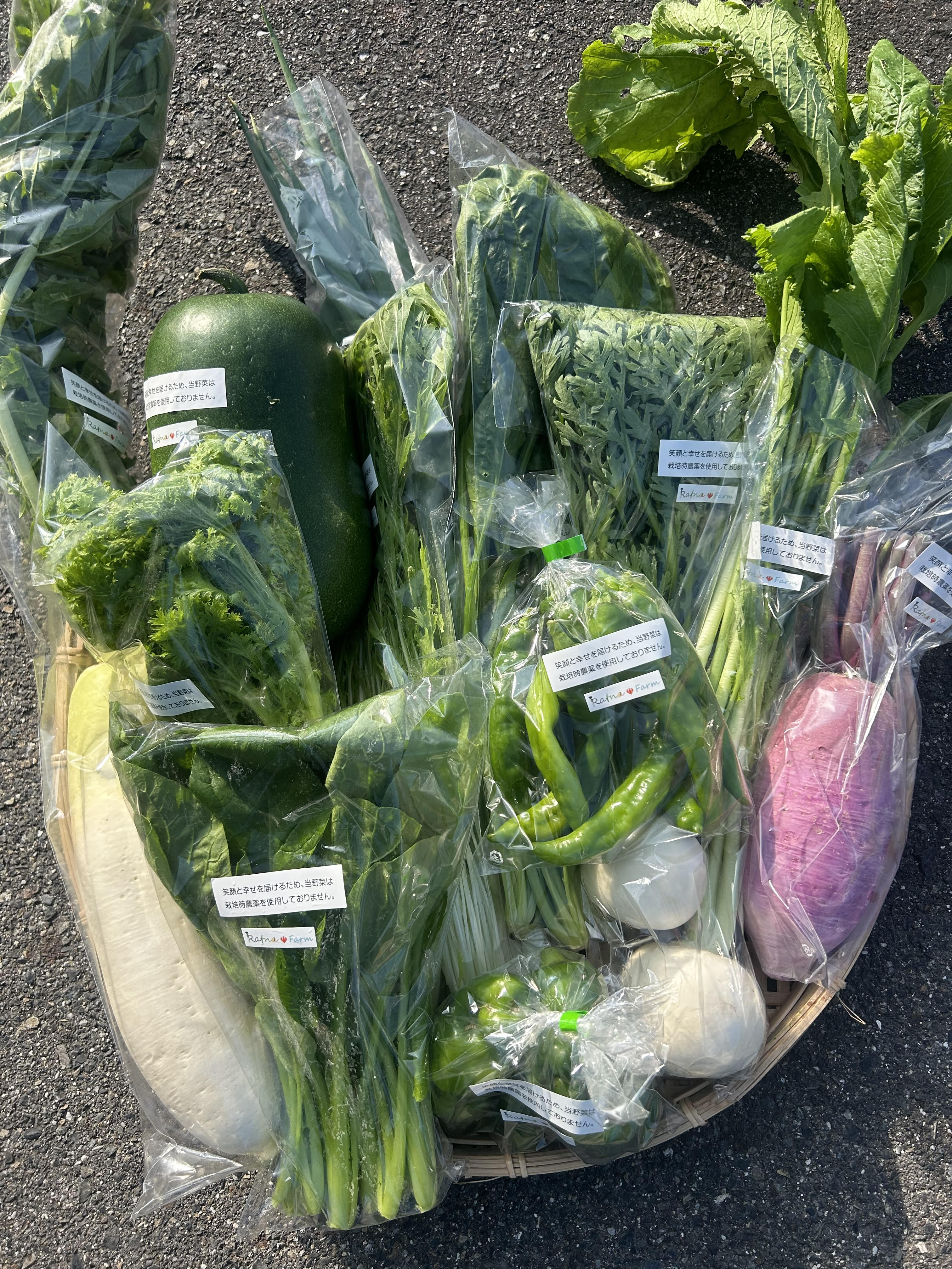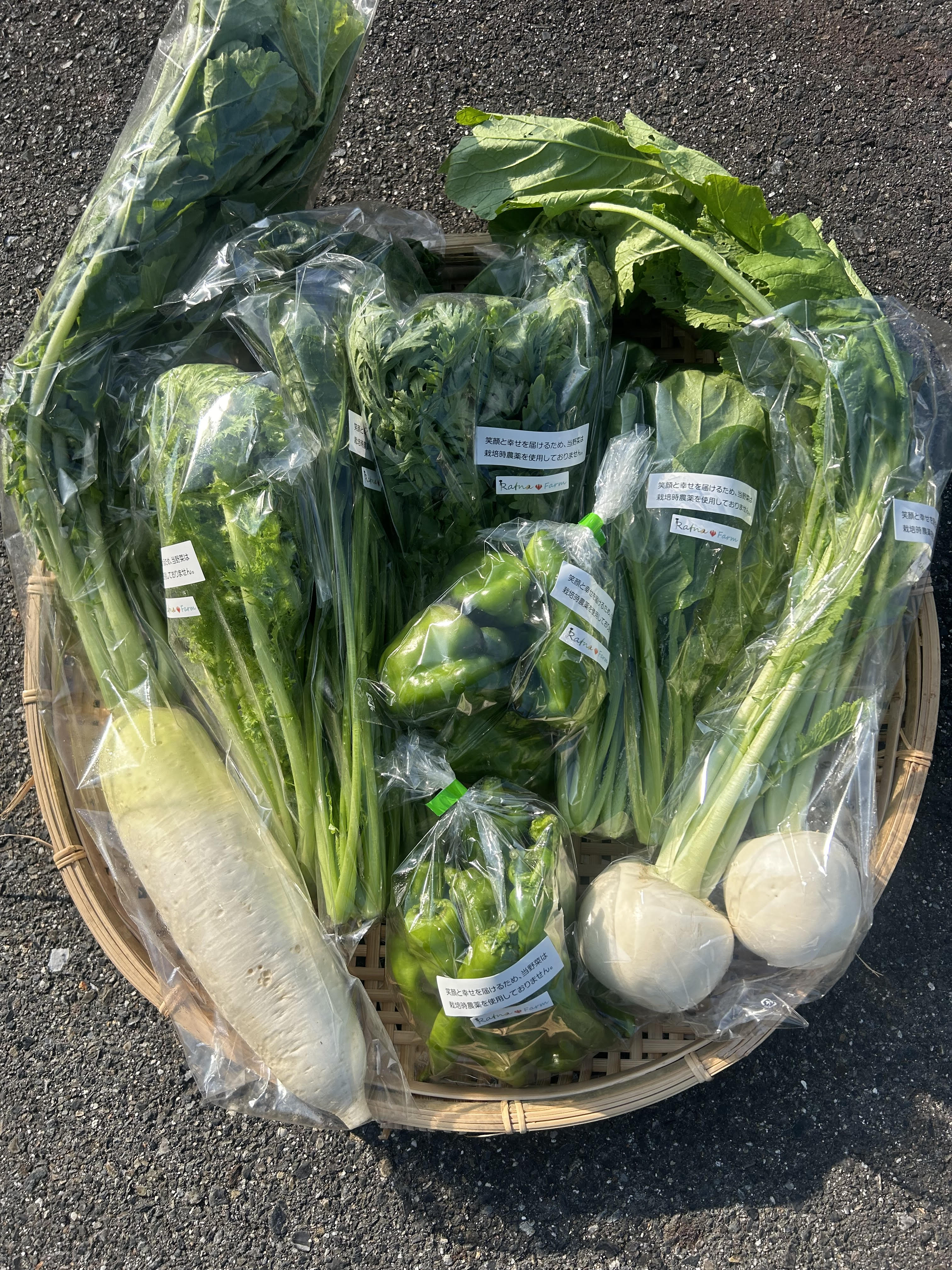 大根、ほうれん草、冬瓜、わさび菜、青ネギ、小松菜、ピーマン、万願寺とうがらし、小カブ、春菊、水菜、カラー大根