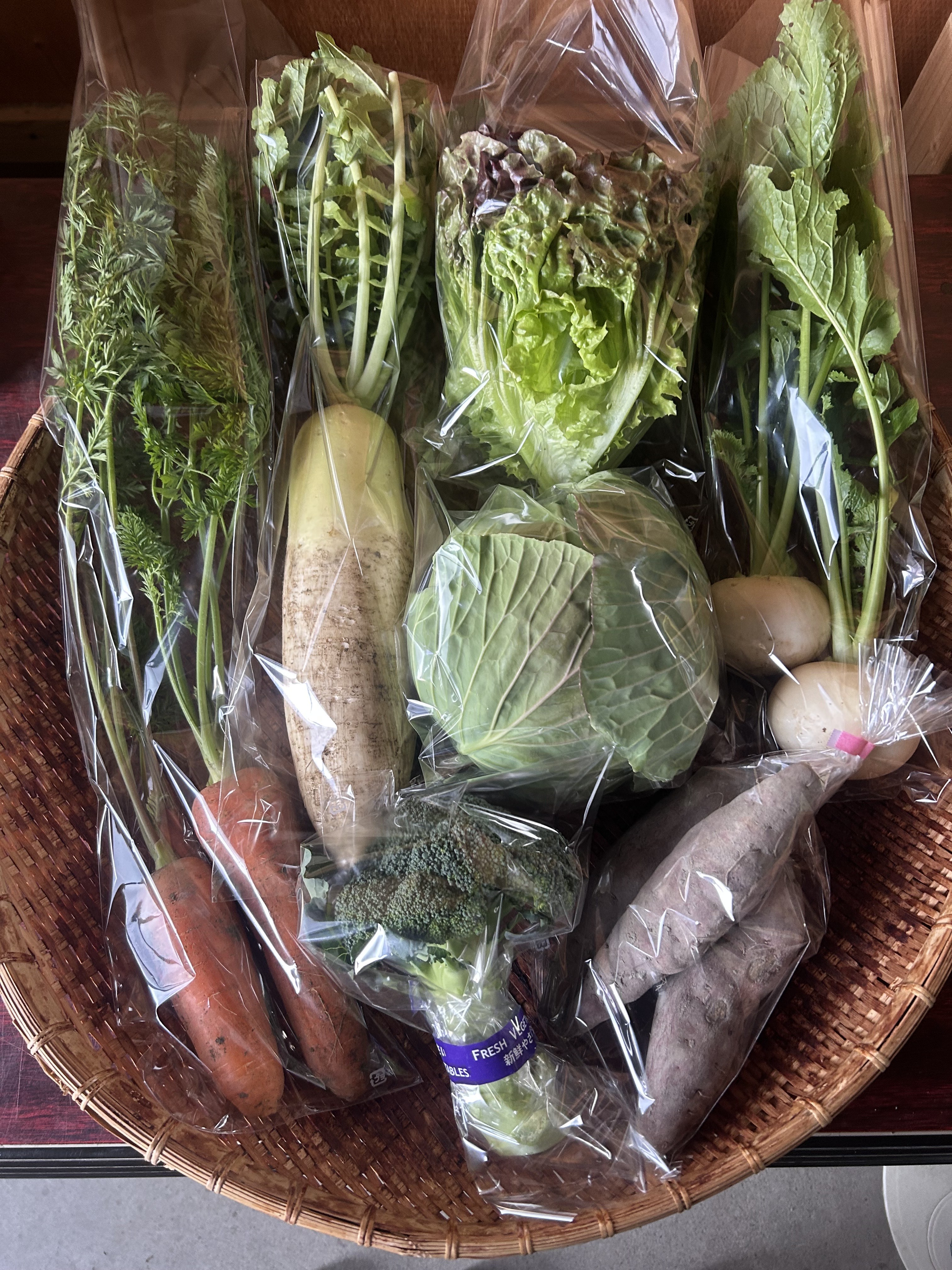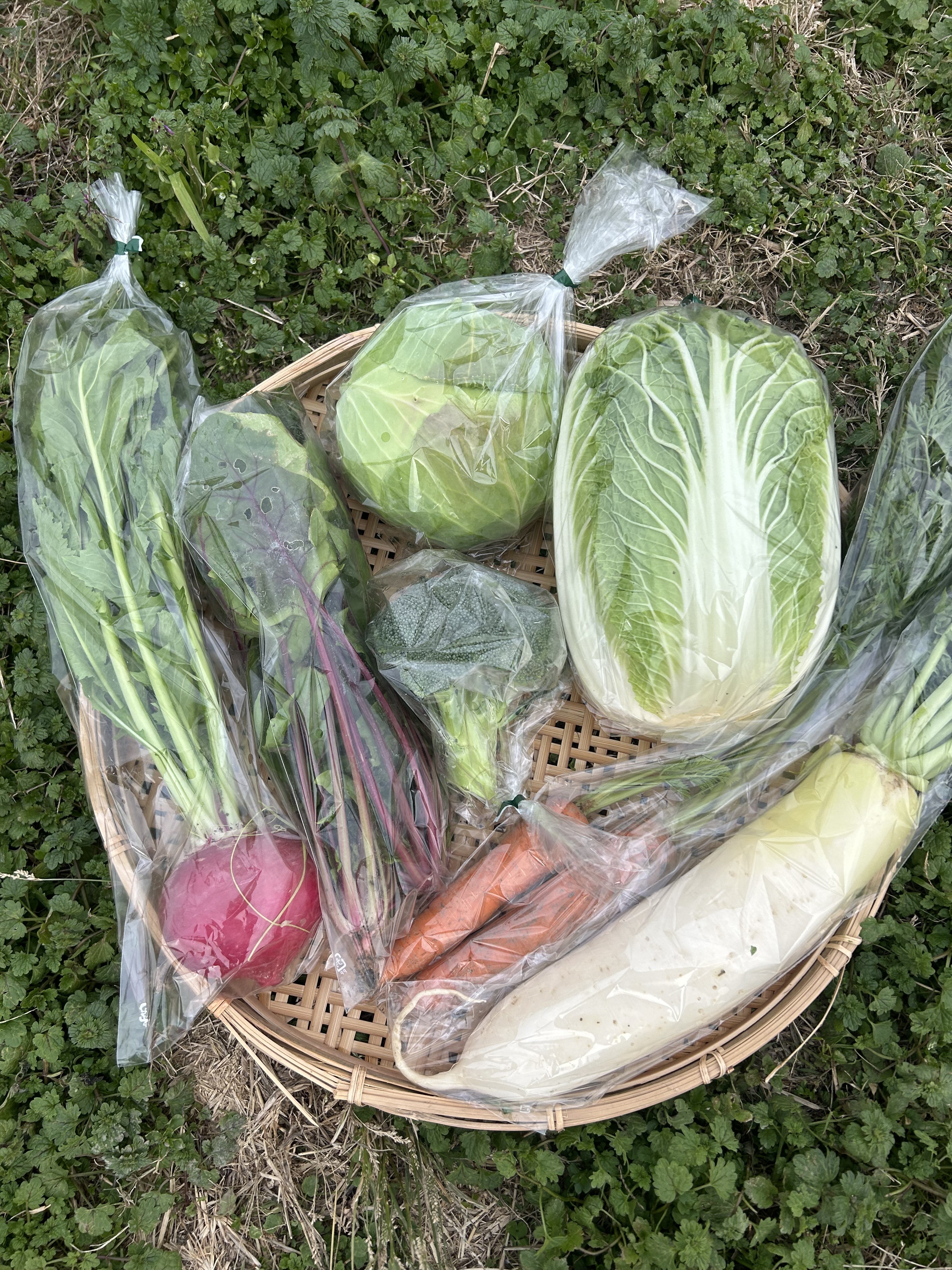 キャベツ、白菜(オレンジクイーン)、大根、人参、ゆるぎかぶ、赤軸ほうれん草、おばんざいケール、ブロッコリー
