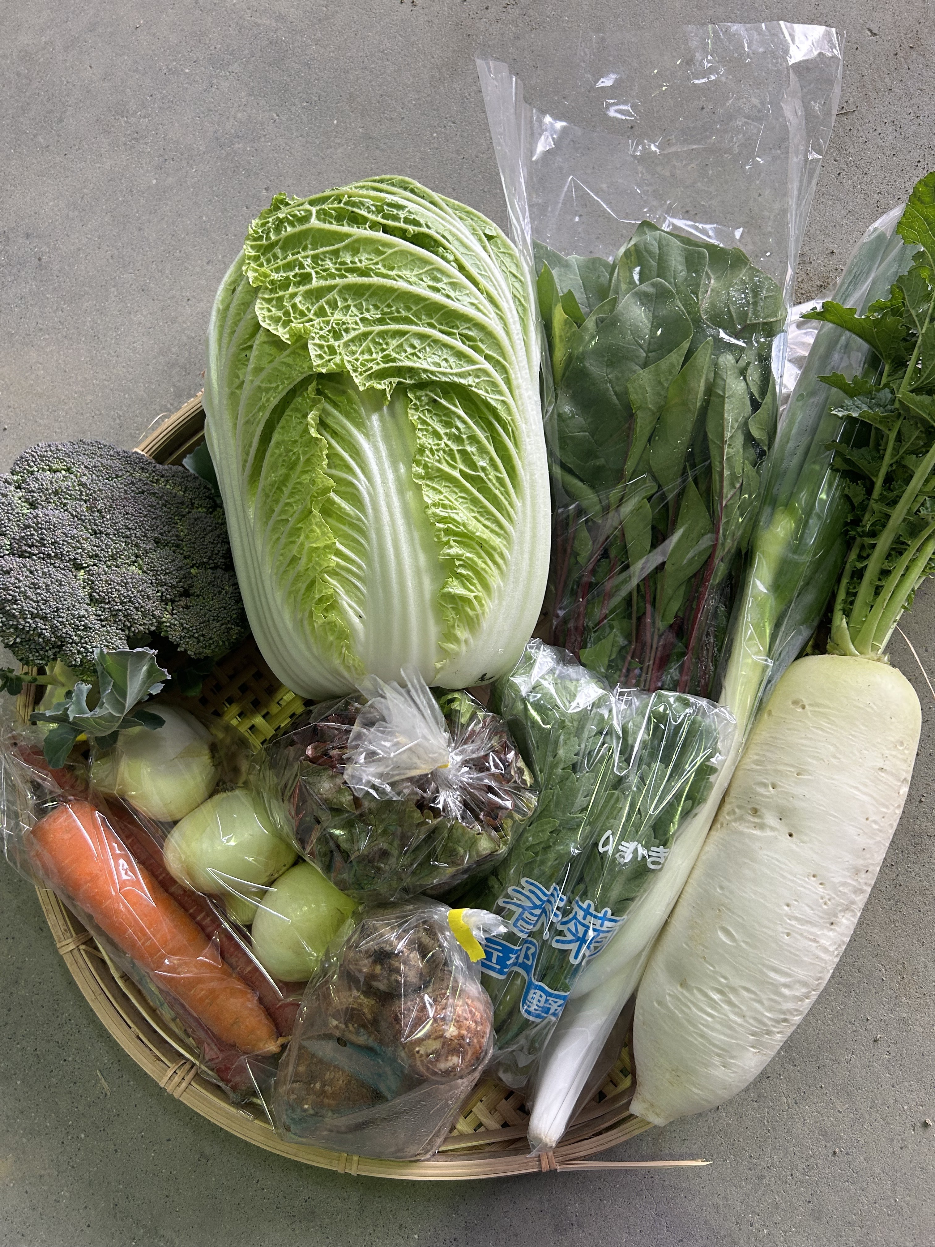 春菊、グリーンリーフレタス、ブロッコリー、白菜、太ねぎ、大根、玉ねぎ、人参、里芋