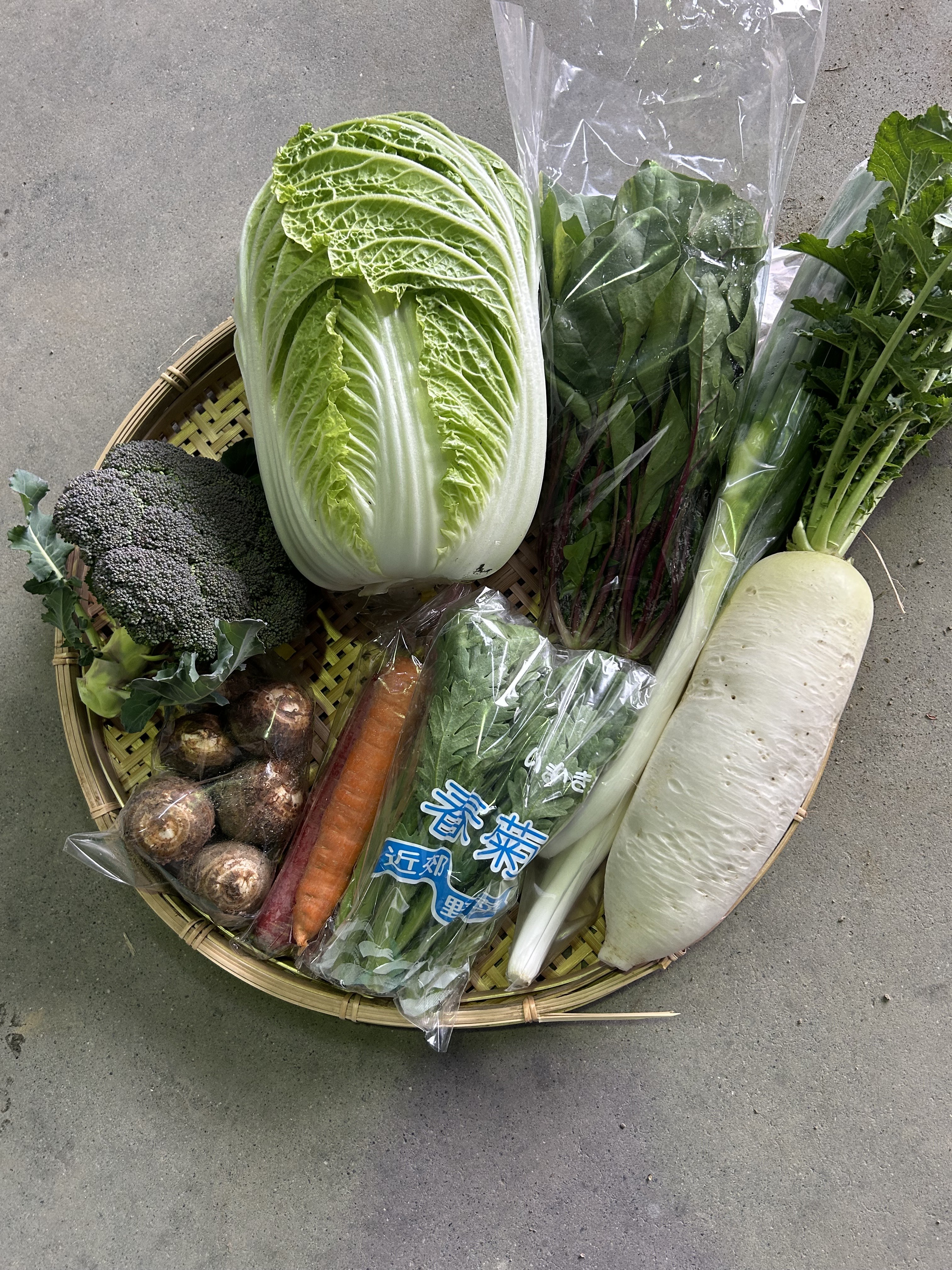 春菊、ブロッコリー、白菜、太ねぎ、大根、人参、里芋