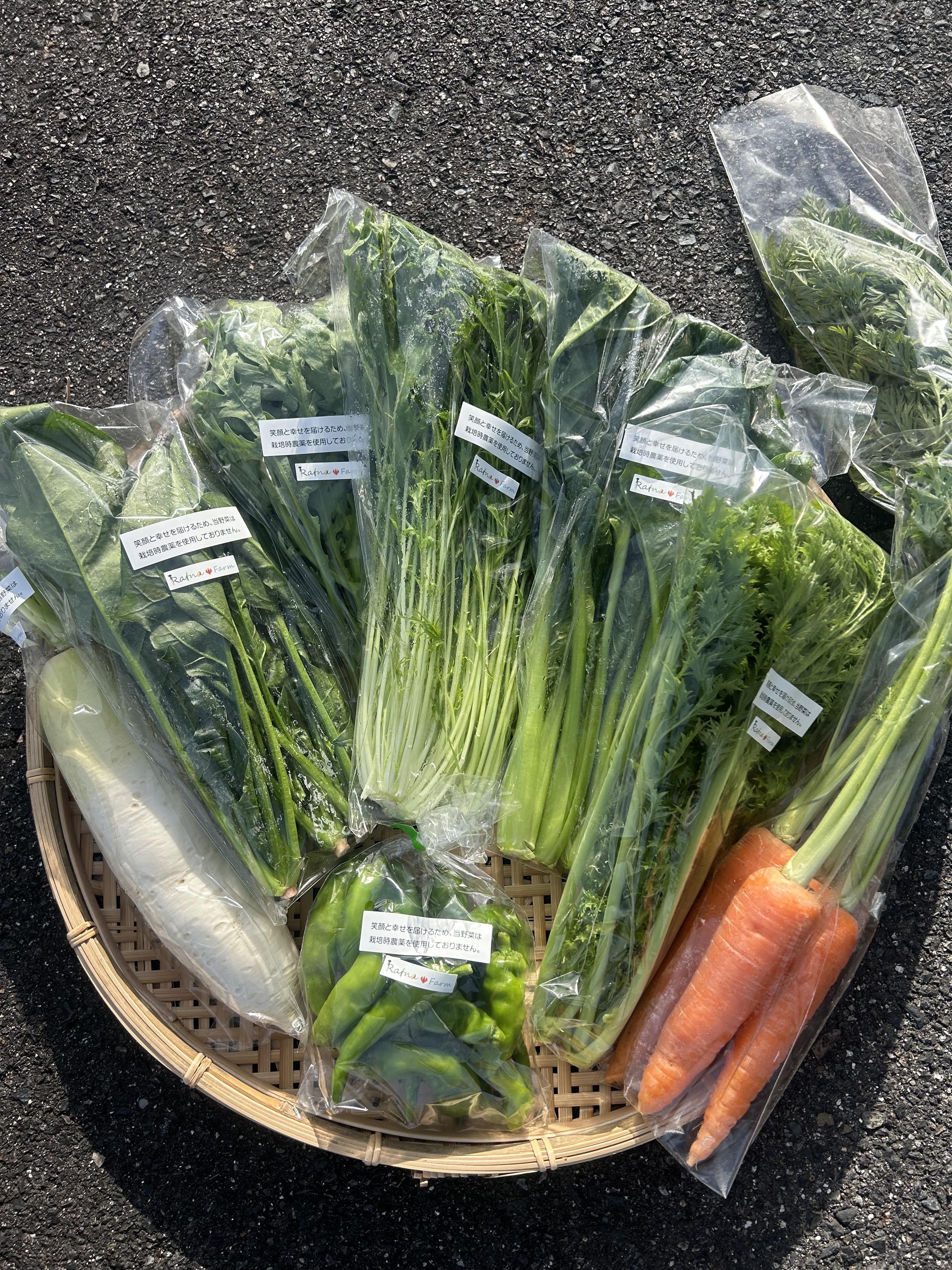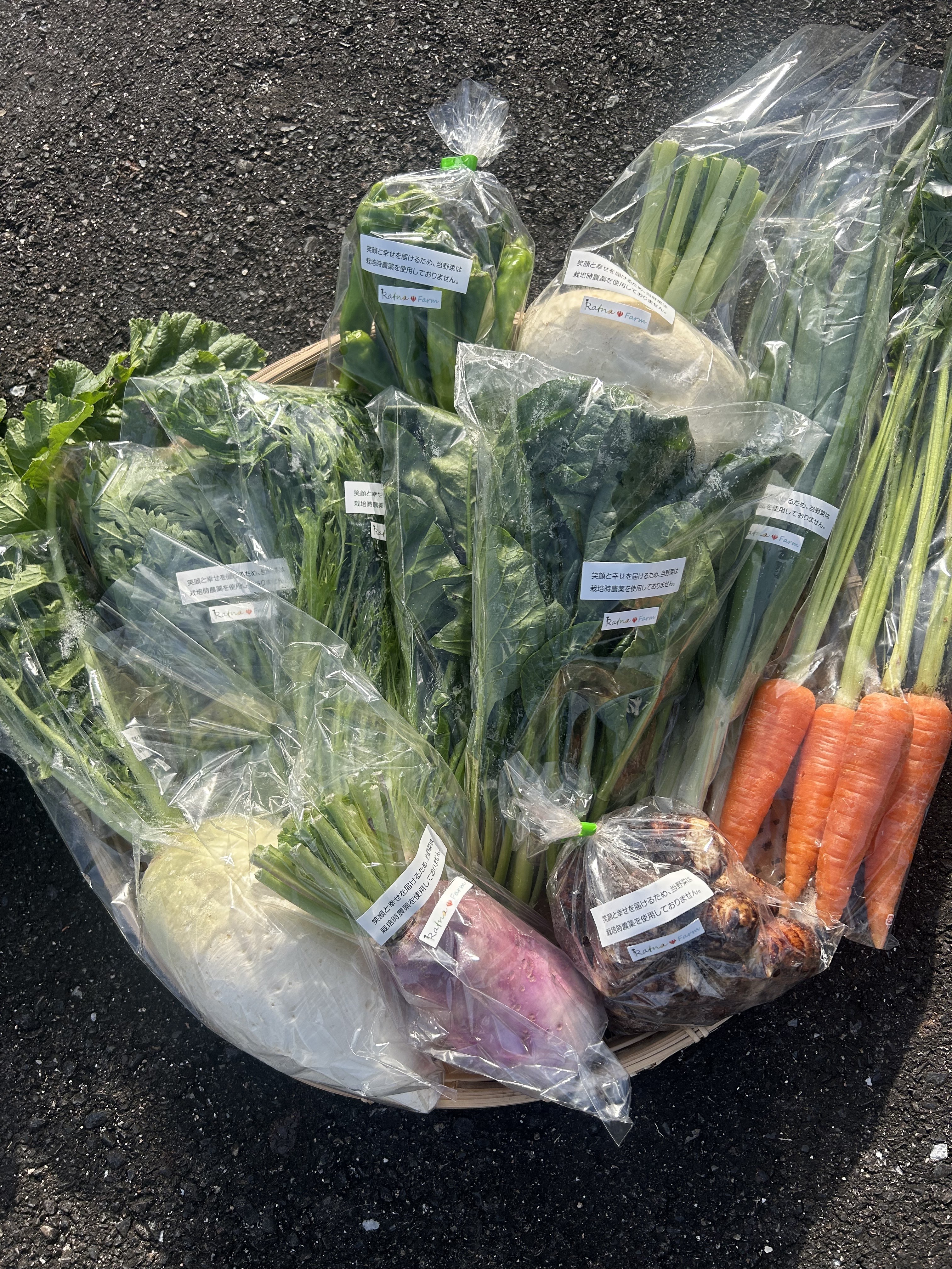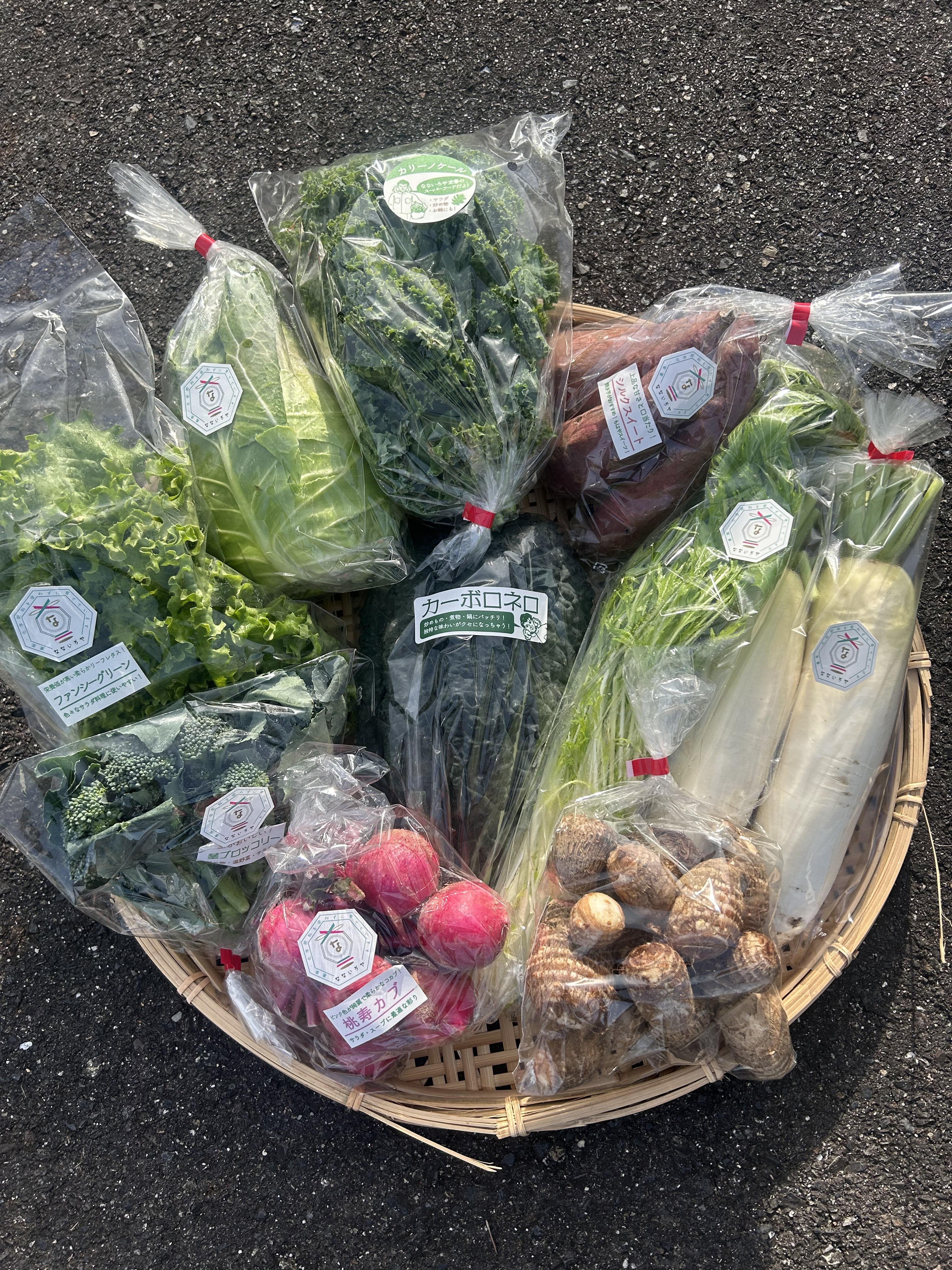 カリーノケール、カーボロネロ、茎ブロッコリー、とんがりキャベツ、ファンシーグリーン、水菜、桃寿カブ、おでん大根、サツマイモ(シルクスイート)、里芋