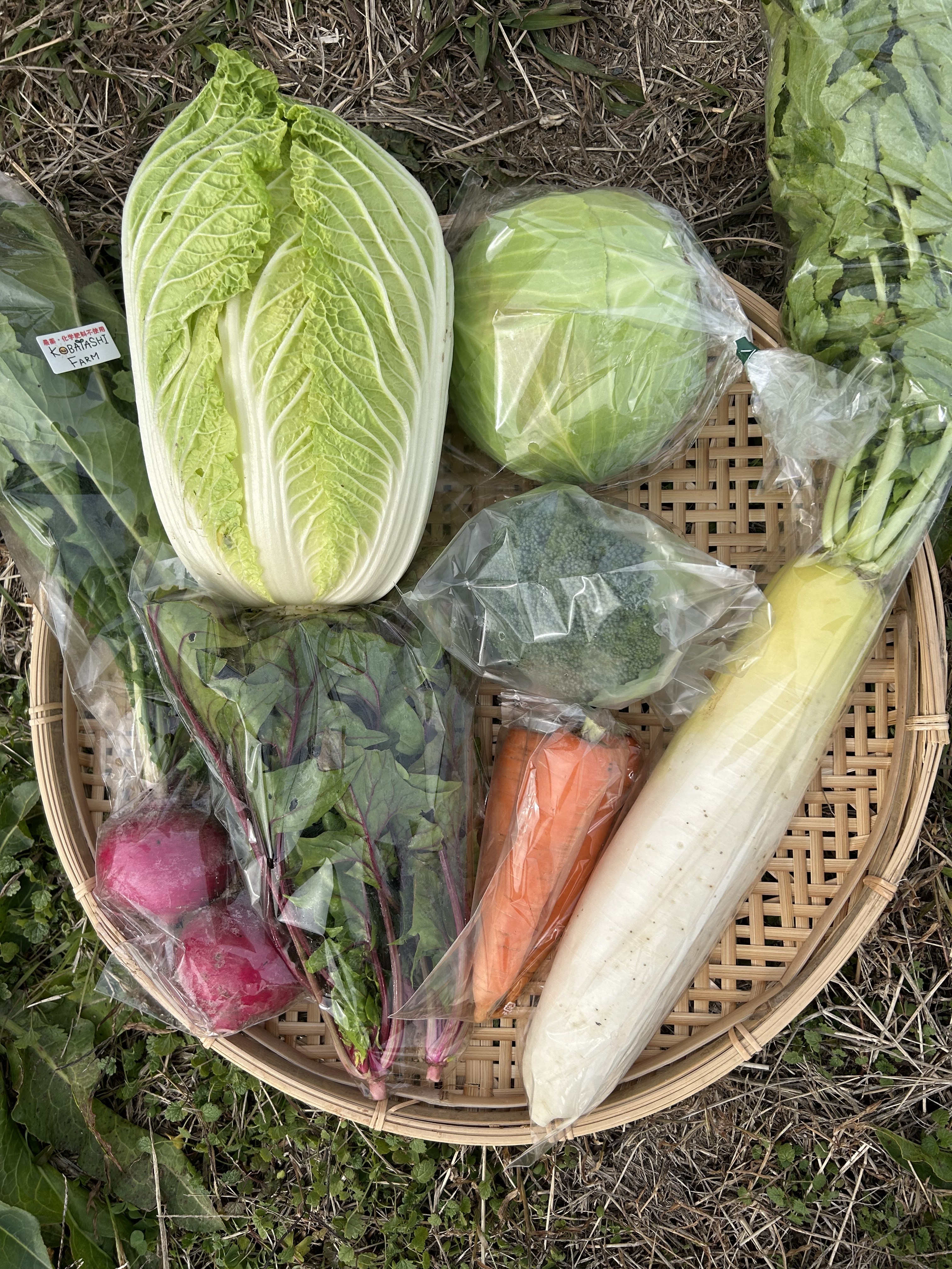 キャベツ、白菜(オレンジクイーン)、大根、人参、ゆるぎかぶ、赤軸ほうれん草、ブロッコリー