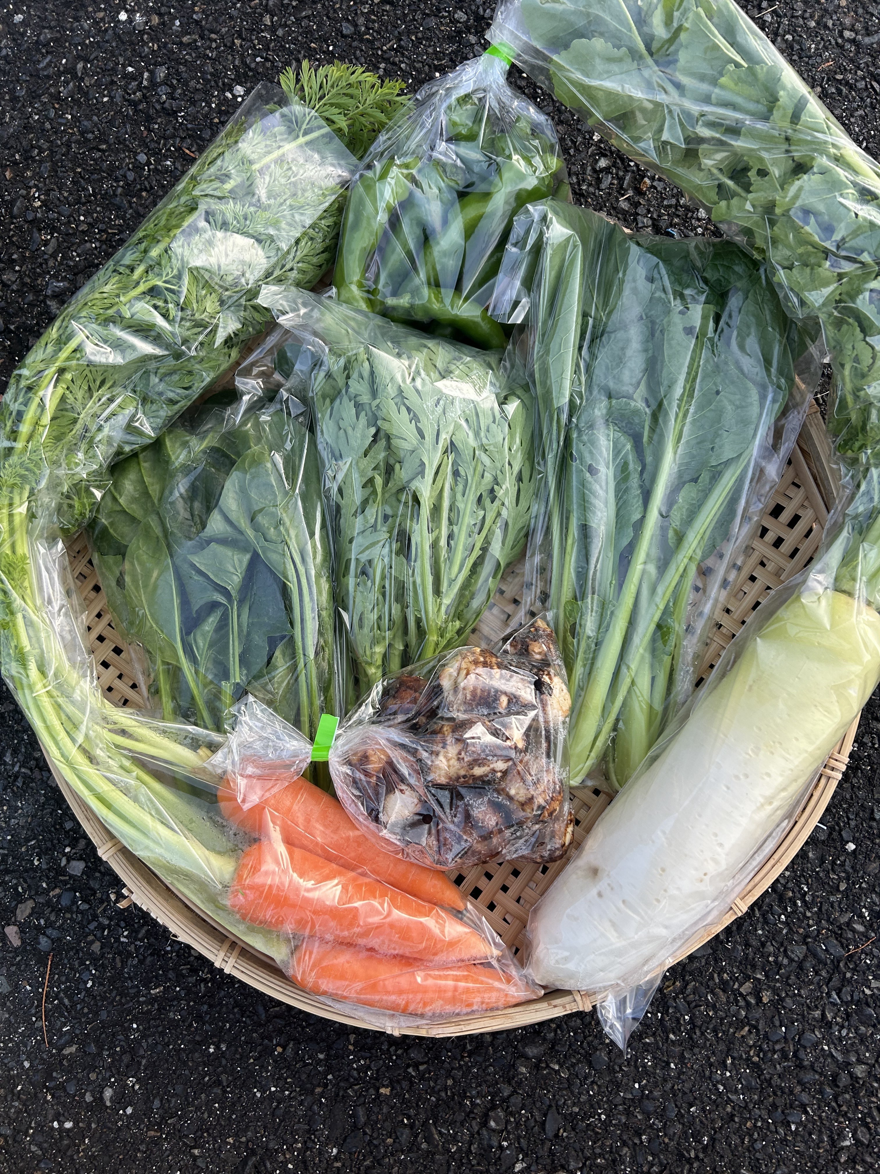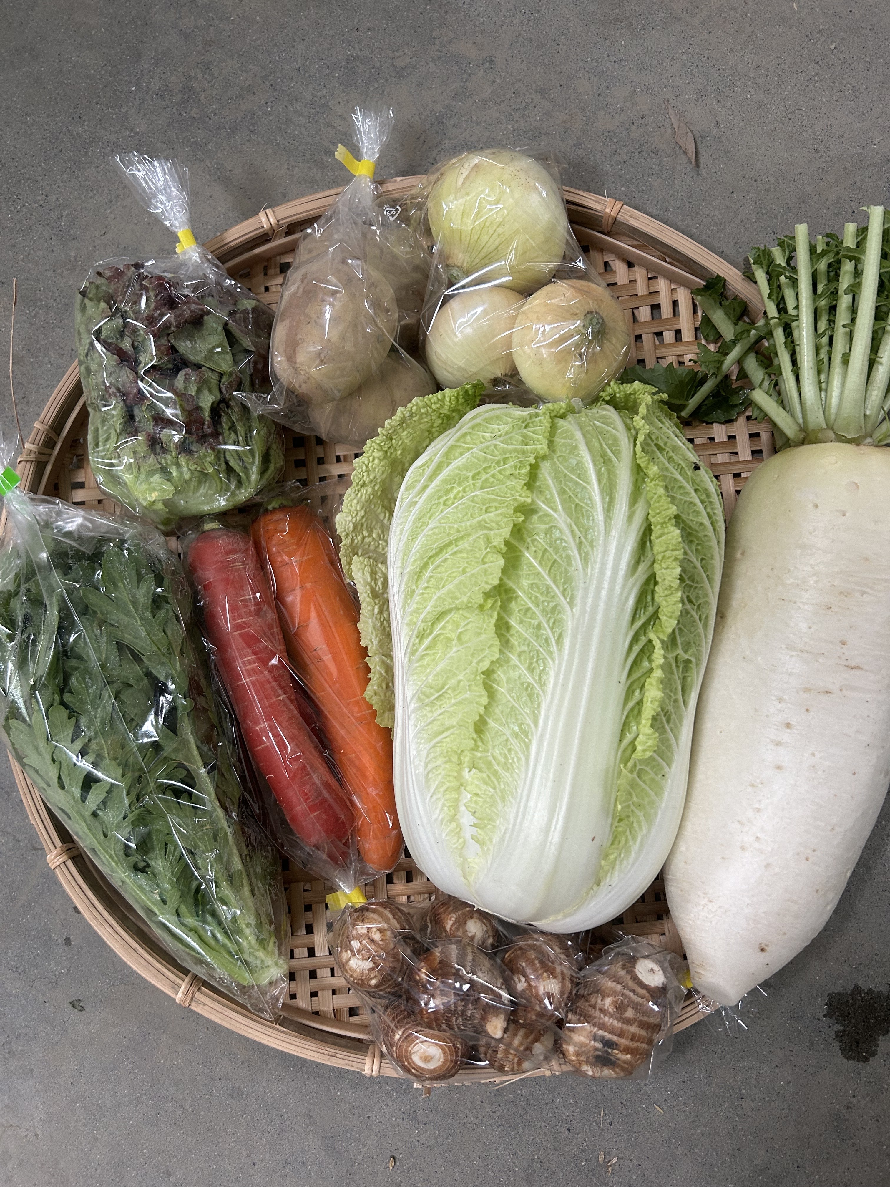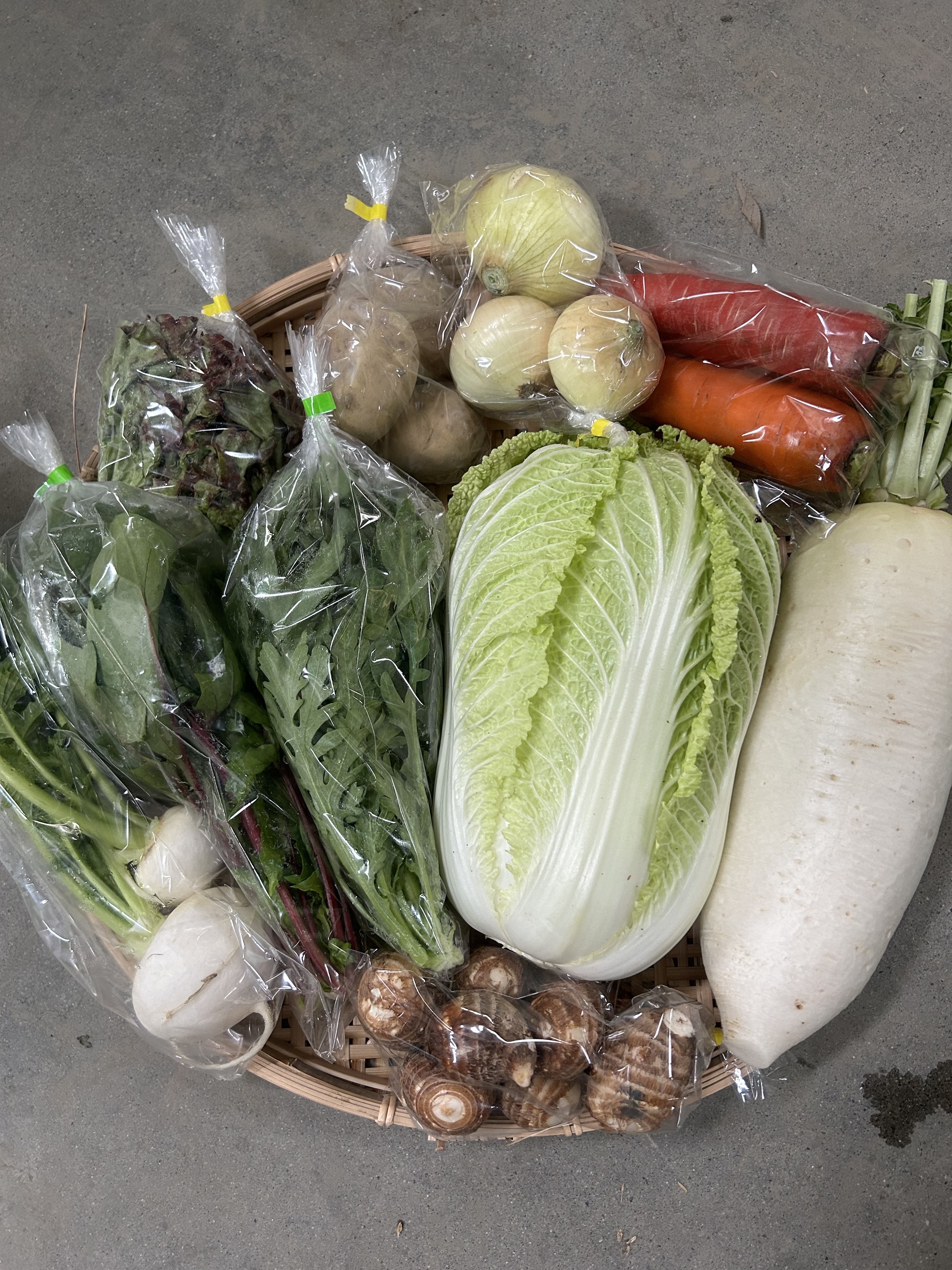 赤茎サラダほうれん草、春菊、グリーンリーフレタス、白かぶ、白菜、大根、玉ねぎ、人参、里芋、じゃがいも