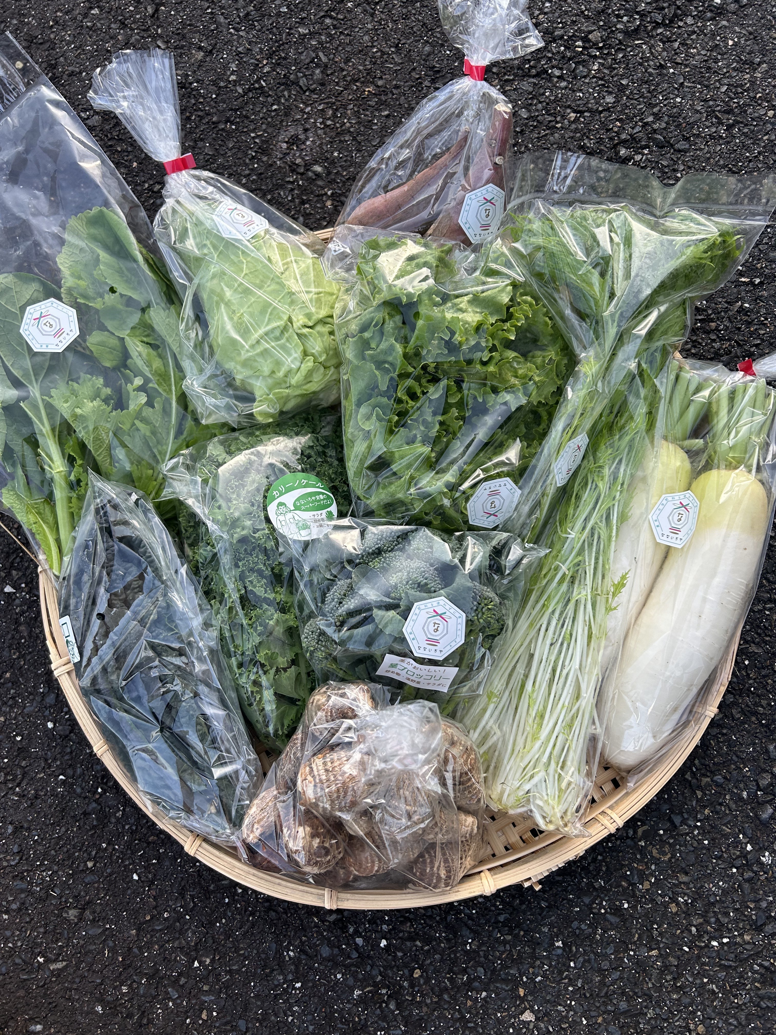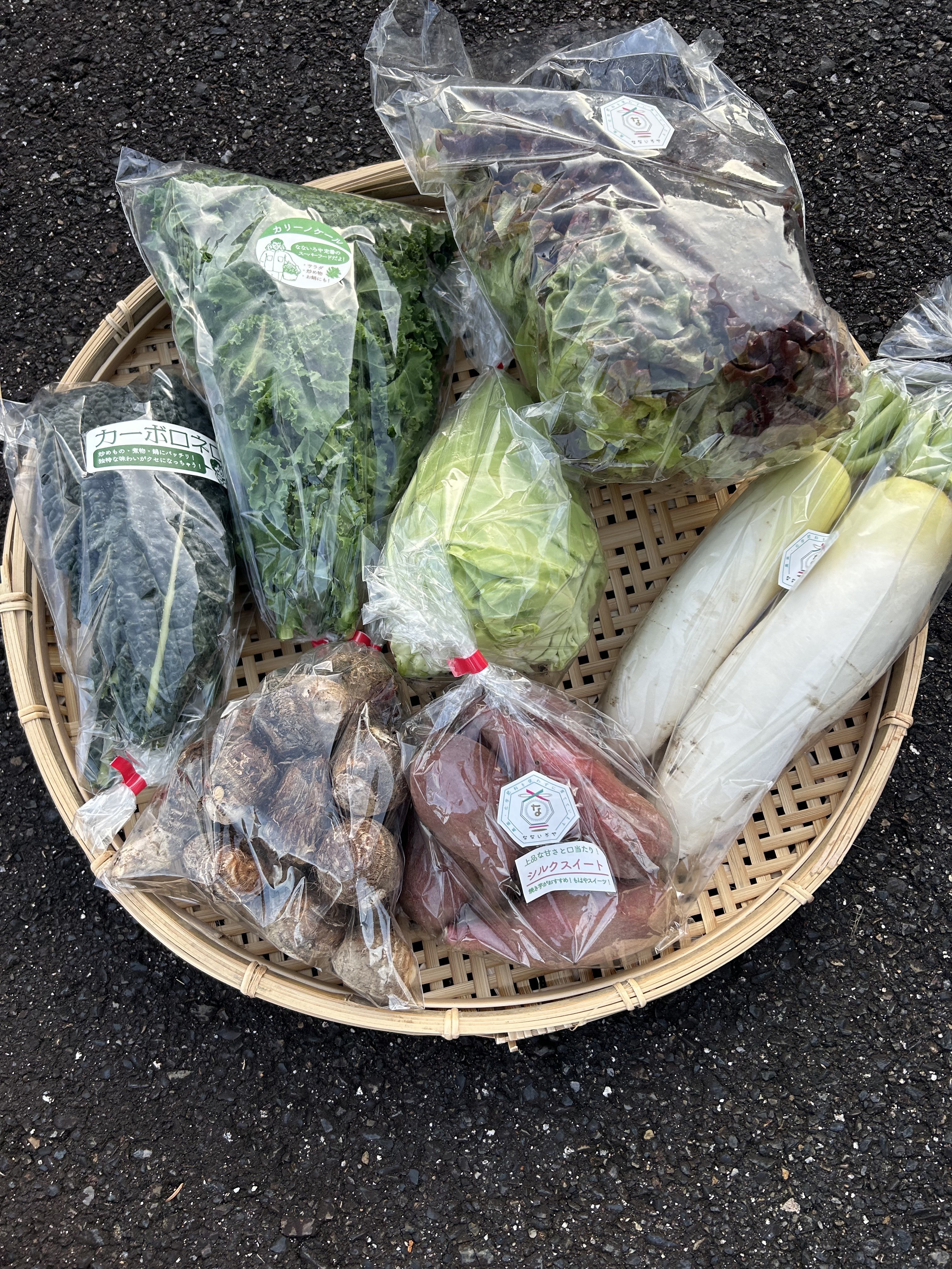カリーノケール、カーボロネロ、茎ブロッコリー、とんがりキャベツ、ファンシーグリーン、水菜、サラダ菜ミックス、おでん大根、サツマイモ(シルクスイート)、里芋