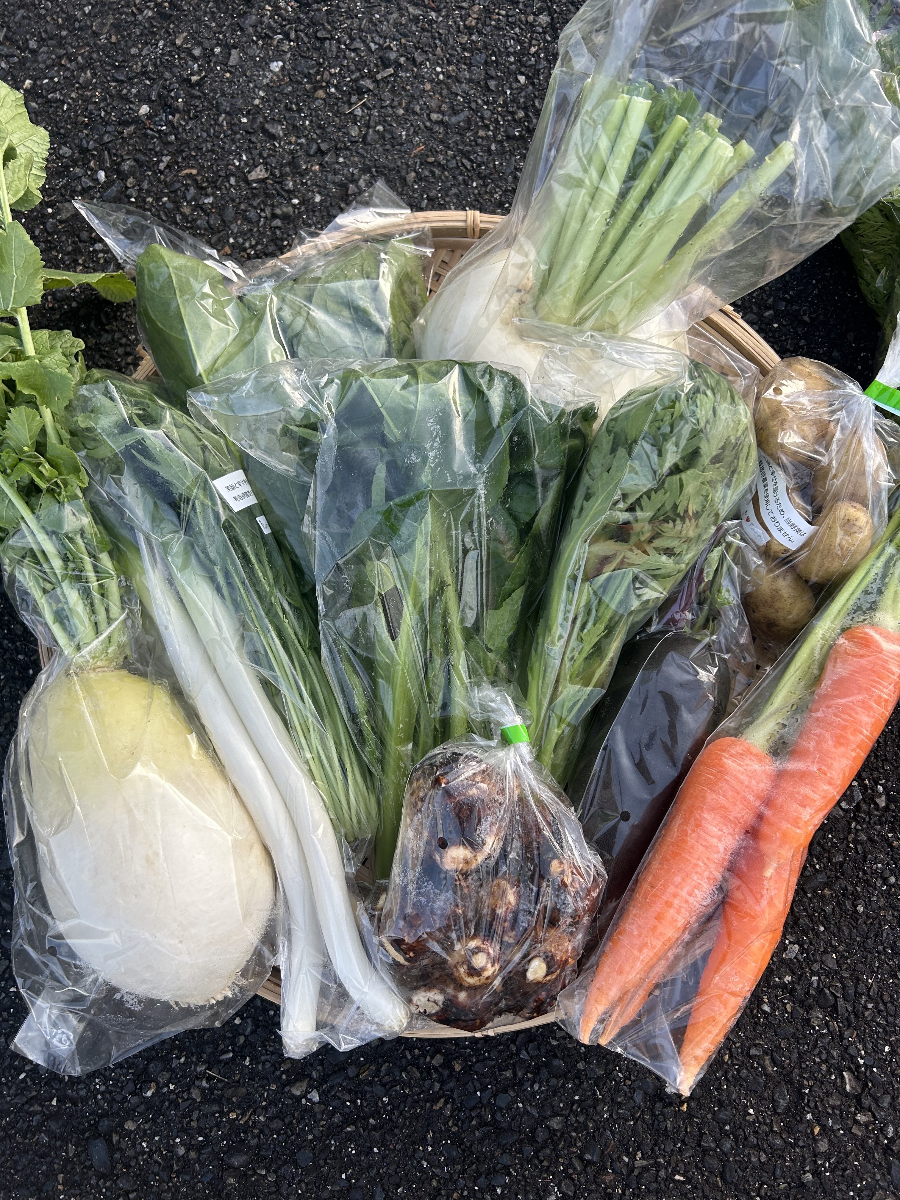 大根、ほうれん草、小松菜、里芋、水菜、人参、カブ、じゃがいも(コロール)、春菊、白ネギ、黒大根