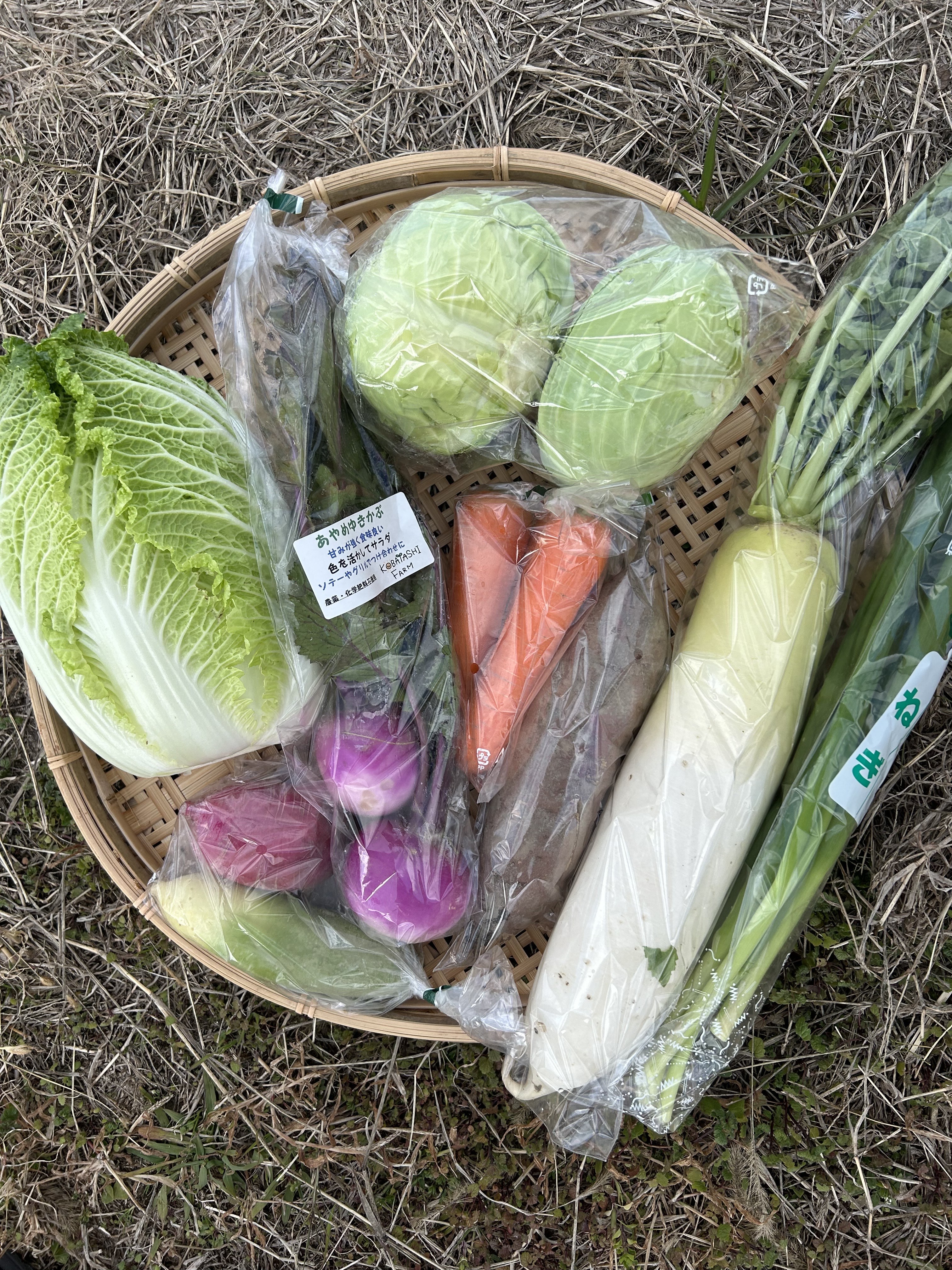 キャベツ、白菜、大根、人参、あやめ雪カブ、カラー大根、ねぎ、さつまいも(べにはるか)