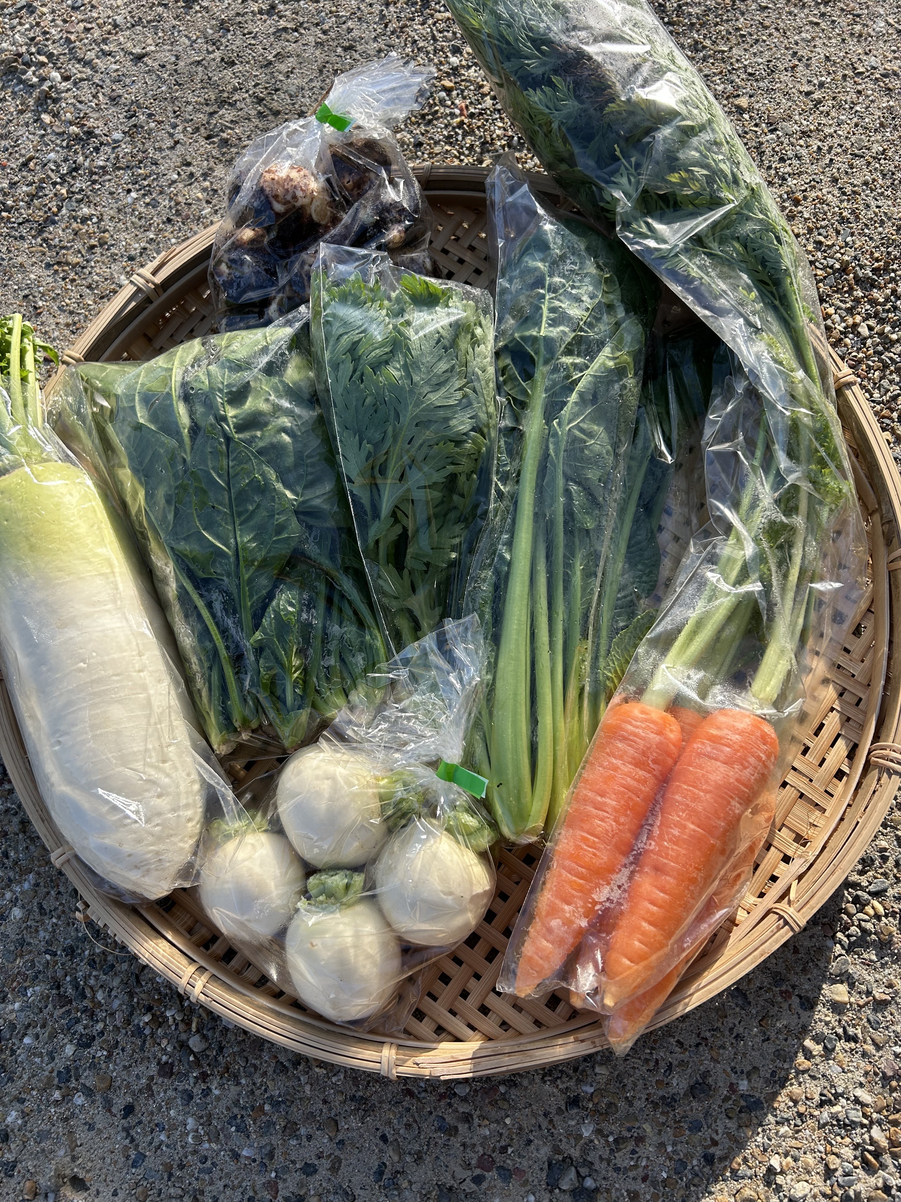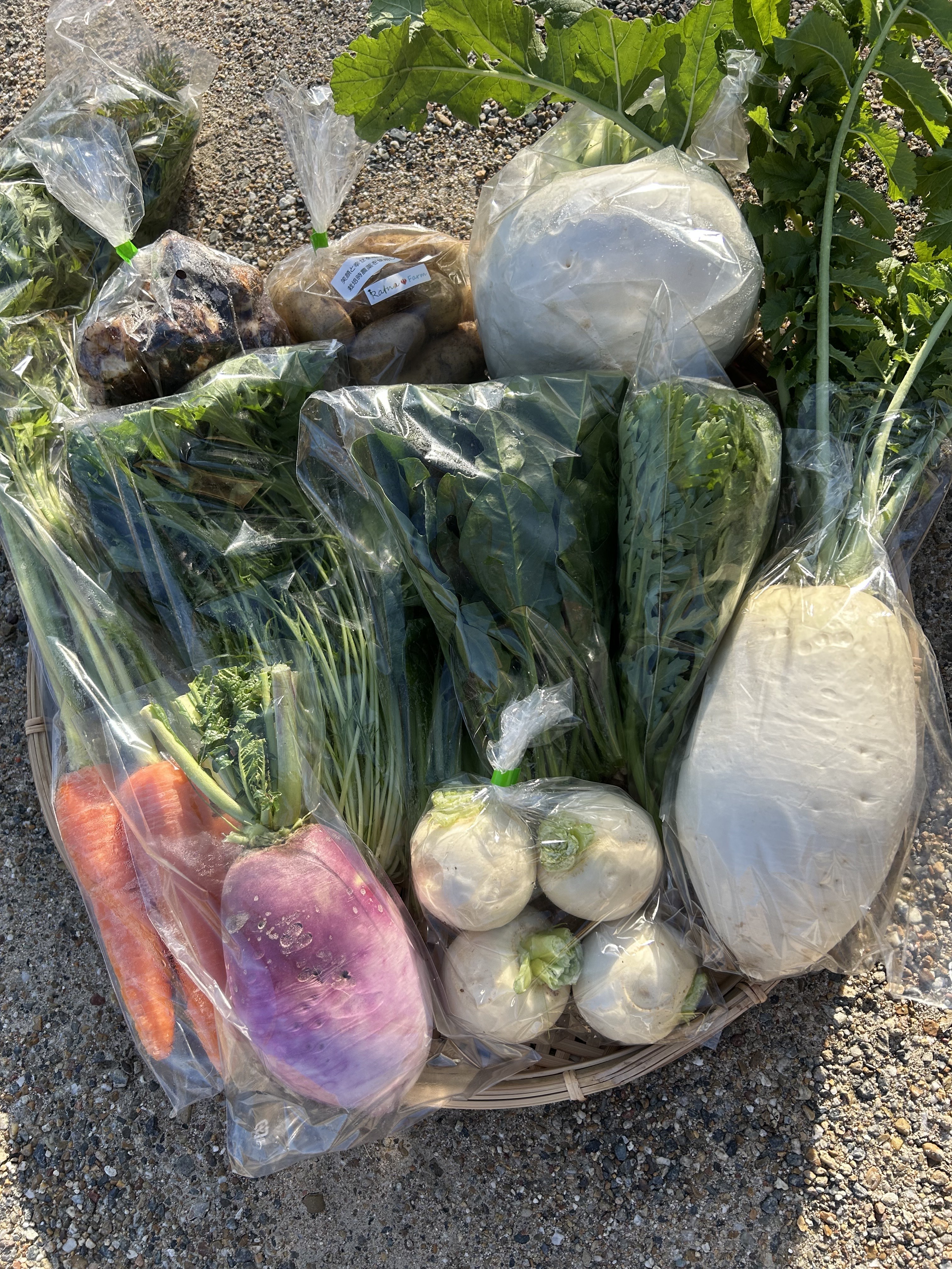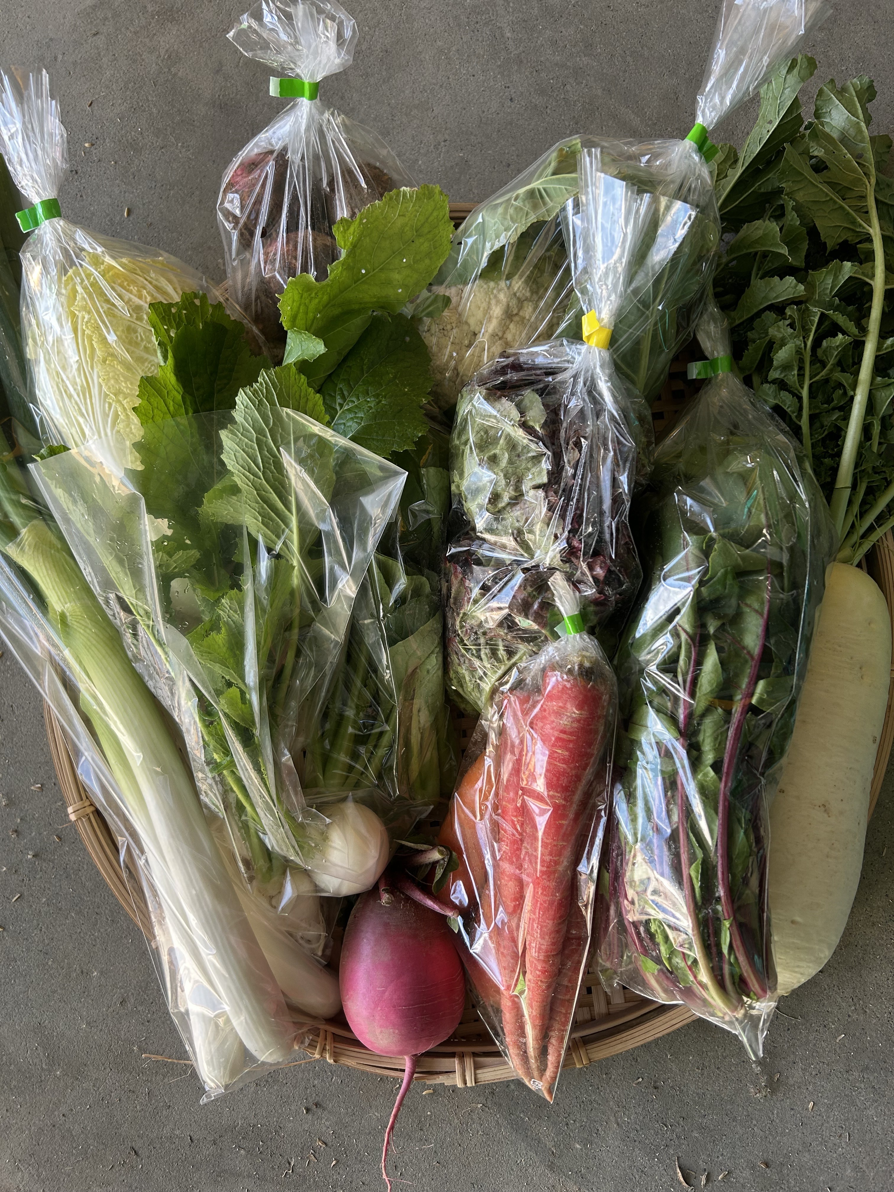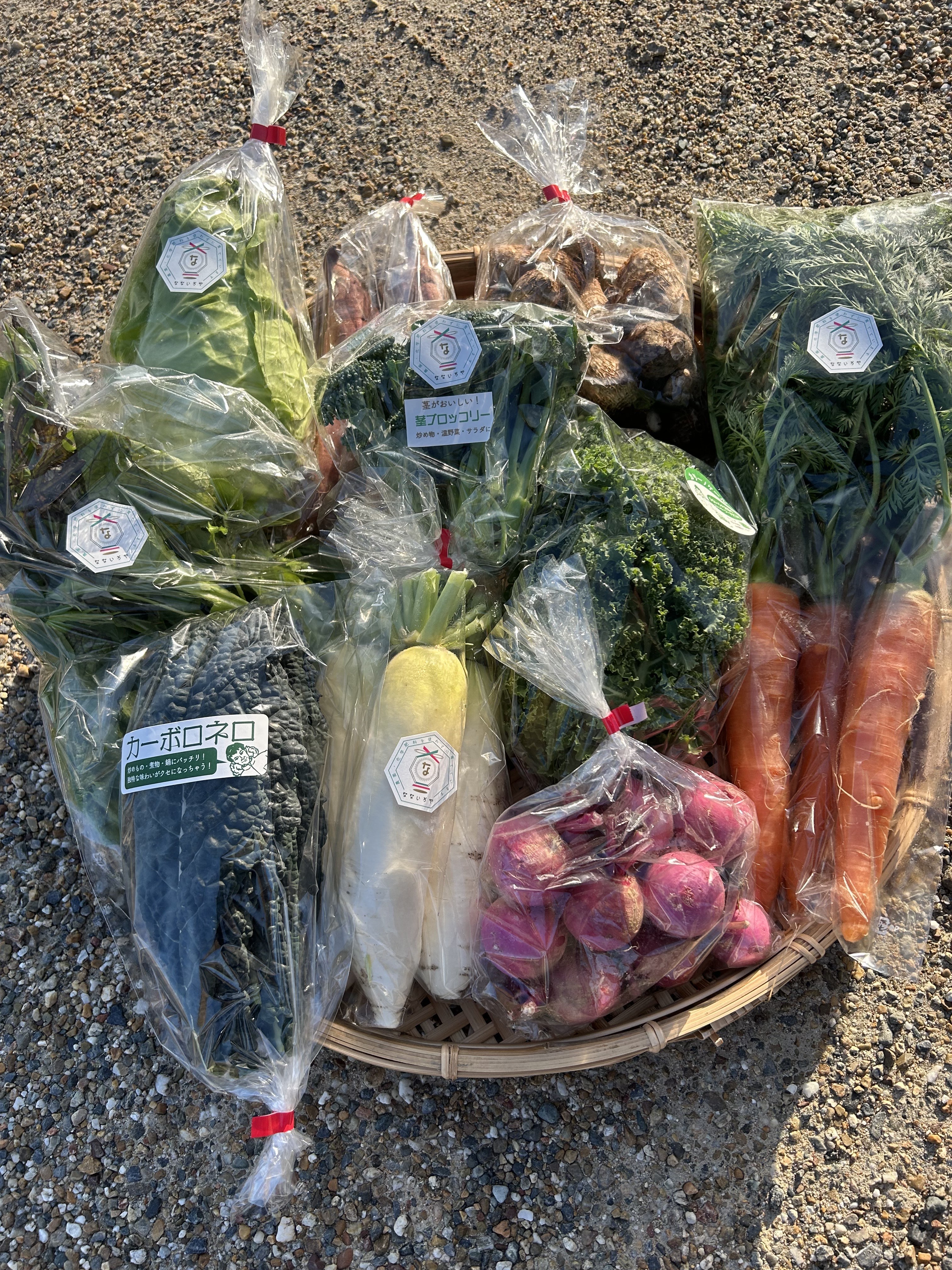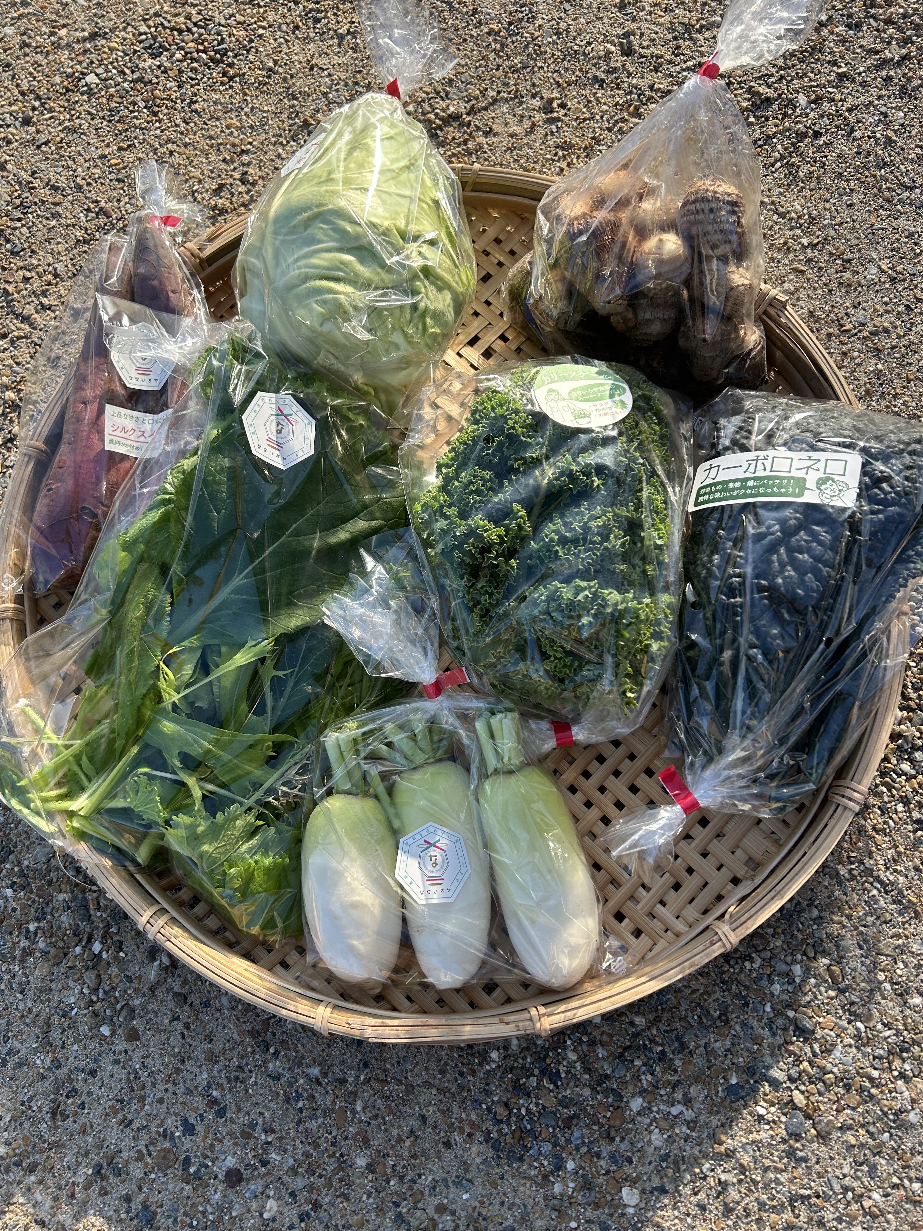 カリーノケール、カーボロネロ、茎ブロッコリー、とんがりキャベツ、サラダ菜ミックス、人参、桃寿カブ、おでん大根、サツマイモ(シルクスイート)、里芋