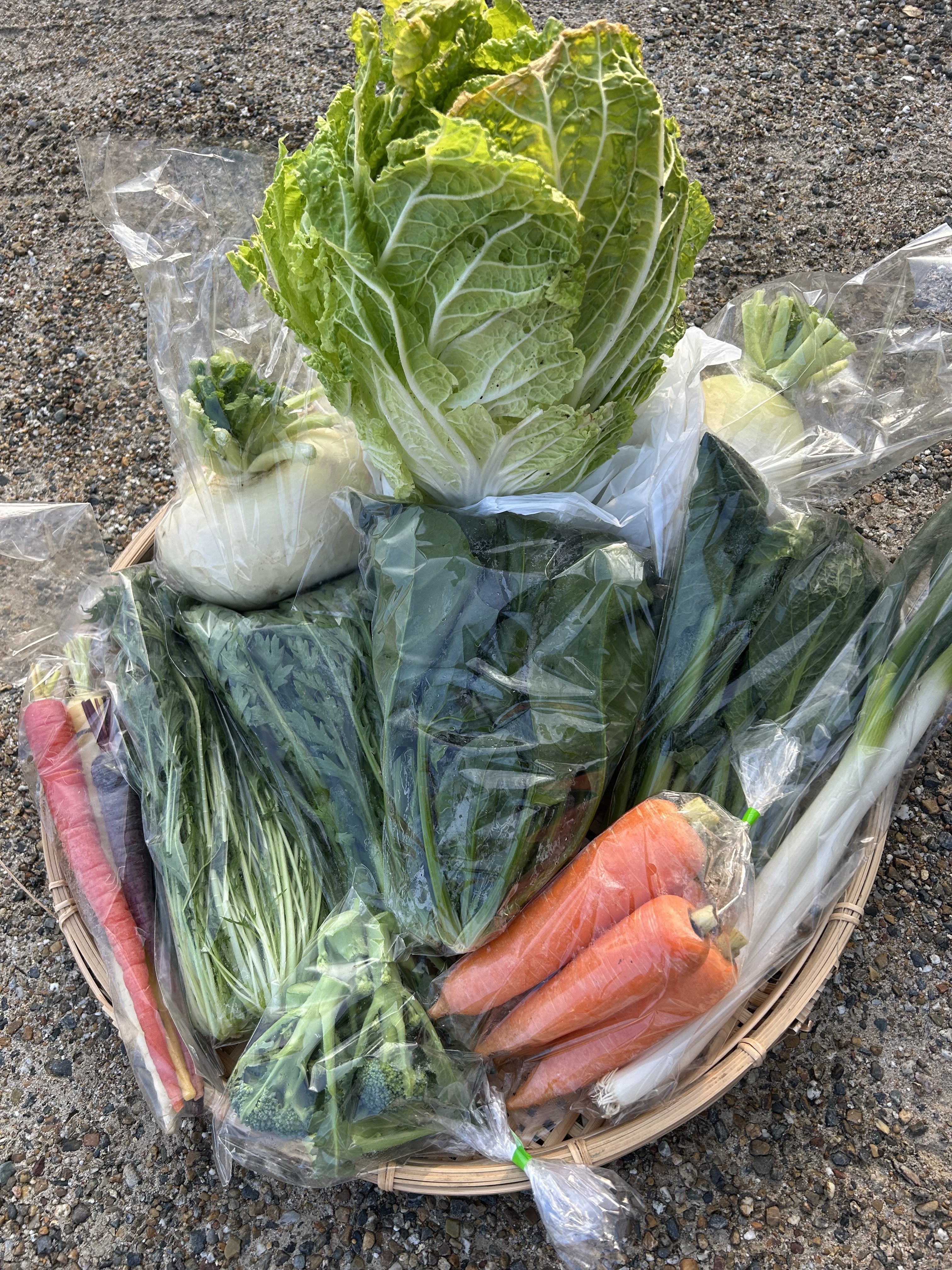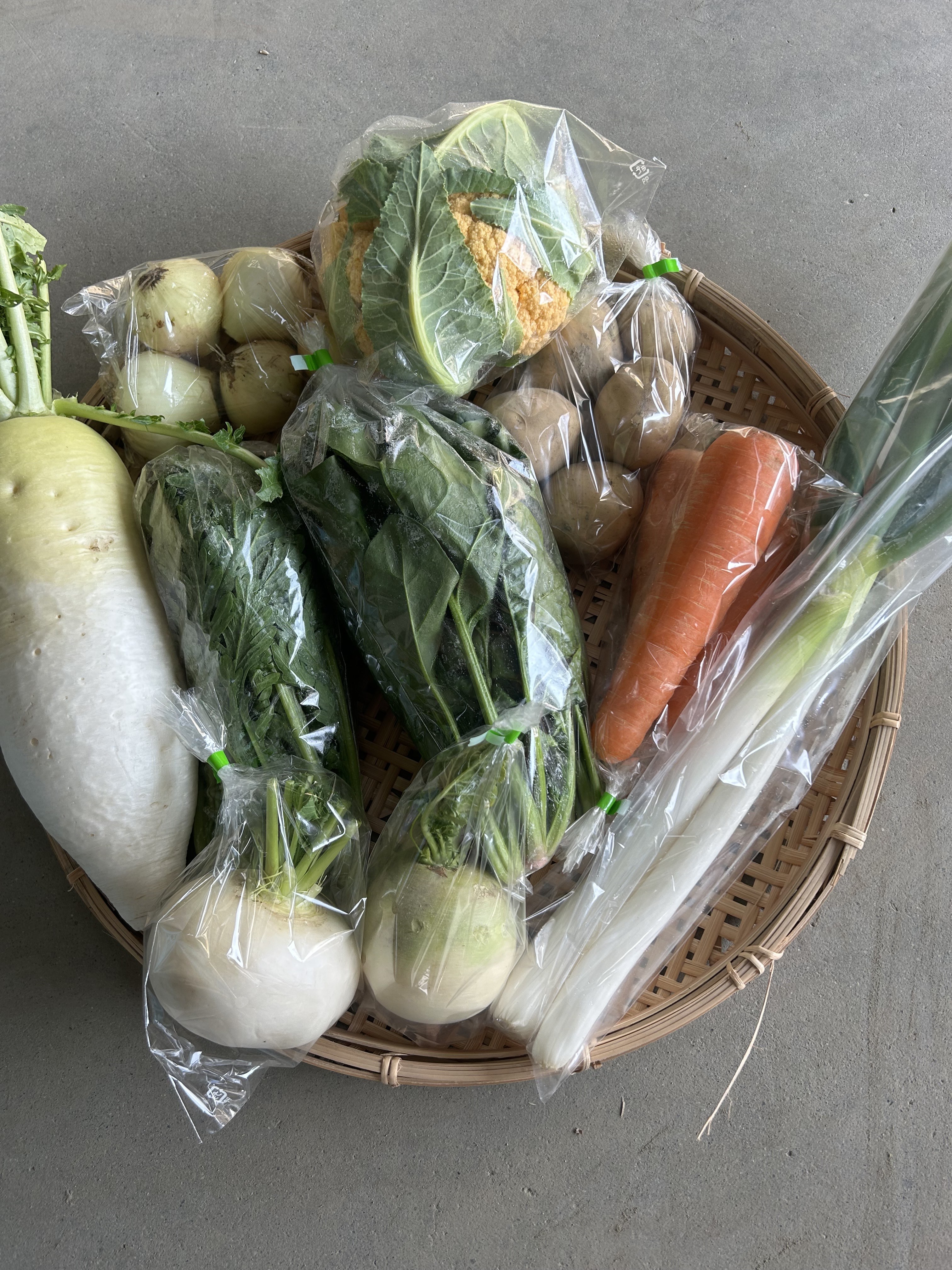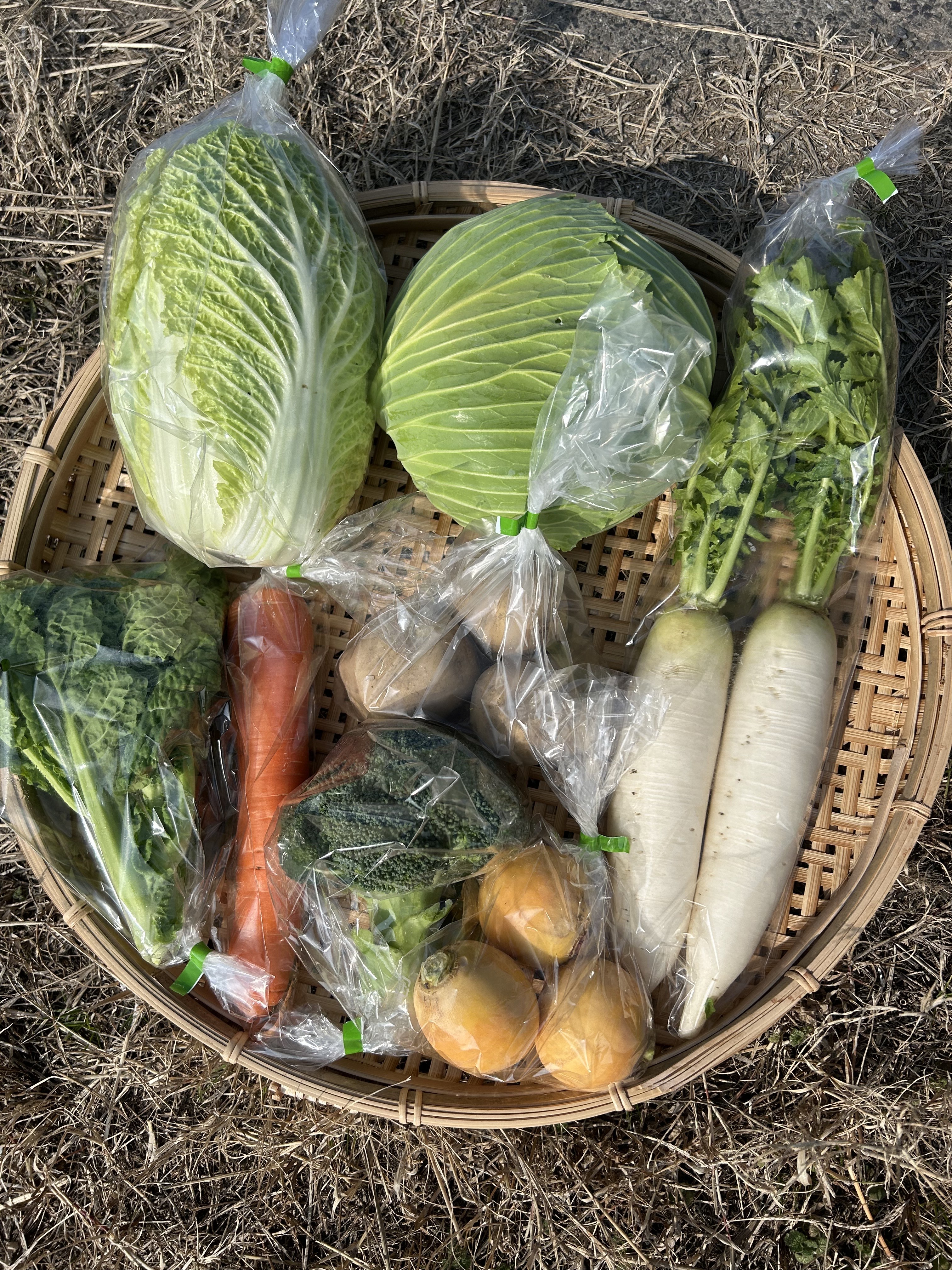 キャベツ、ミニ大根、人参、なばな、ブロッコリー、味黄金かぶ、じゃがいも(だんしゃく)、白菜