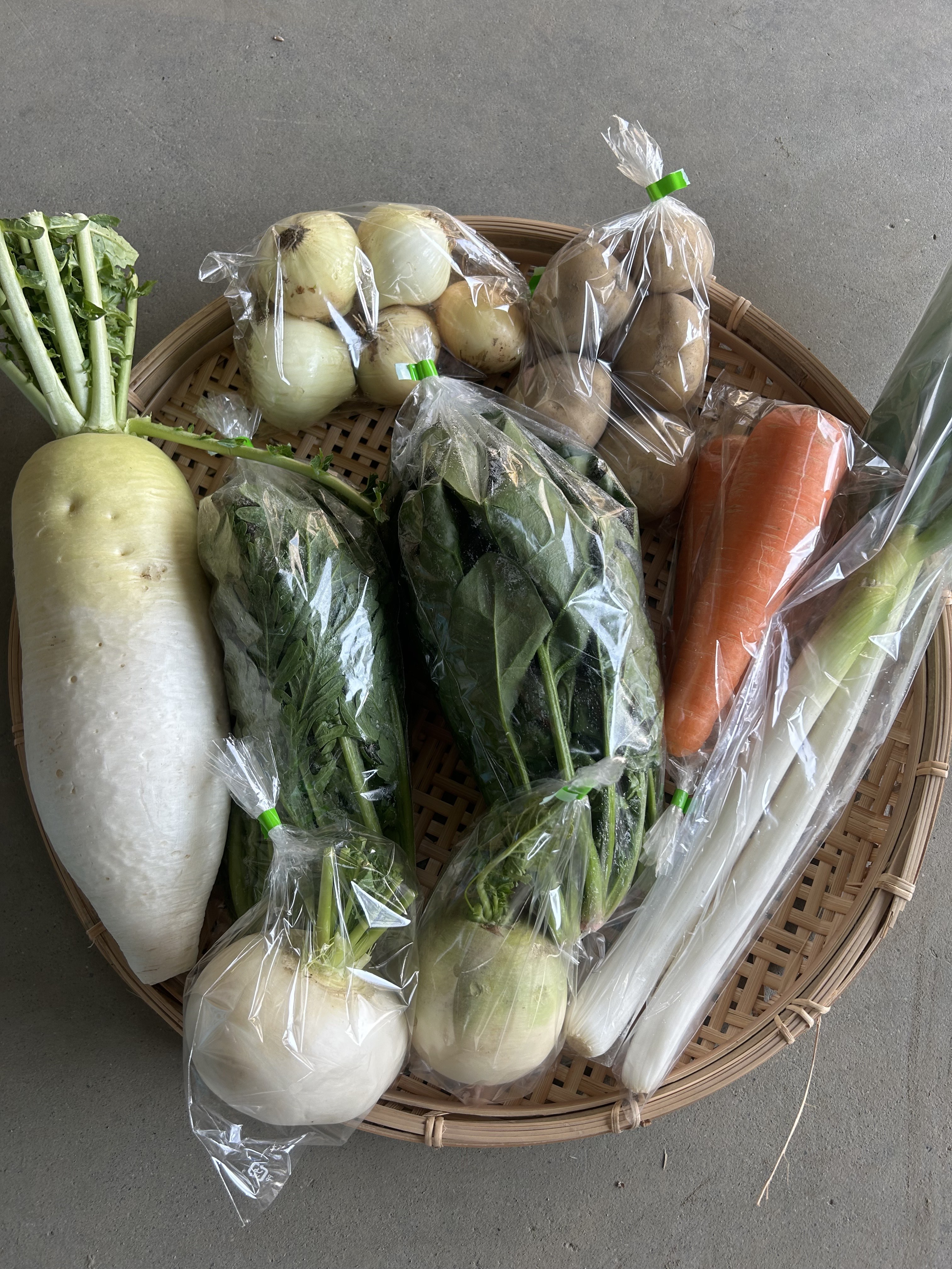 春菊、ほうれん草、新玉ねぎ、白かぶ、大根、紅芯大根、白ネギ、人参、じゃがいも