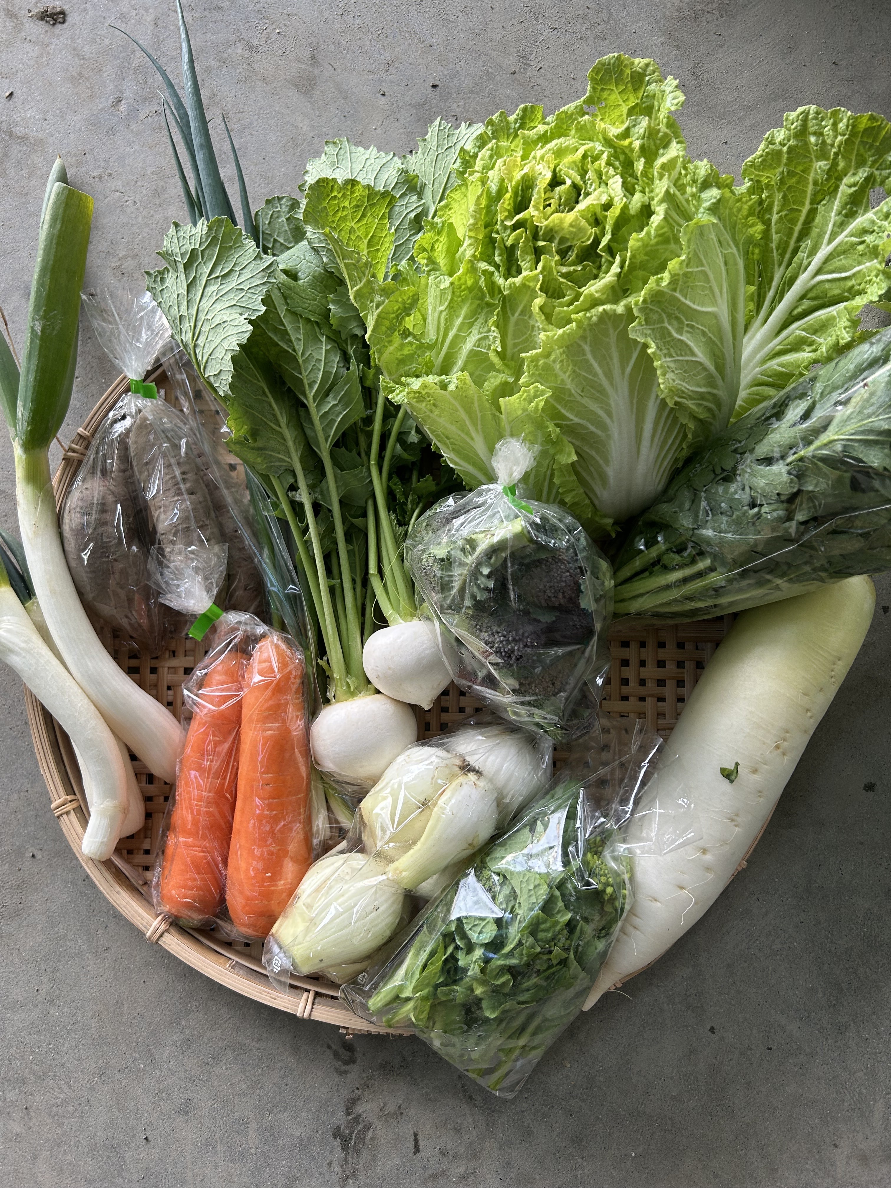 菜花、春菊、新玉ねぎ、小かぶ、青ネギ、ミニ白菜、大根、下仁田ネギ、さつまいも、人参(写真に写っているブロッコリーの脇芽は入りません)