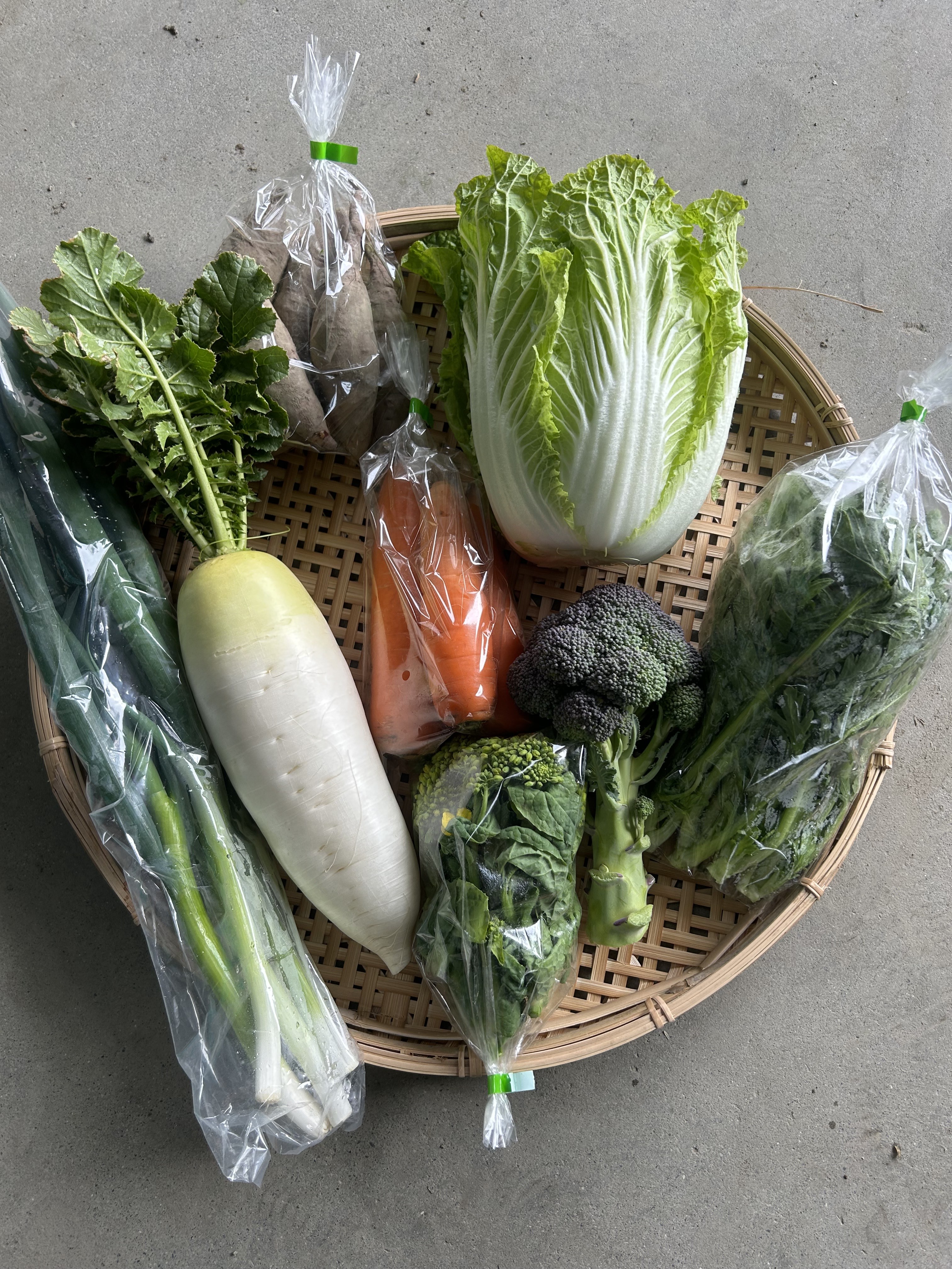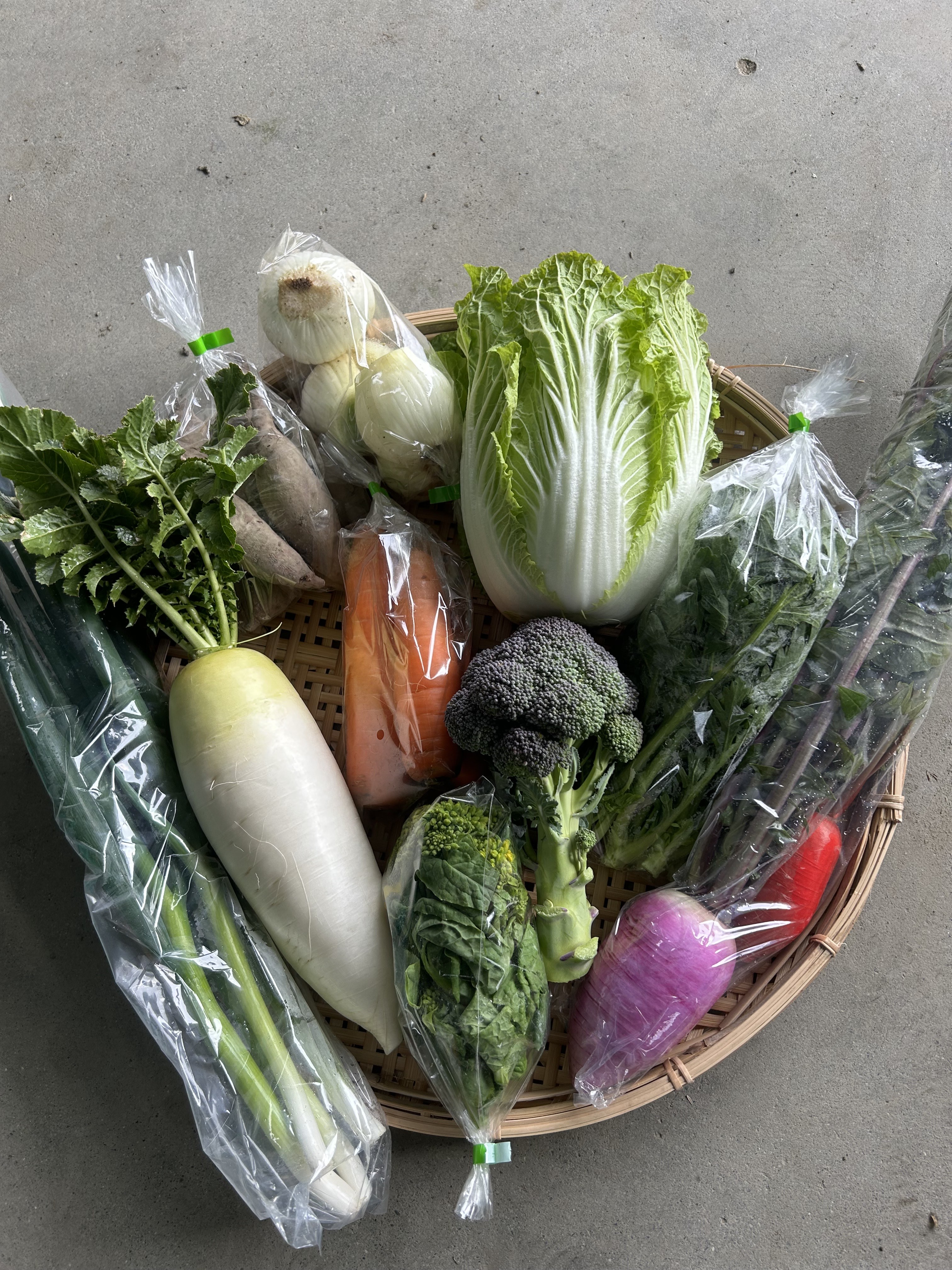 菜花、ブロッコリー、春菊、新玉ねぎ、青ネギ、カラー大根、ミニ白菜、大根、さつまいも(紅はるか)、人参