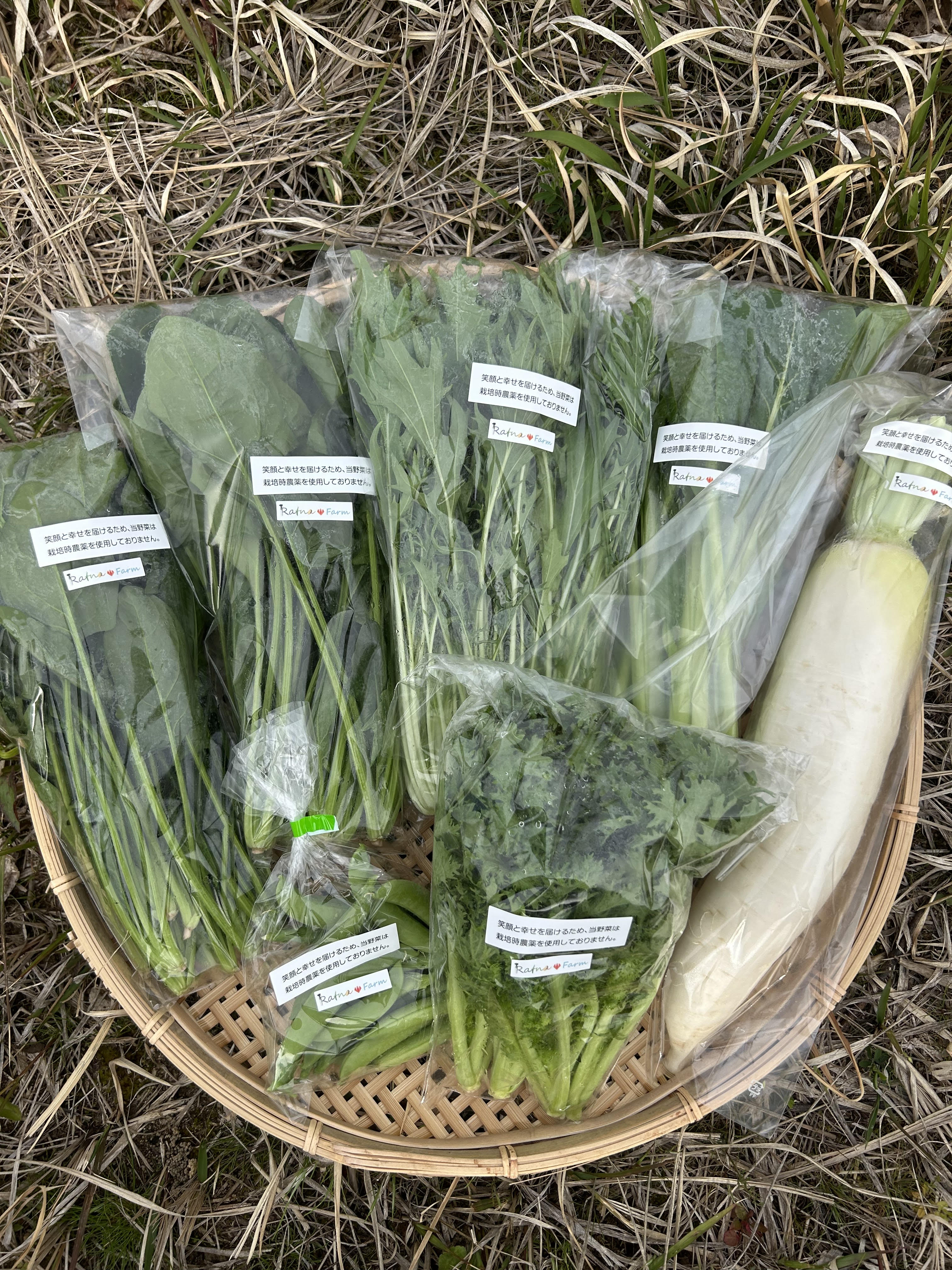 大根、小松菜、水菜、スナップエンドウ、ほうれん草、わさび菜(Mサイズと同じ)
