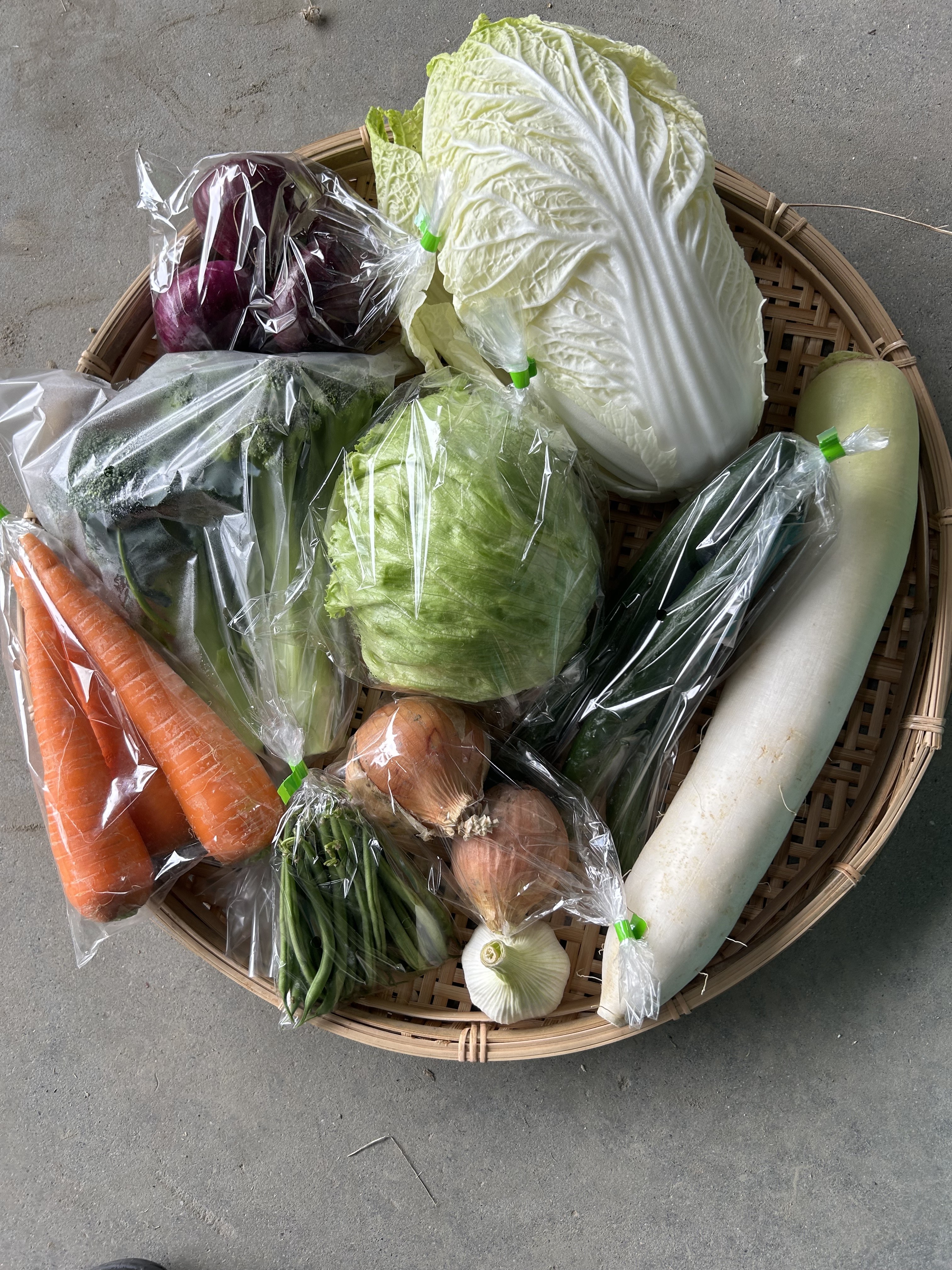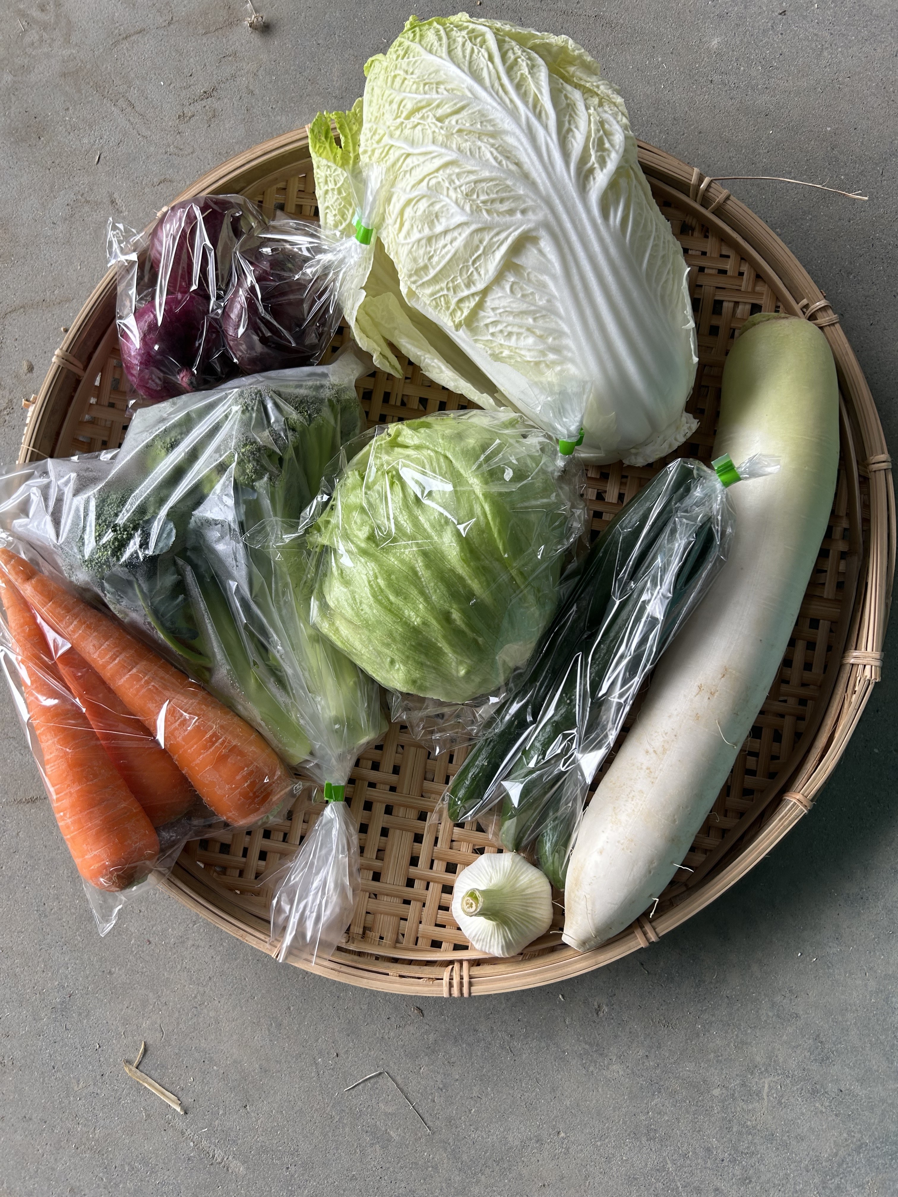 ブロッコリー、レタス、三度豆、白菜、人参、きゅうり、大根、赤玉ねぎ、新ニンニク、玉ねぎ