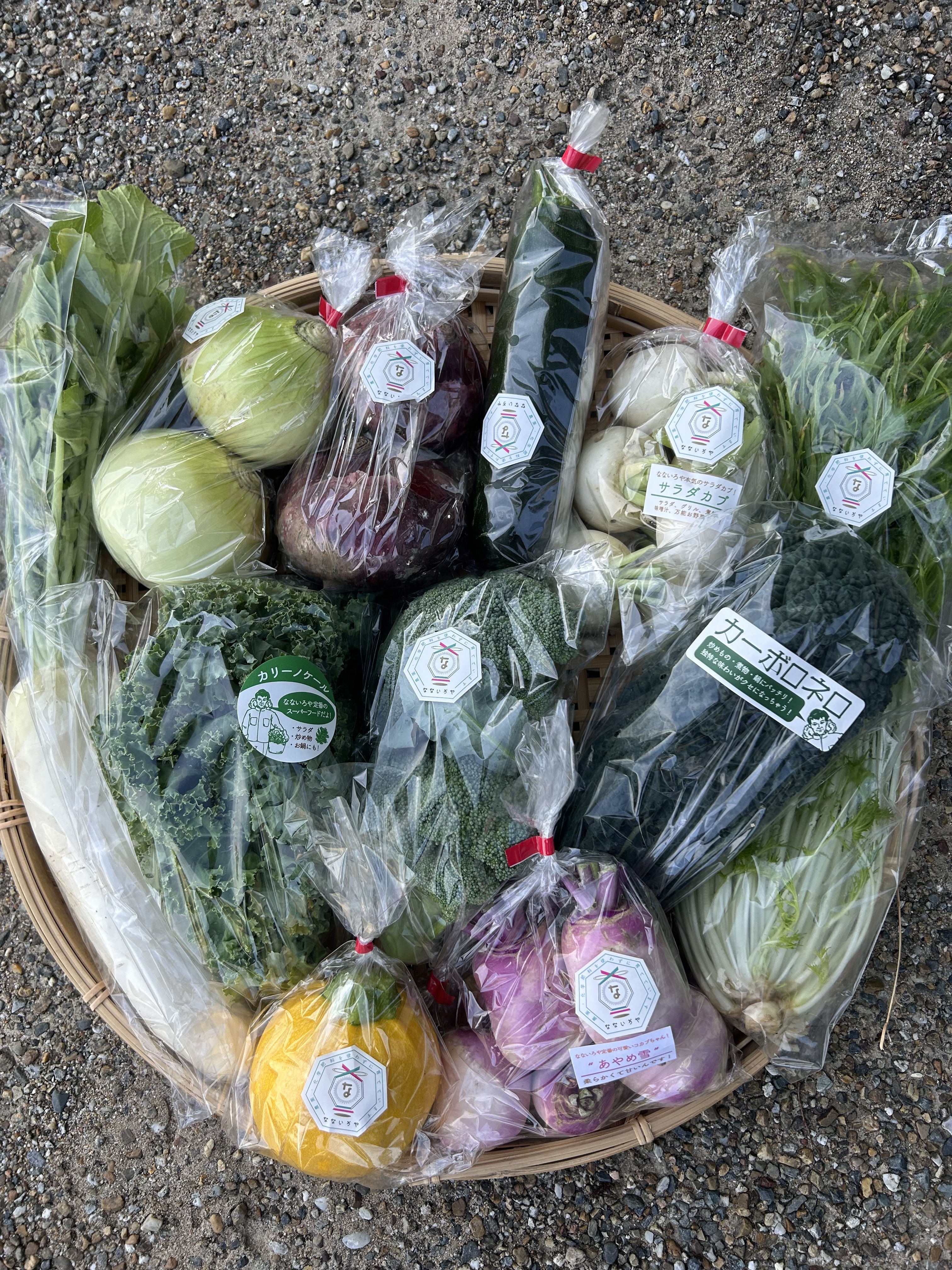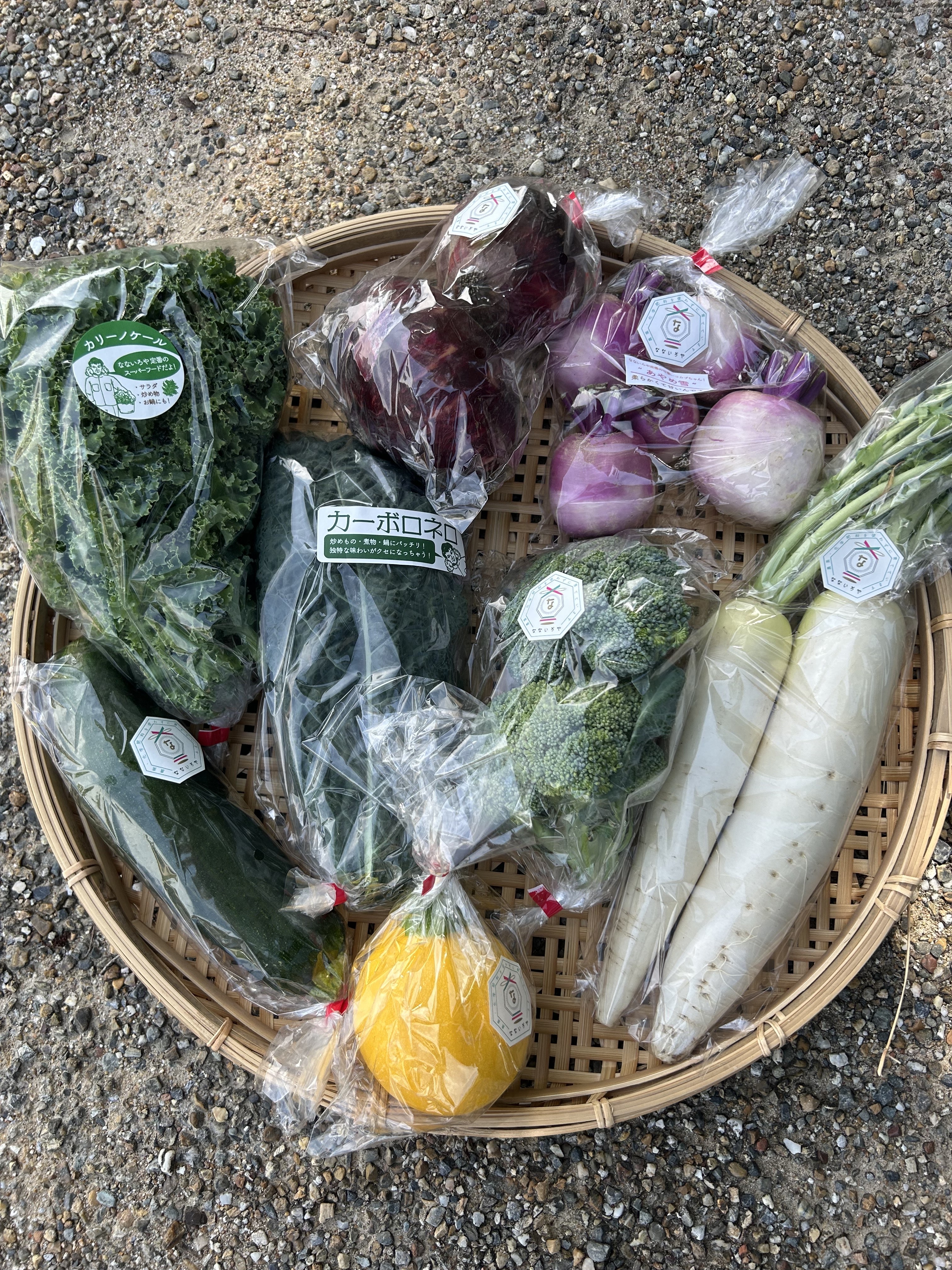 春カリーノケール、カーボロネロ、ブロッコリー、ズッキーニ、丸ズッキーニ、春ダイコン、あやめ雪カブ、赤玉ねぎ