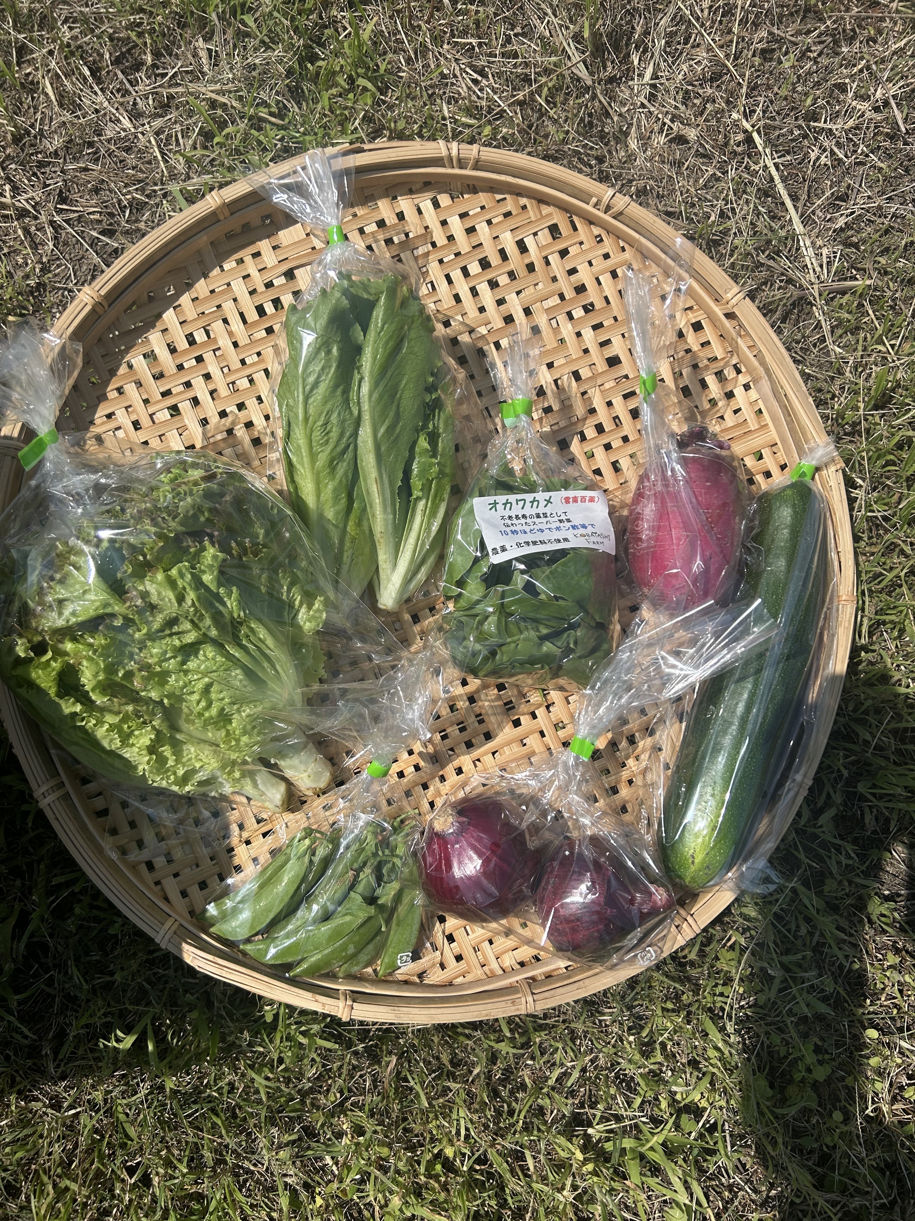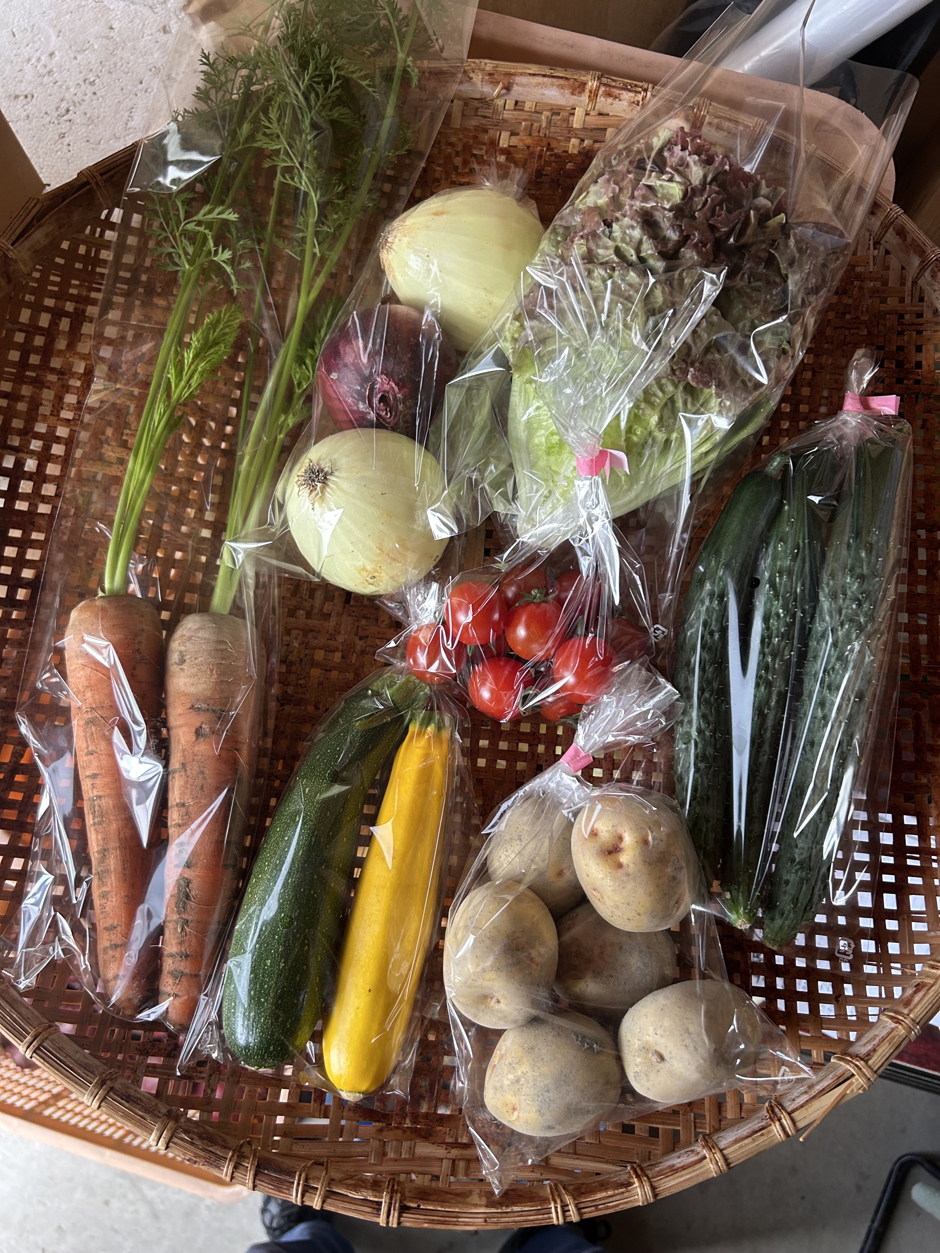 新じゃがいも、新玉ねぎ、あ赤玉ねぎ、人参、ミニトマト、四葉きゅうり、ズッキーニ、サニーレタス