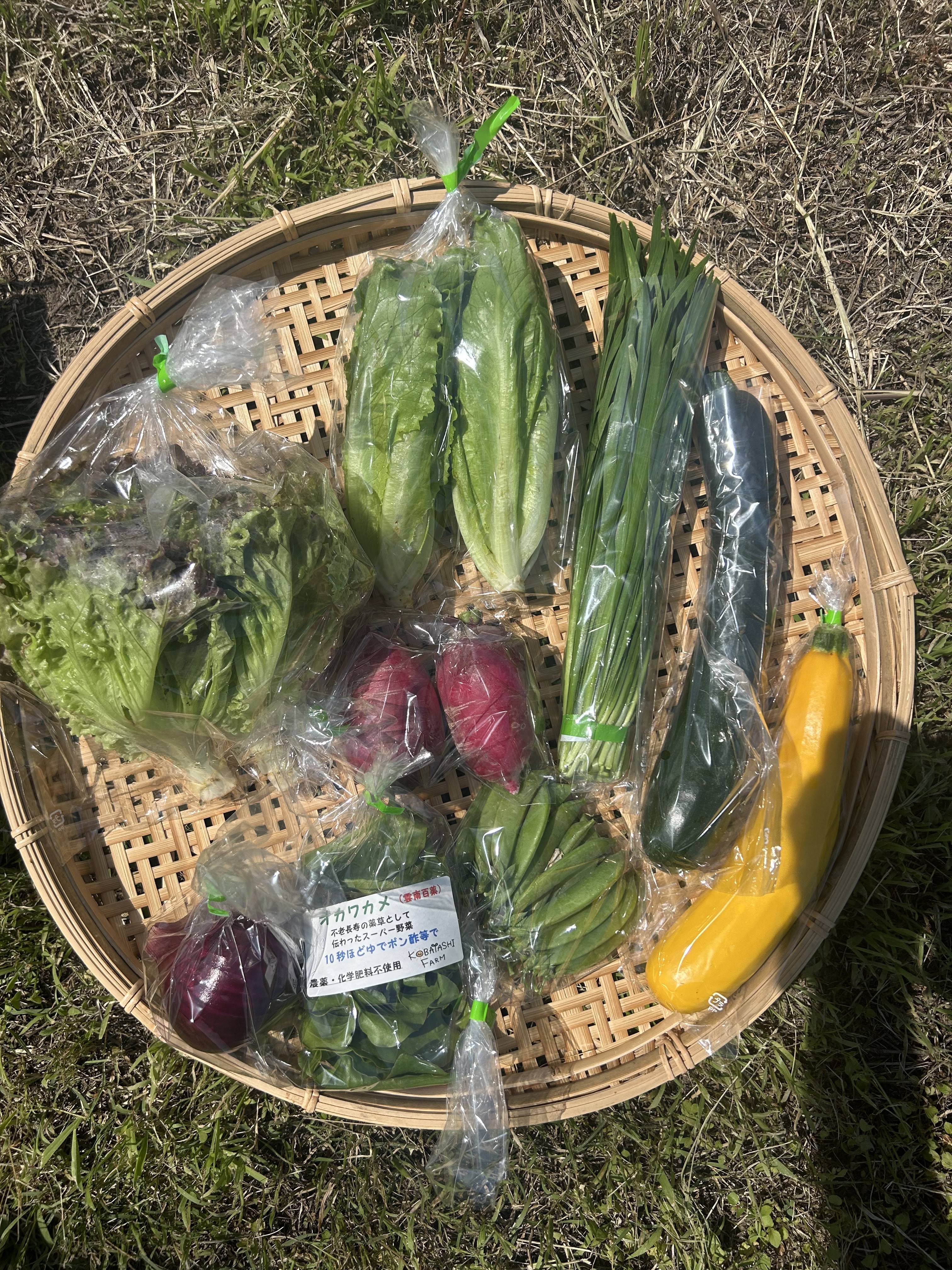 赤玉ねぎ、スナップエンドウ、紅くるり大根、サニーレタス、グリーンリーフ、ニラ、オカワカメ、ズッキーニ