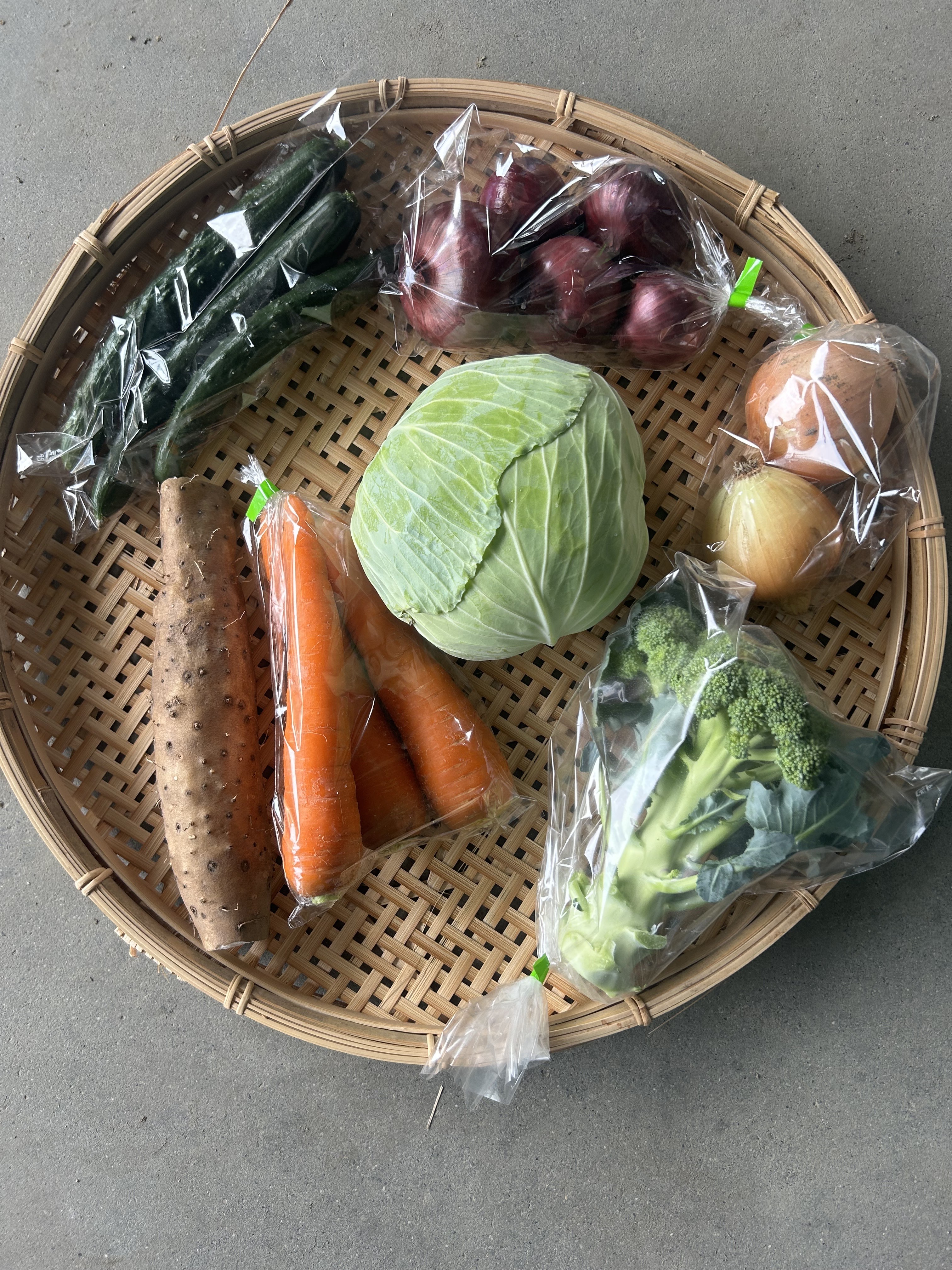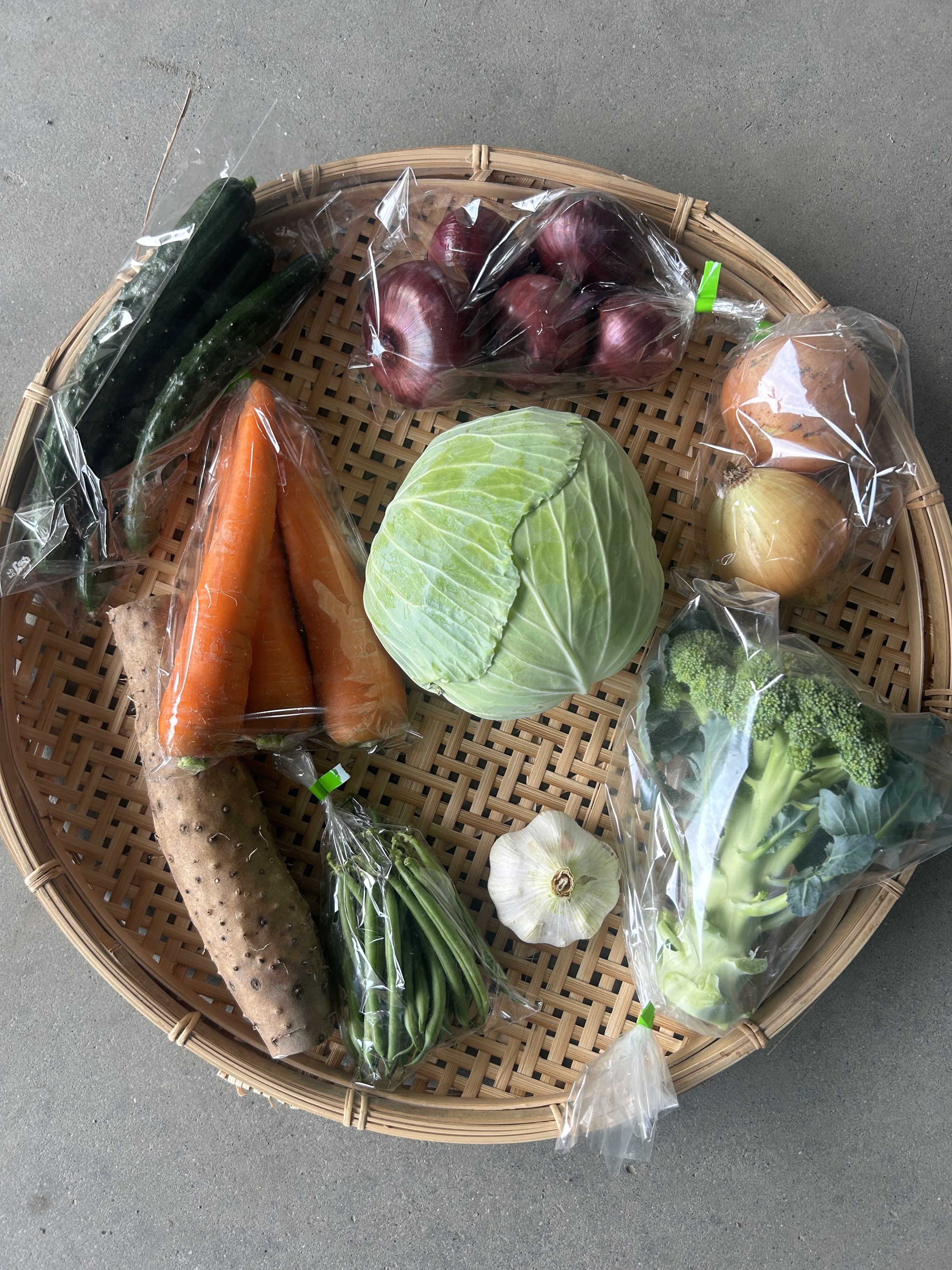 ブロッコリー、三度豆、キャベツ、人参、きゅうり、新ニンニク、赤玉ねぎ、玉ねぎ、長芋