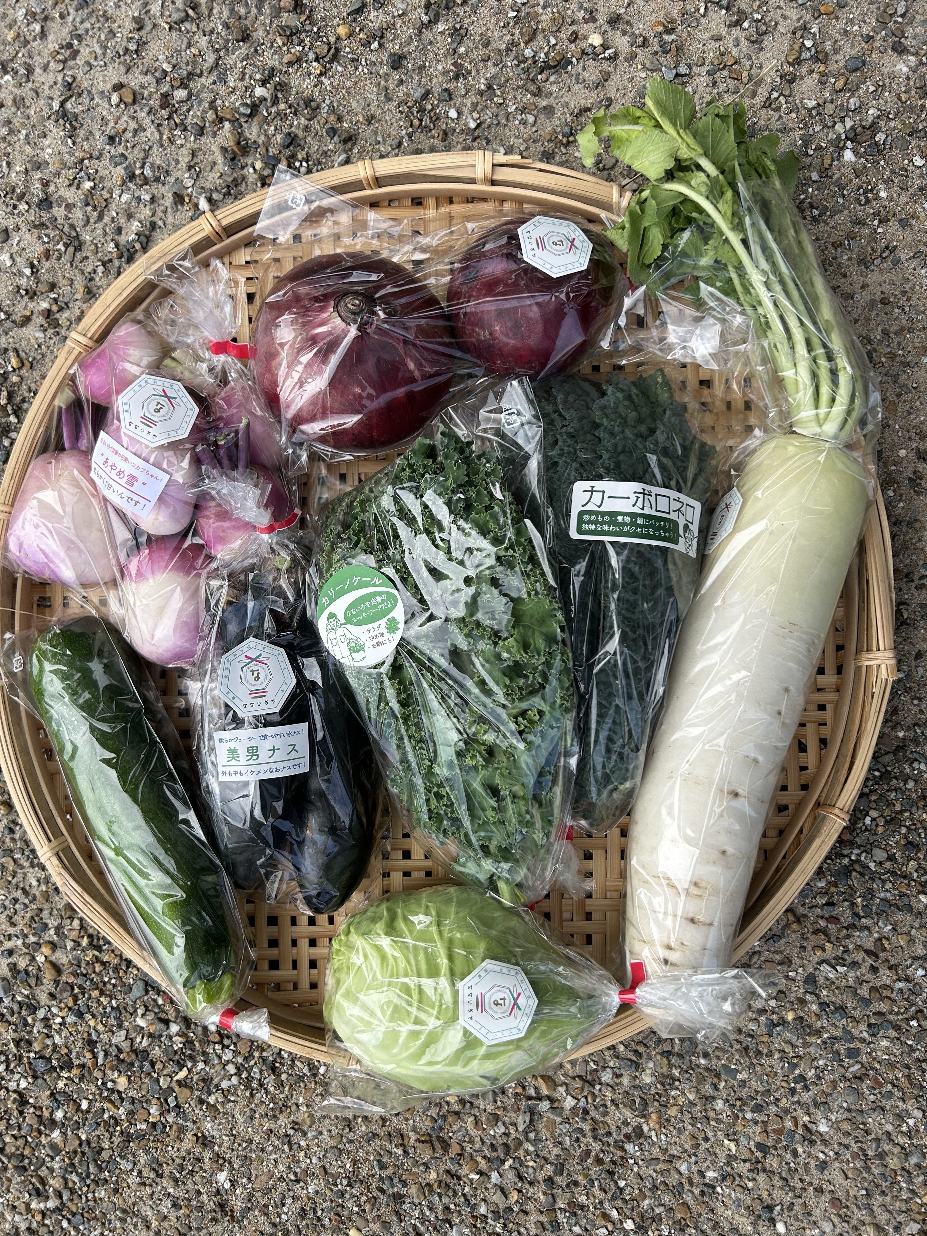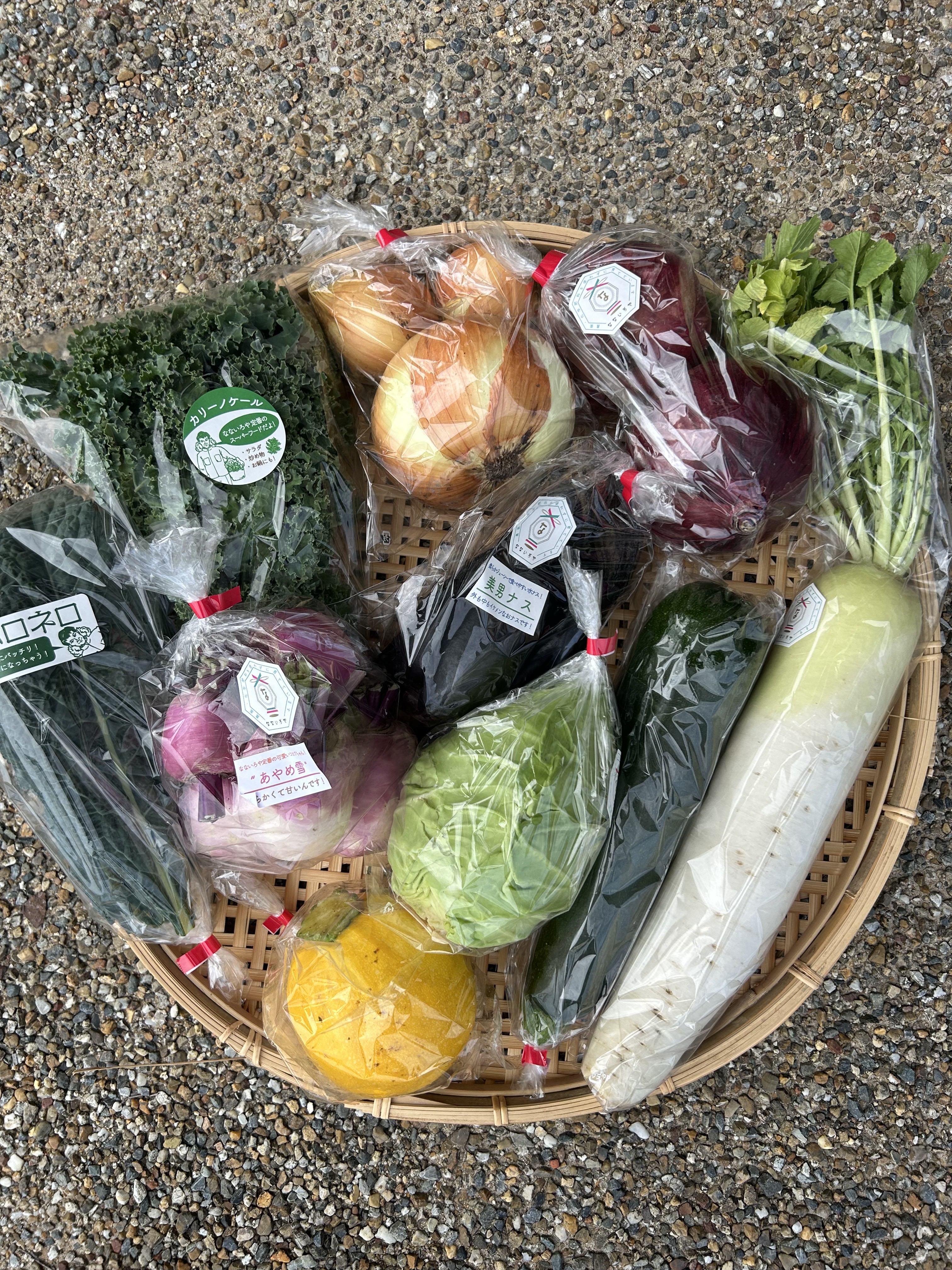 春カリーノケール、カーボロネロ、とんがりキャベツ、美男ナス、丸ズッキーニ、ズッキーニ、春ダイコン、あやめ雪カブ、赤玉ねぎ、新玉ねぎ