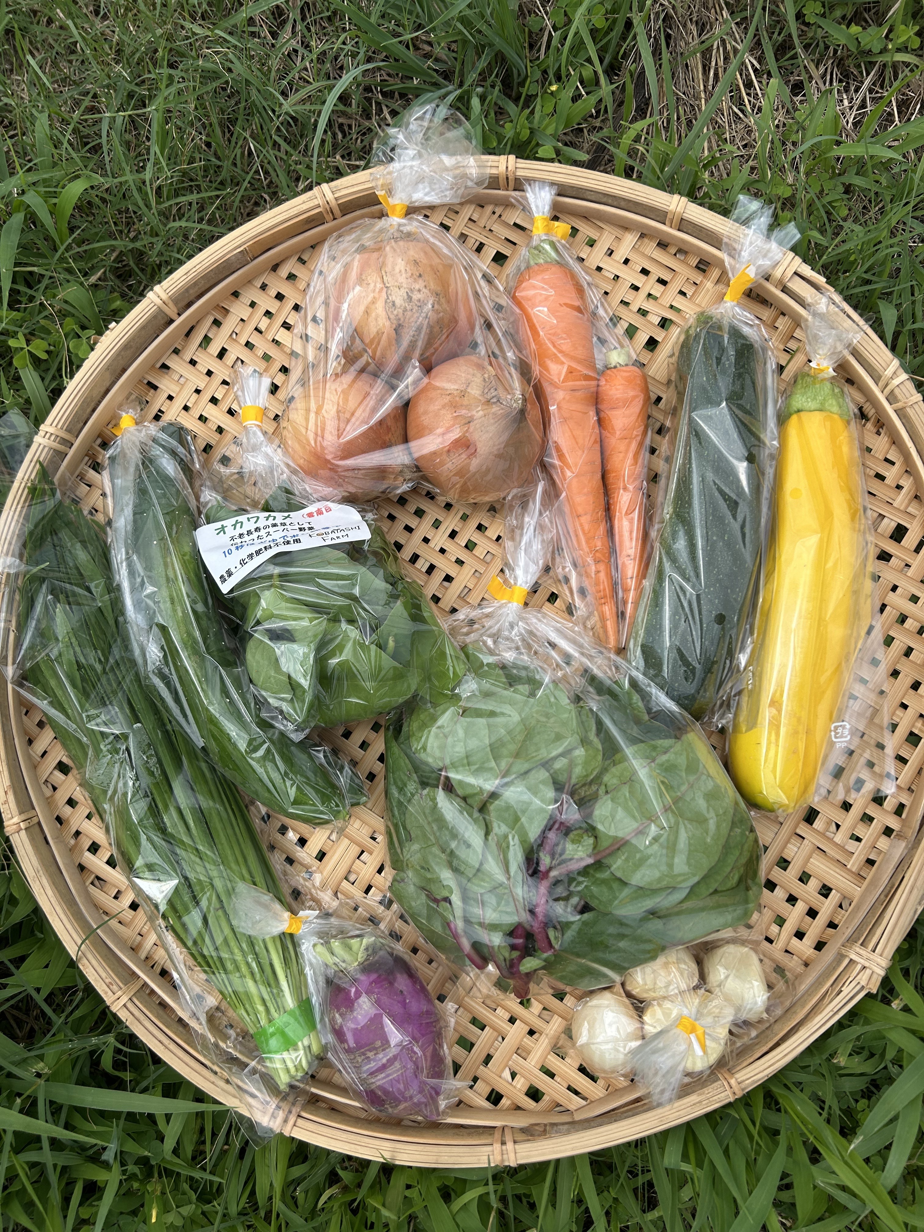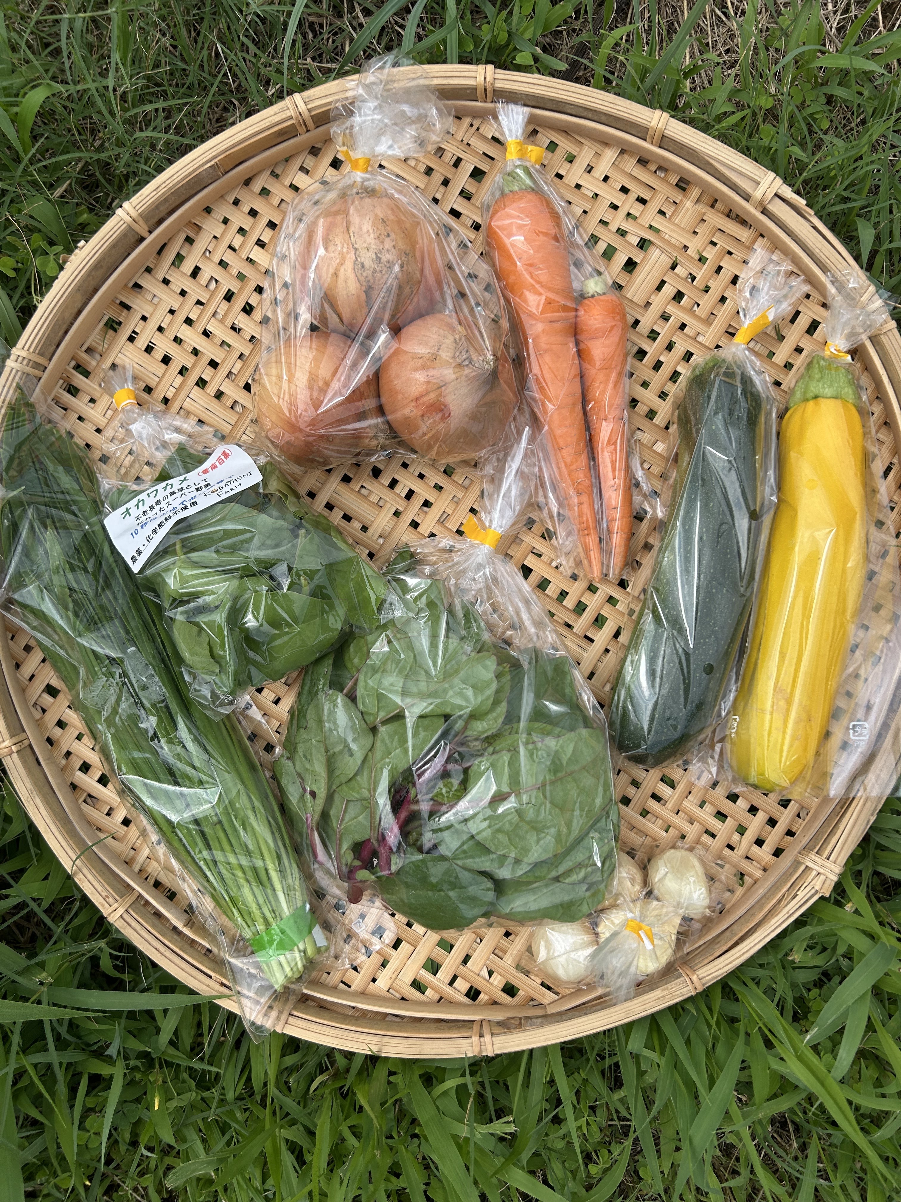 玉ねぎ、ズッキーニ2種、ニラ、オカワカメ、ツルムラサキ、人参、ジャンボニンニク、きゅうり、むらさき大根