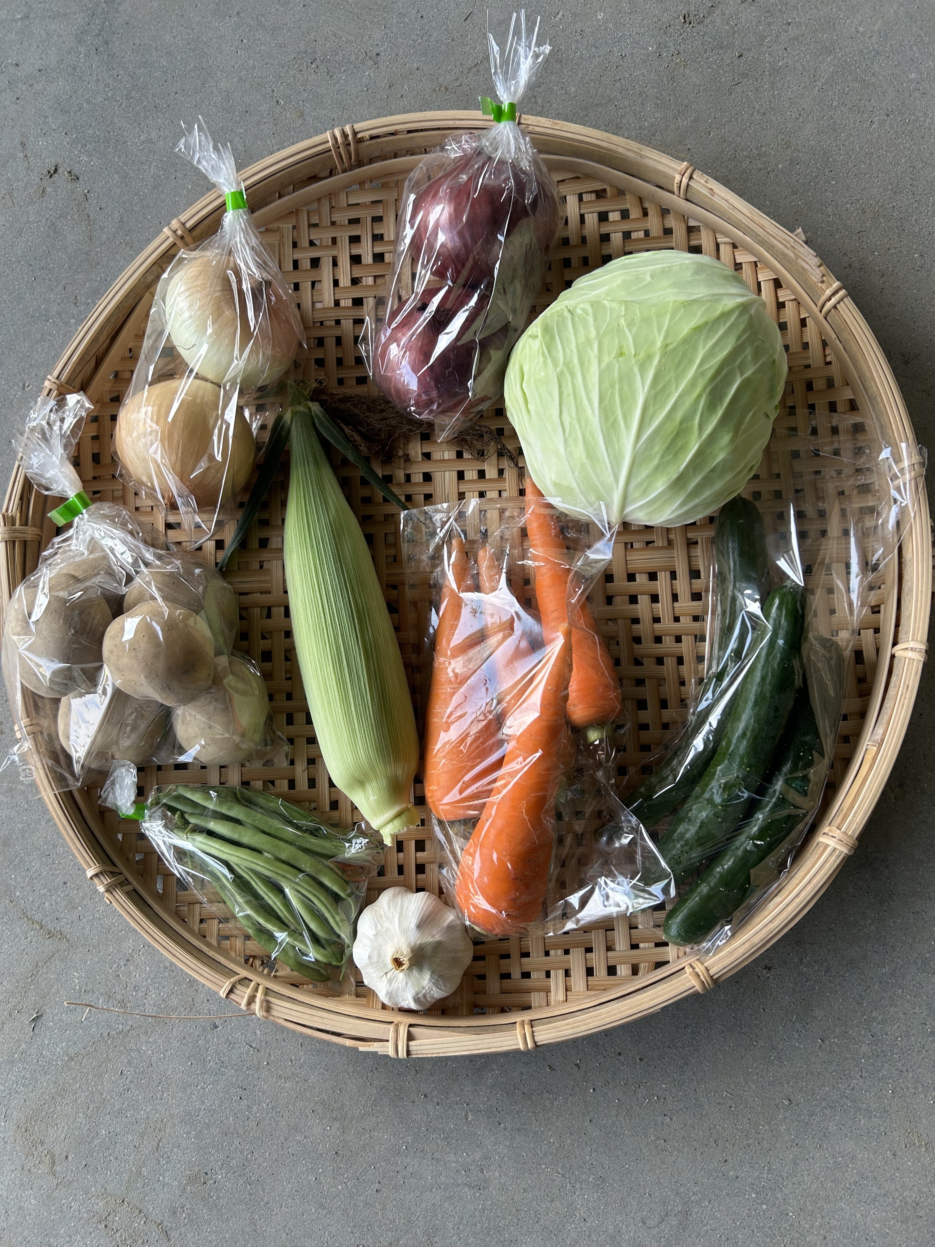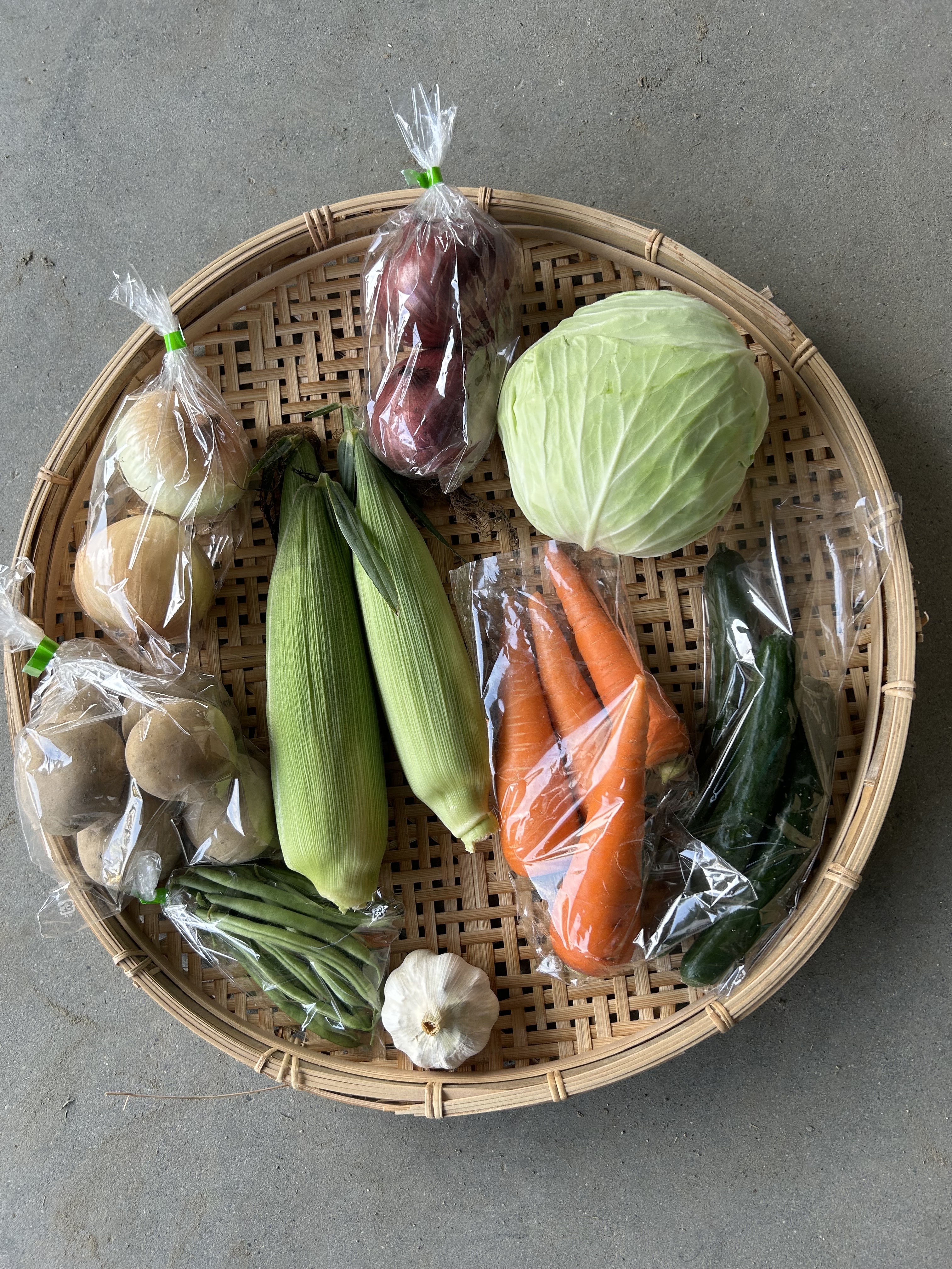 トウモロコシ、三度豆、キャベツ、人参、きゅうり、新ニンニク、赤玉ねぎ、玉ねぎ、じゃがいも