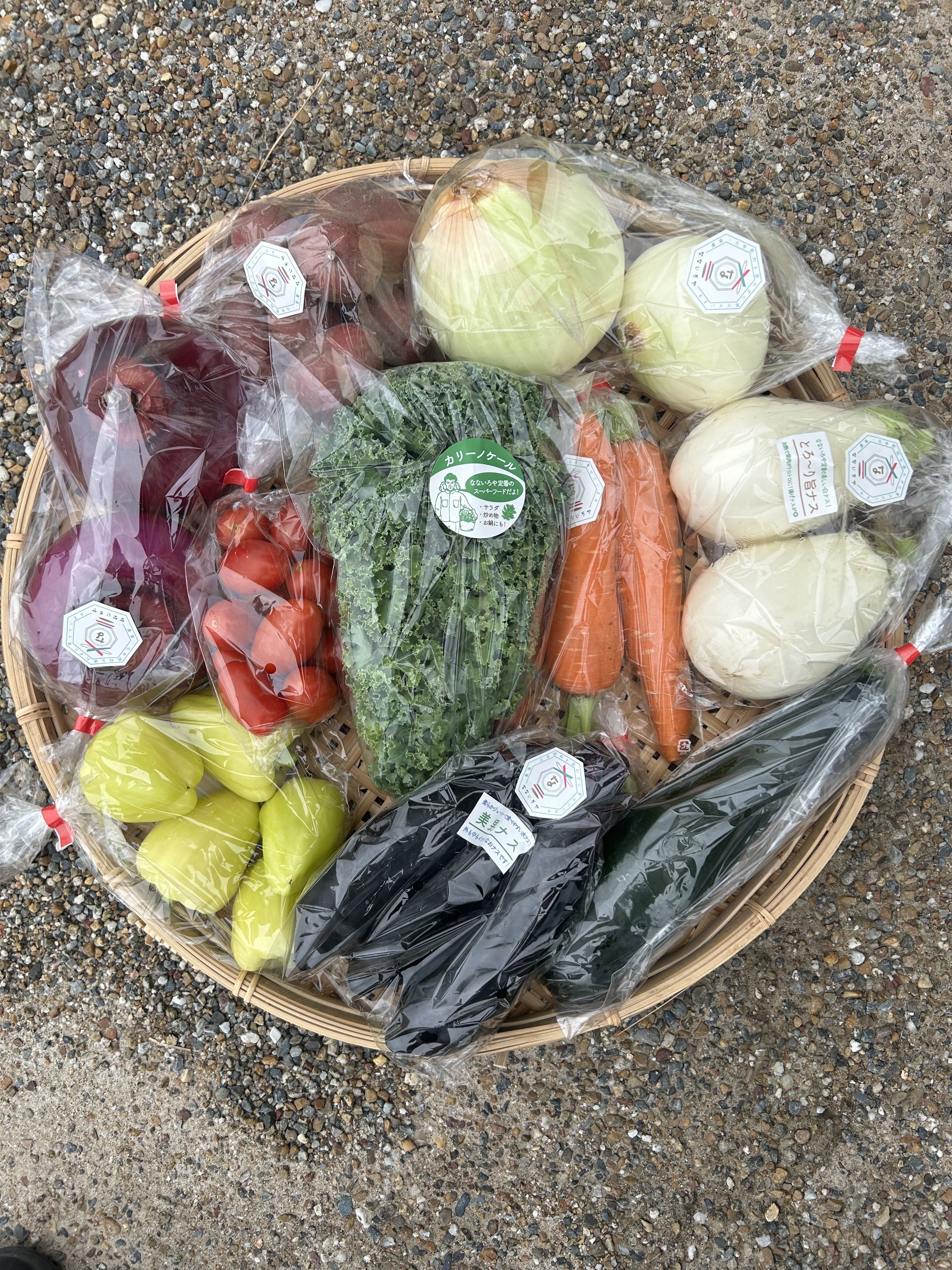 春カリーノケール、クリームピーマン、とろーり旨ナス、美男ナス、ズッキーニ、人参、赤玉ねぎ、新玉ねぎ、じゃがいも(レッドムーン)、アイコミニトマト