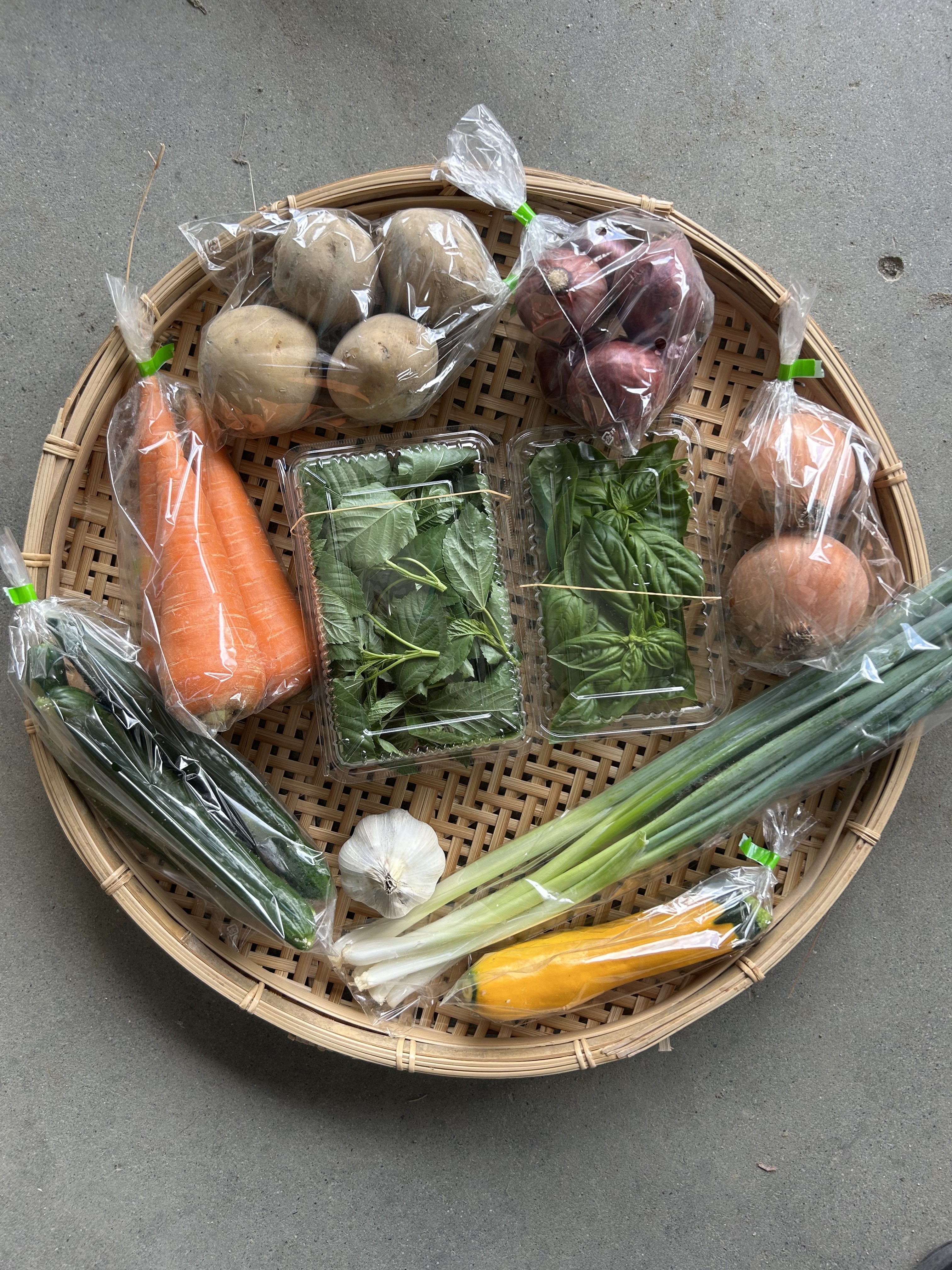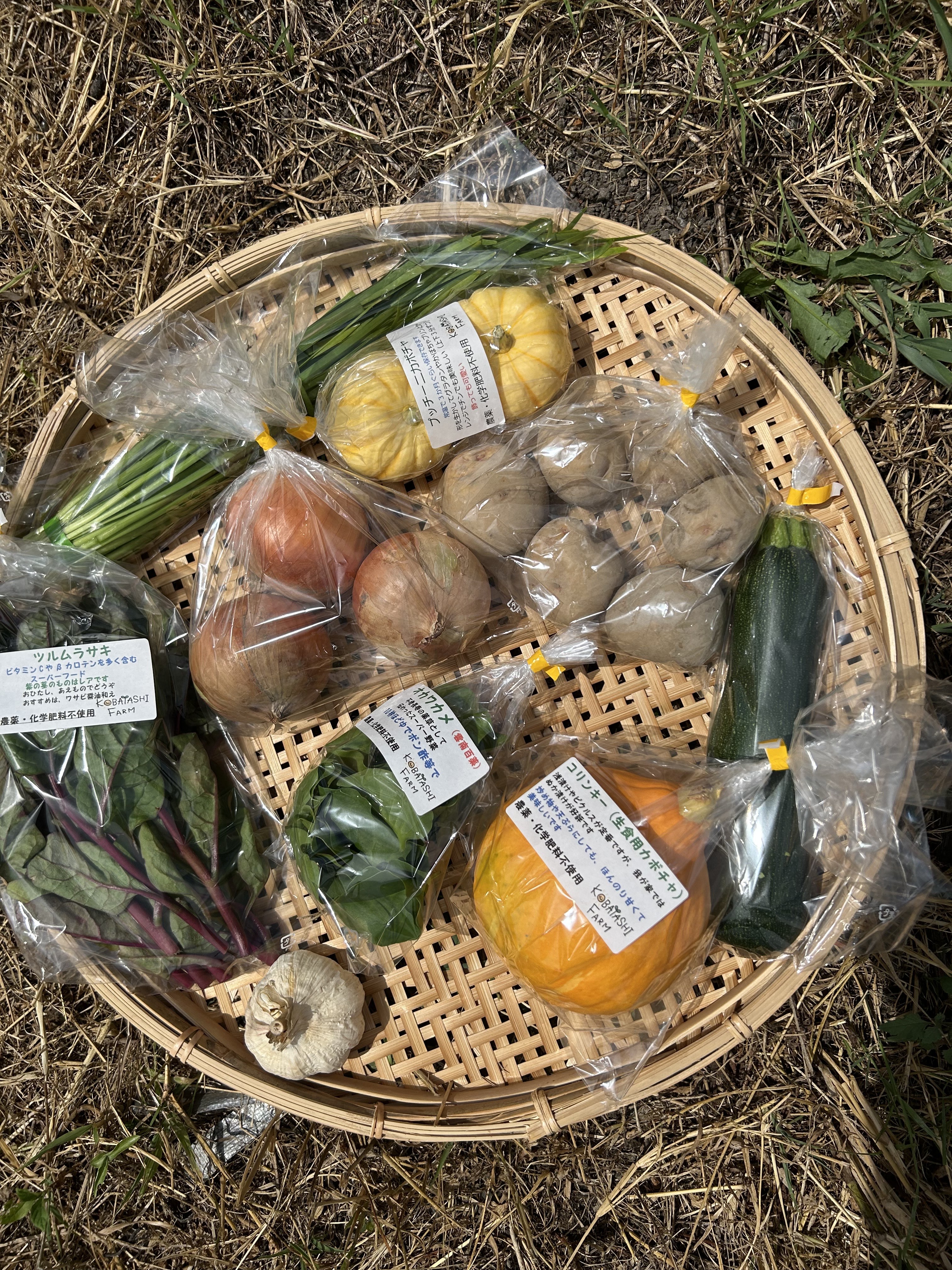 バジル、モロヘイヤ、人参、きゅうり、ズッキーニ、ネギ、ニンニク、赤玉ねぎ、玉ねぎ、じゃがいも(きたあかり)