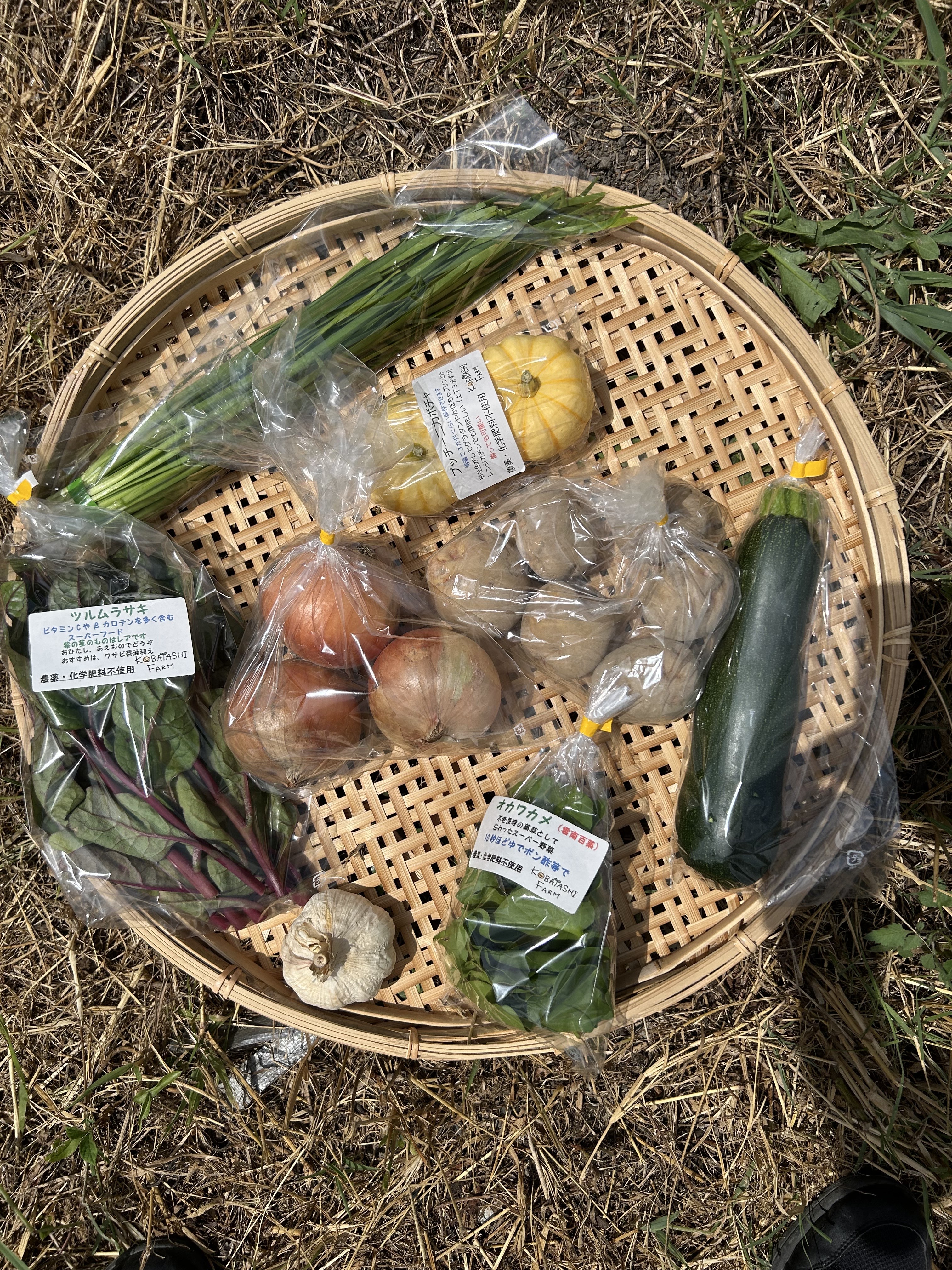 ズッキーニ、コリンキー、ツルムラサキ、オカワカメ、ニラ、玉ねぎ、じゃがいも(きたあかり)、ニンニク、プッチーニ
